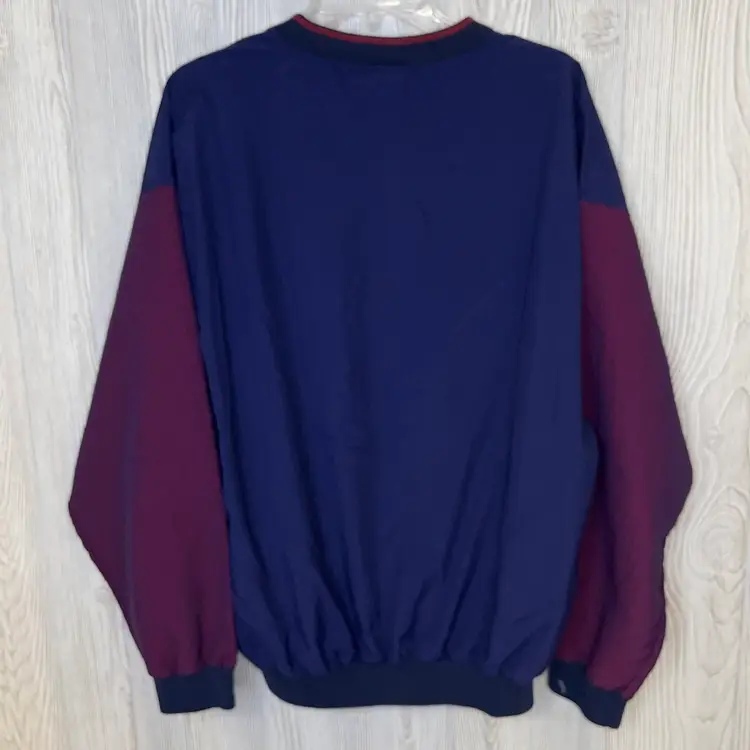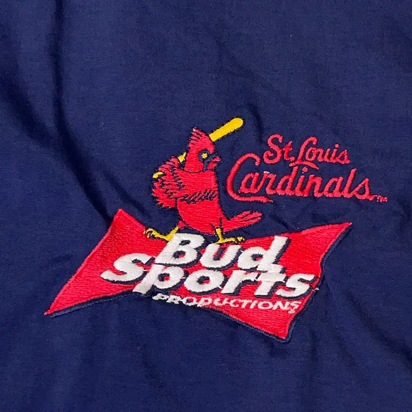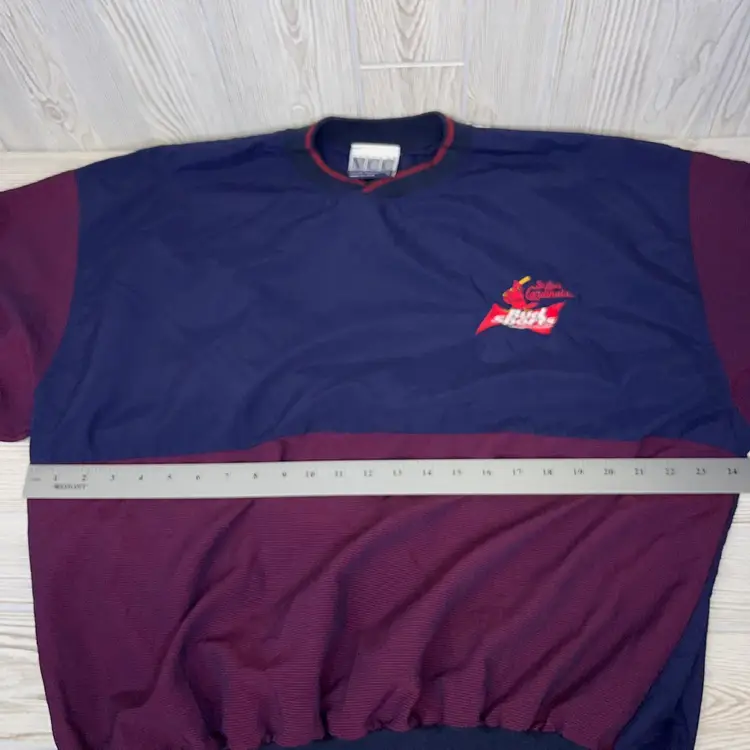 Vintage 80s 90s St Louis Cardinals Bud Sports Productions Pullover Windbreaker Shirt Size Large Made in USA. The pit-to-pit measurement is approximately 24 inches. The length measurement is approximately 26 inches. Measurements taken from the outside front of the garment. The condition is Used. The shirt has some minor wear. There is some white paint on the right sleeve cuff. Otherwise, there are no rips, holes, stains, or tears. See photos for details.