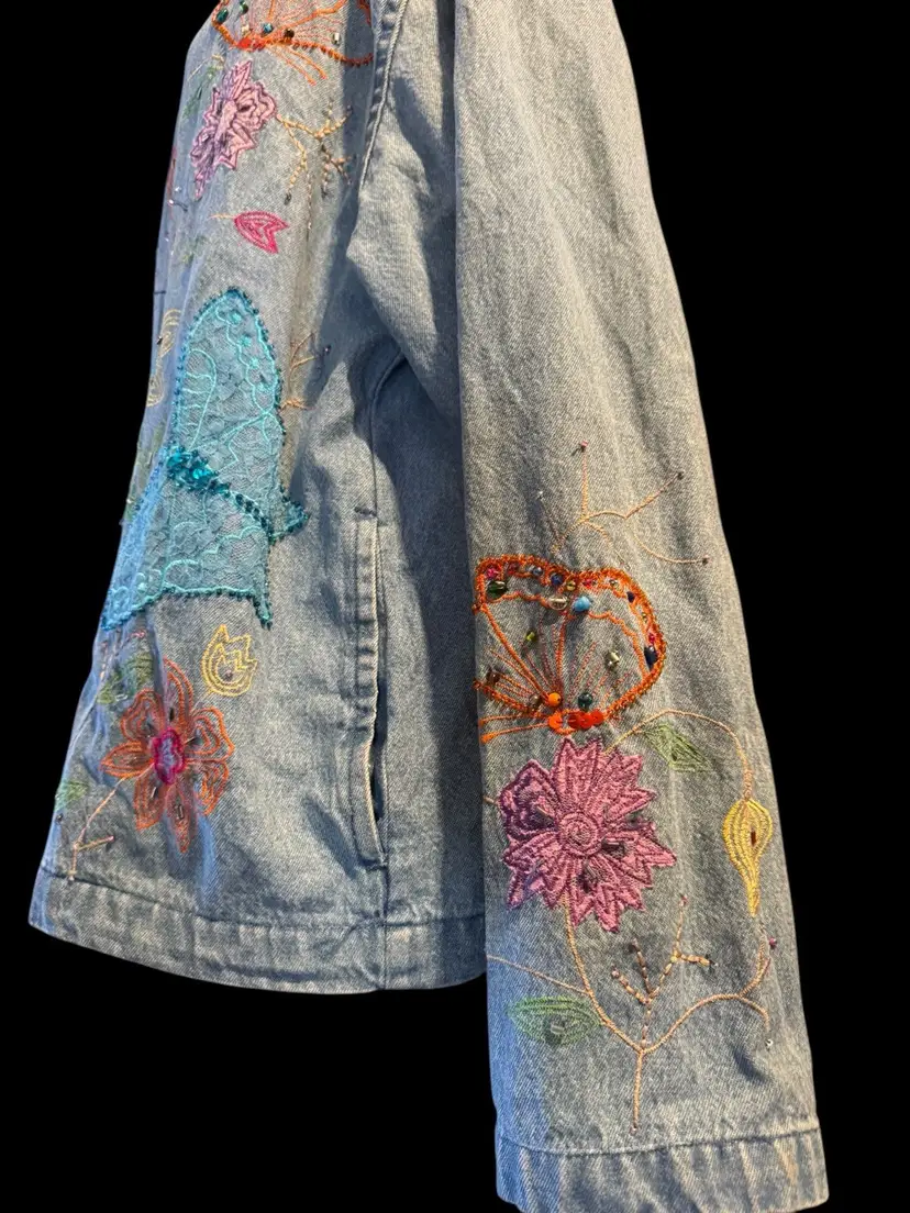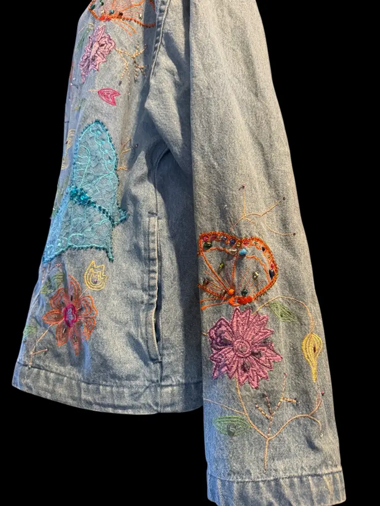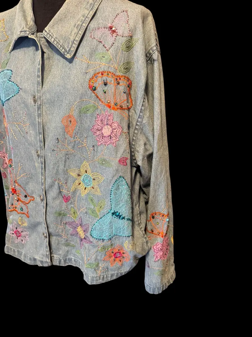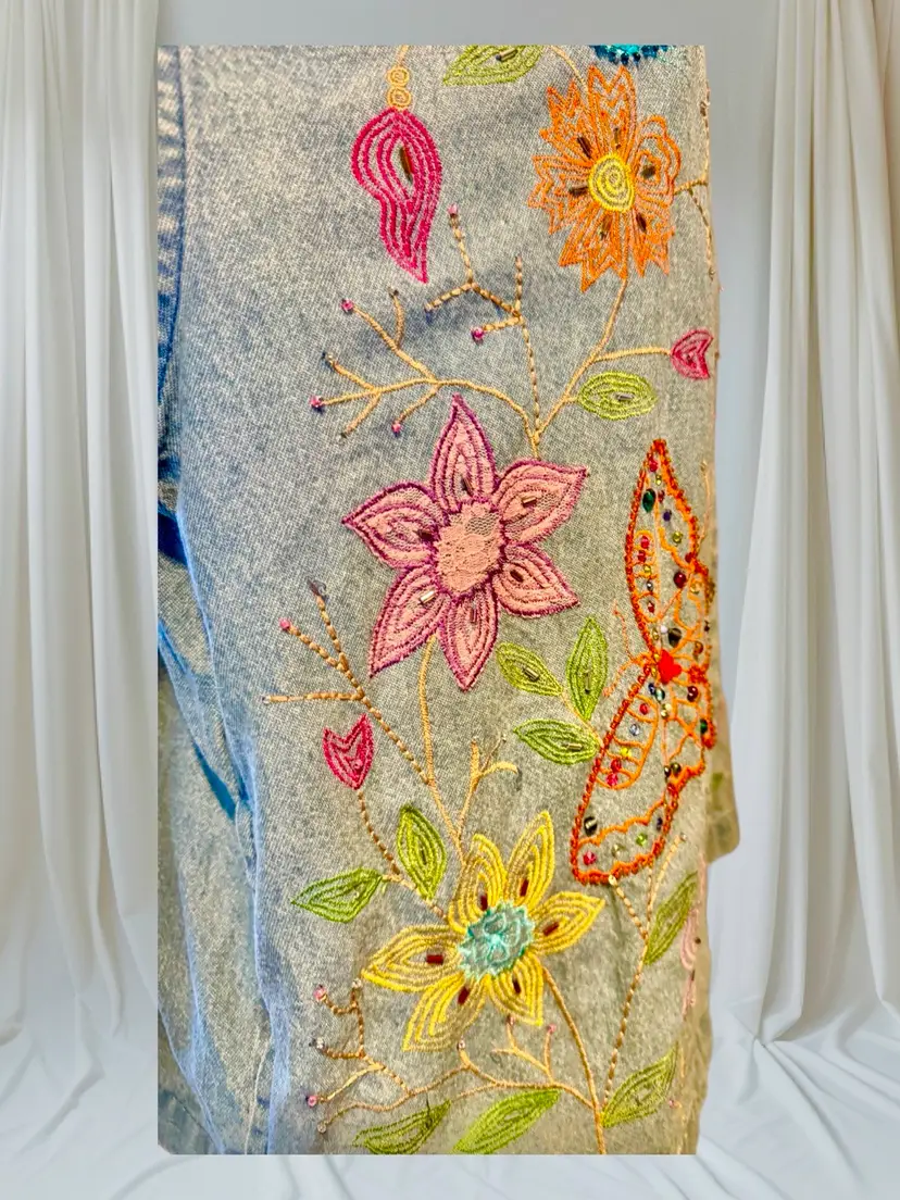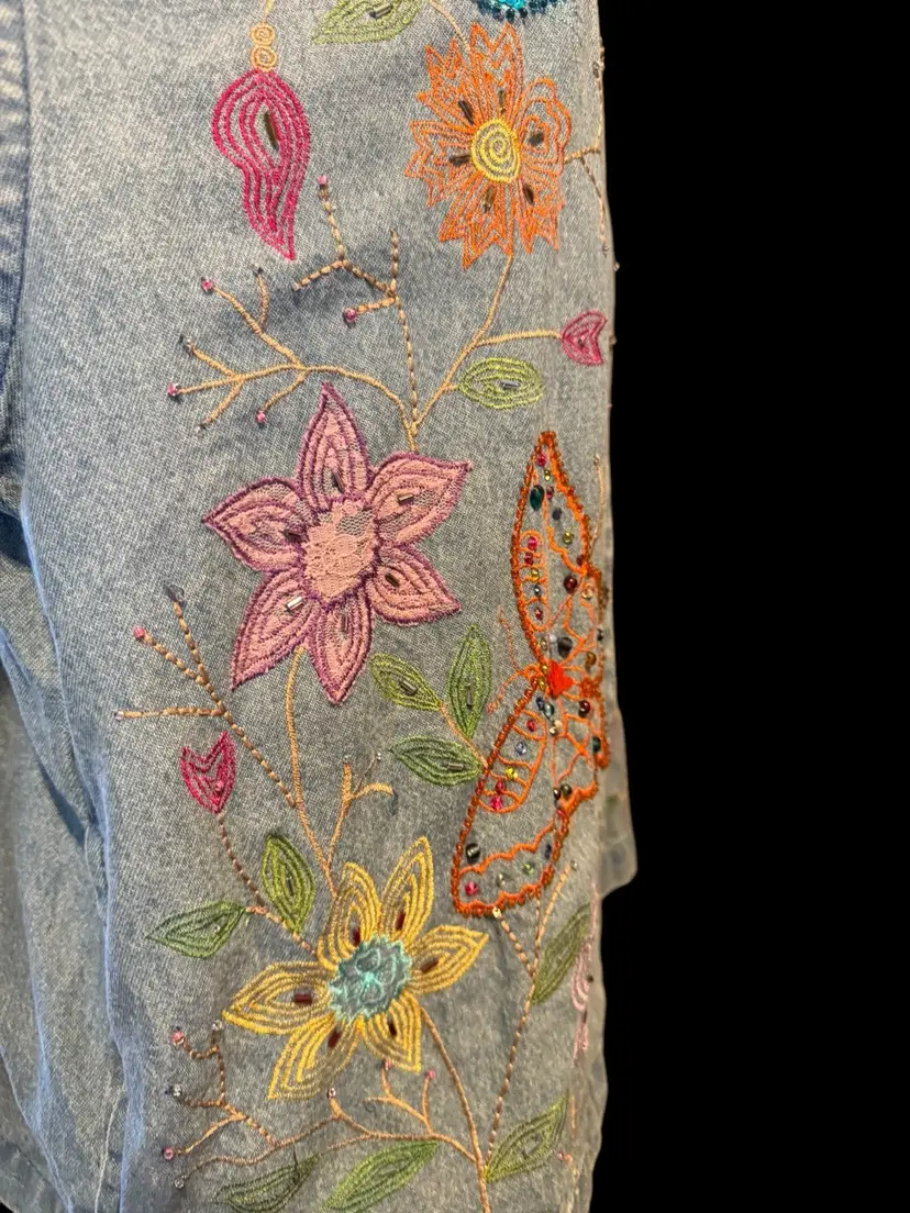 This Tantrums vintage 80’s denim shirt/jacket is completely embroidered front, back and sleeves. It is in a floral pattern with butterflies. All embroidery, beads and sequins are in excellent shape, the jacket also is unique and in excellent condition. Pockets on both sides falls just below the waist .. can be worn open or buttoned .. Machine washable cotton .. measurements 44 bust .. 45 waist 33 in sleeve 24 in long