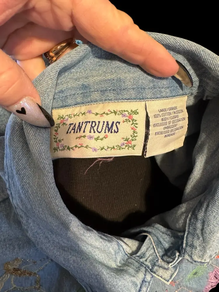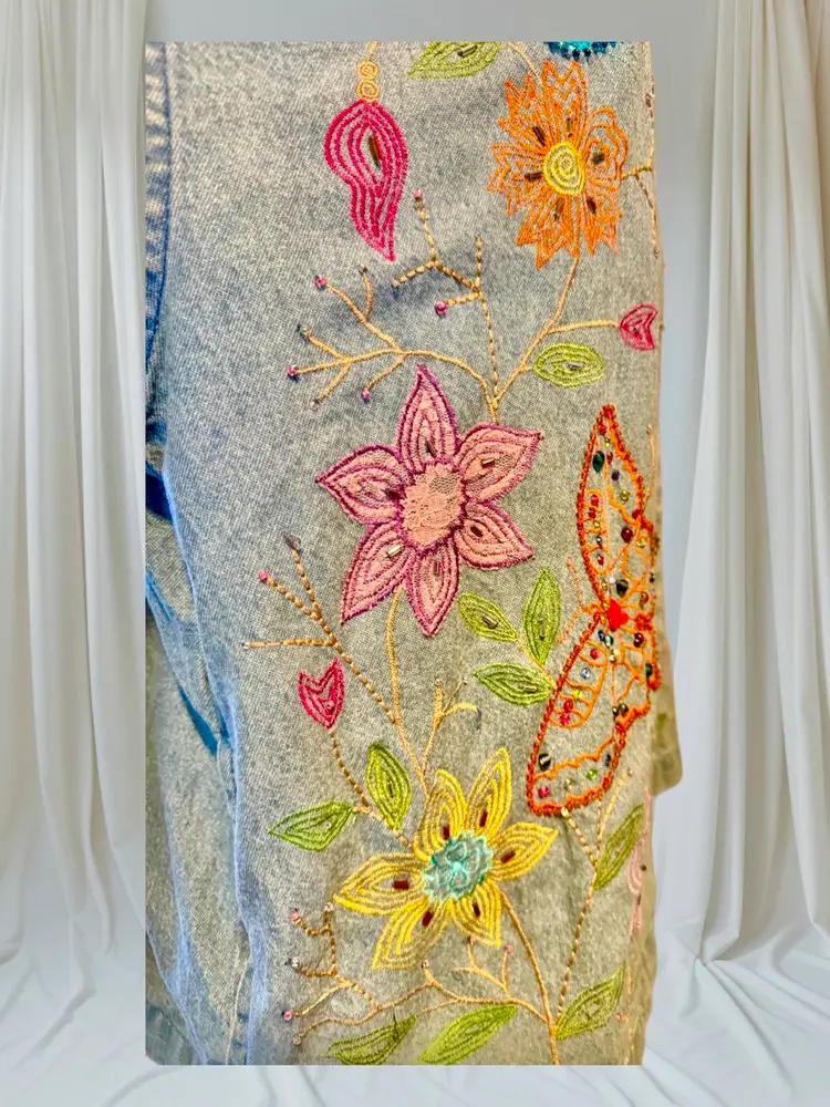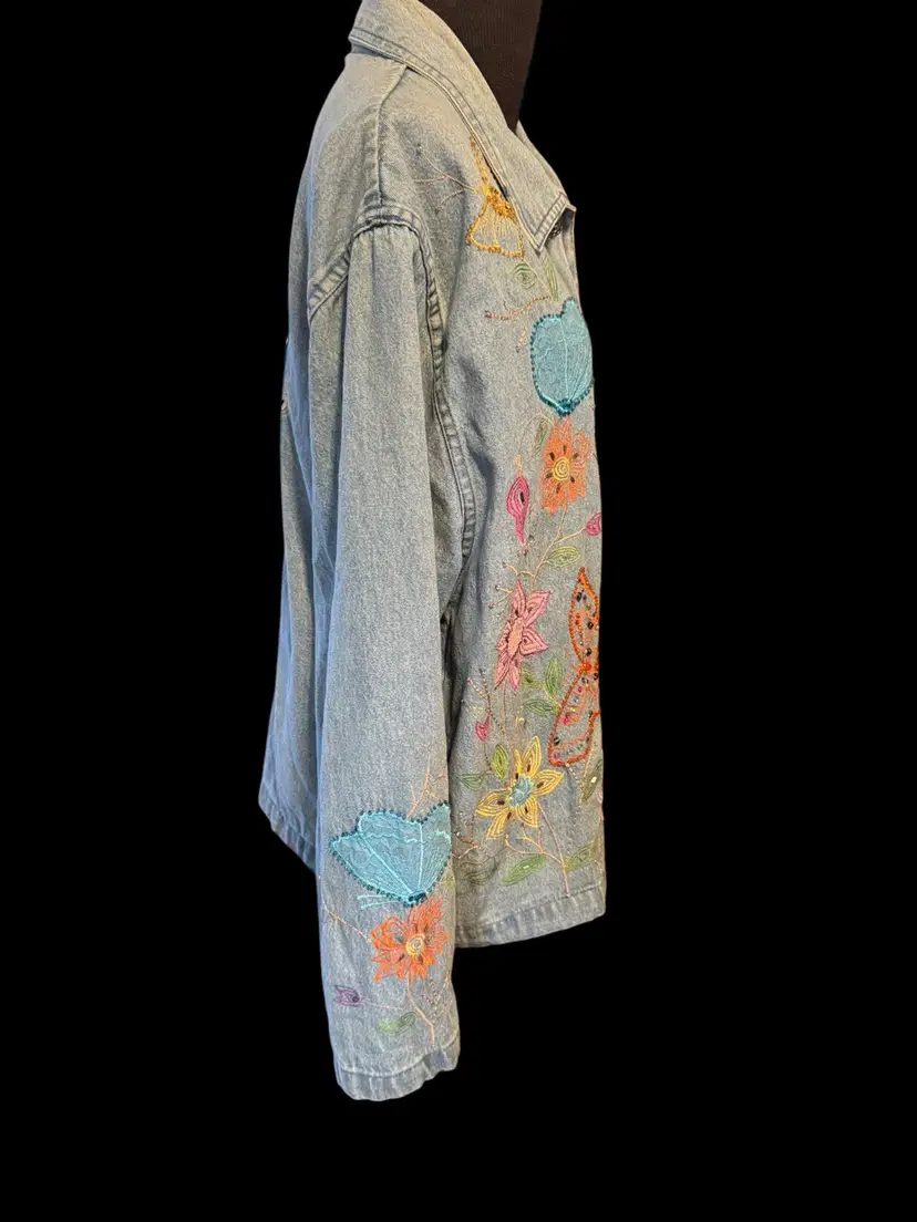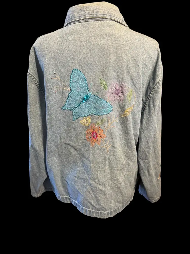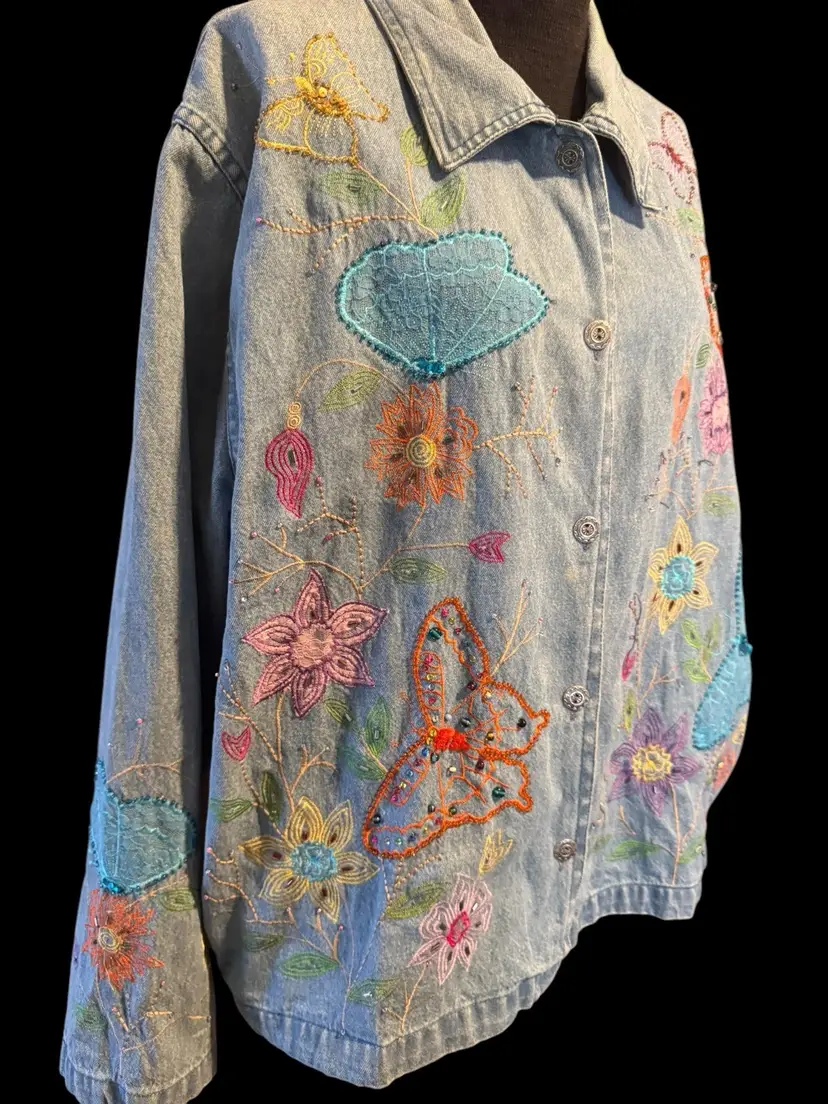 This Tantrums vintage 80’s denim shirt/jacket is completely embroidered front, back and sleeves. It is in a floral pattern with butterflies. All embroidery, beads and sequins are in excellent shape, the jacket also is unique and in excellent condition. Pockets on both sides falls just below the waist .. can be worn open or buttoned .. Machine washable cotton .. measurements 44 bust .. 45 waist 33 in sleeve 24 in long