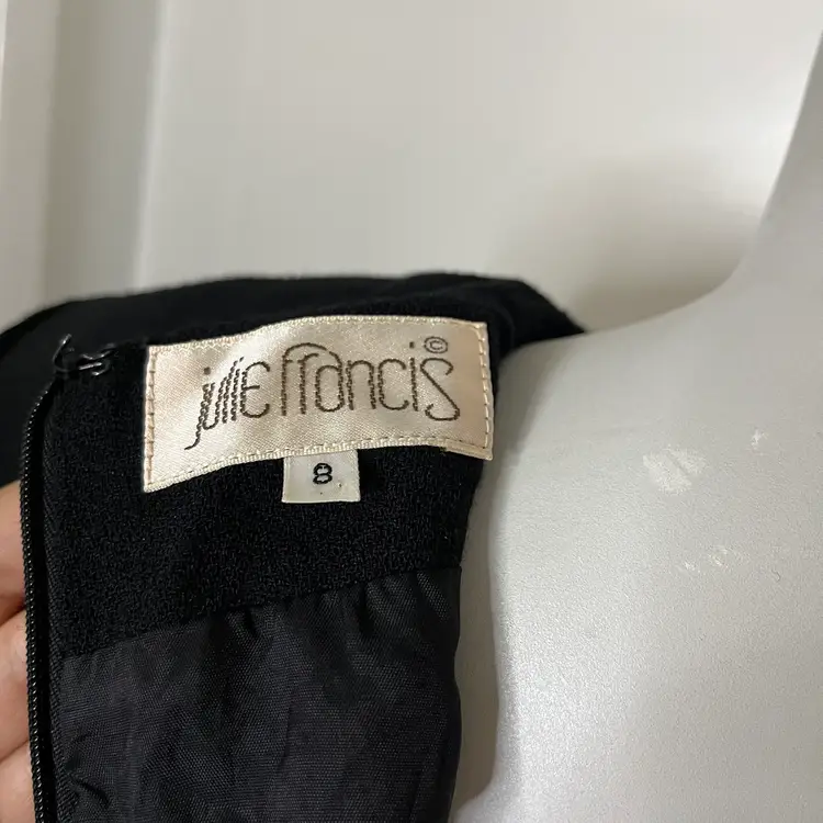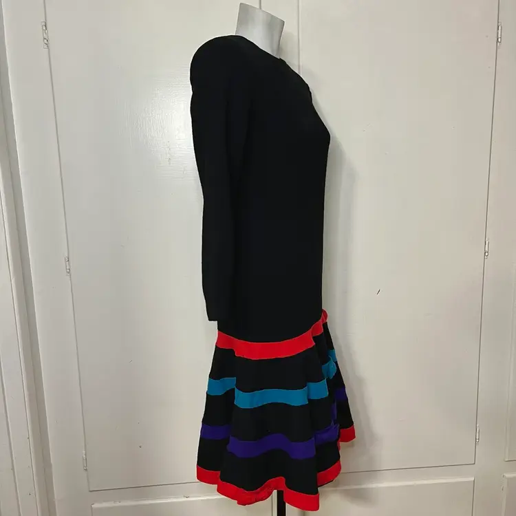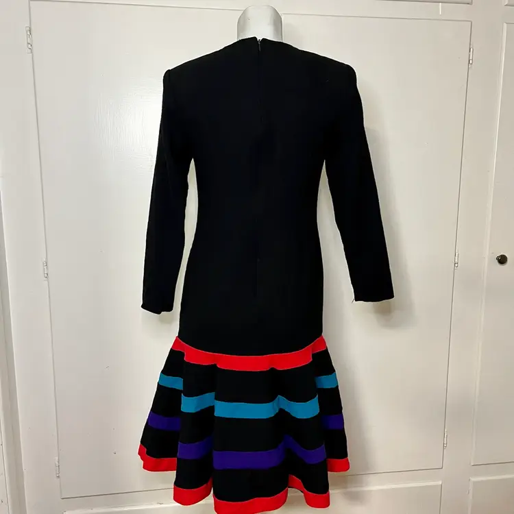✨Size 8 ✨Fully Lined ✨Has Shoulder Pads ✨Shoulder 15” ✨Bust 34” ✨Waist 30” ✨Hip 36” ✨Length 40” ✨Red Blue Purple Striped Ruffle skirt with bows ✨Centerback zipper ✨Great vintage condition