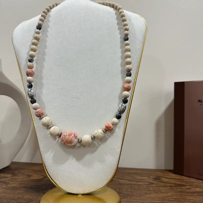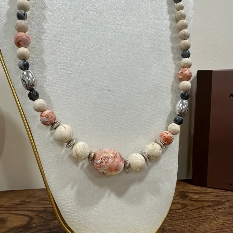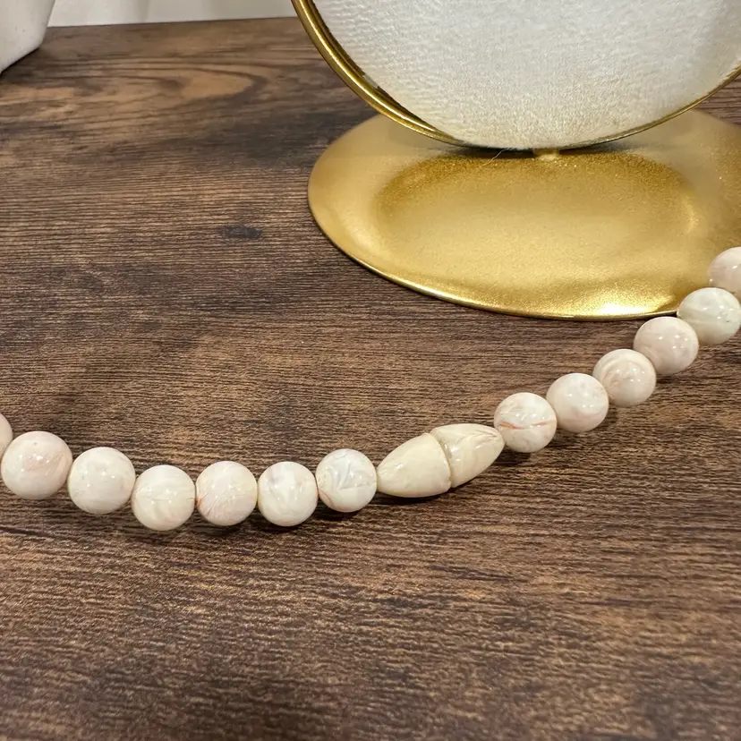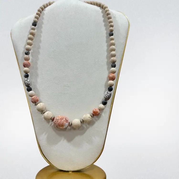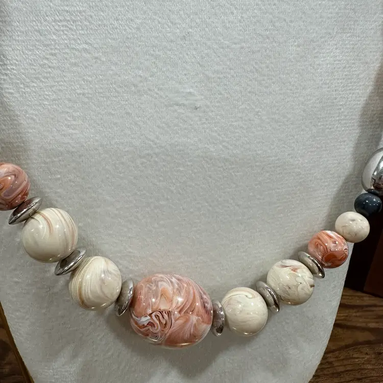 vintage 80s peach and cream acrylic beaded necklace. Has a twist clasp. In good used condition.