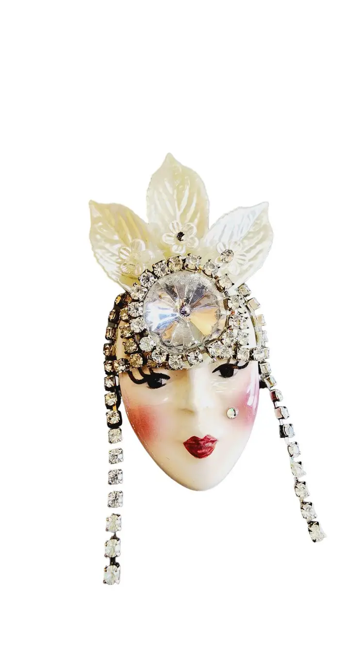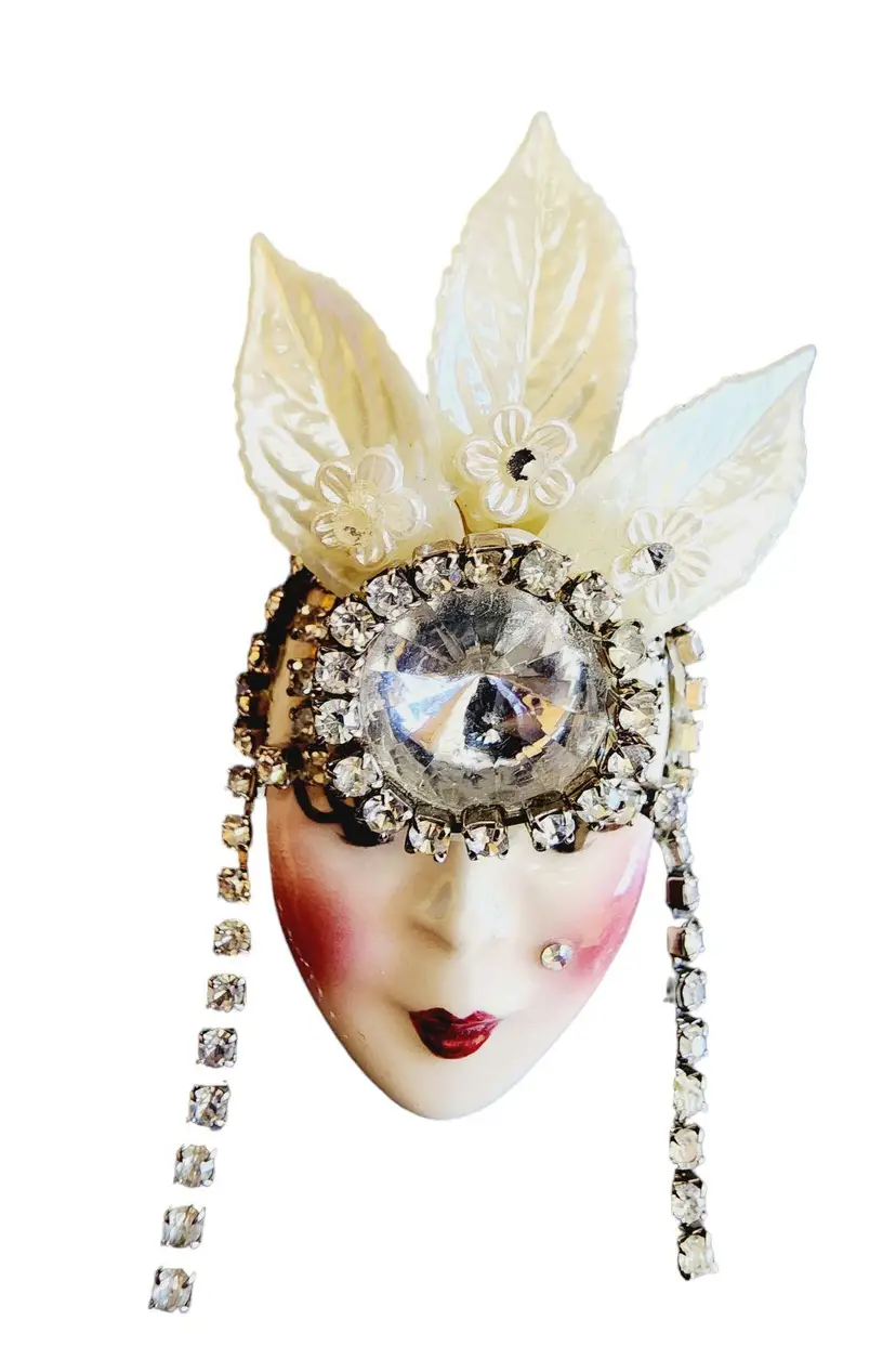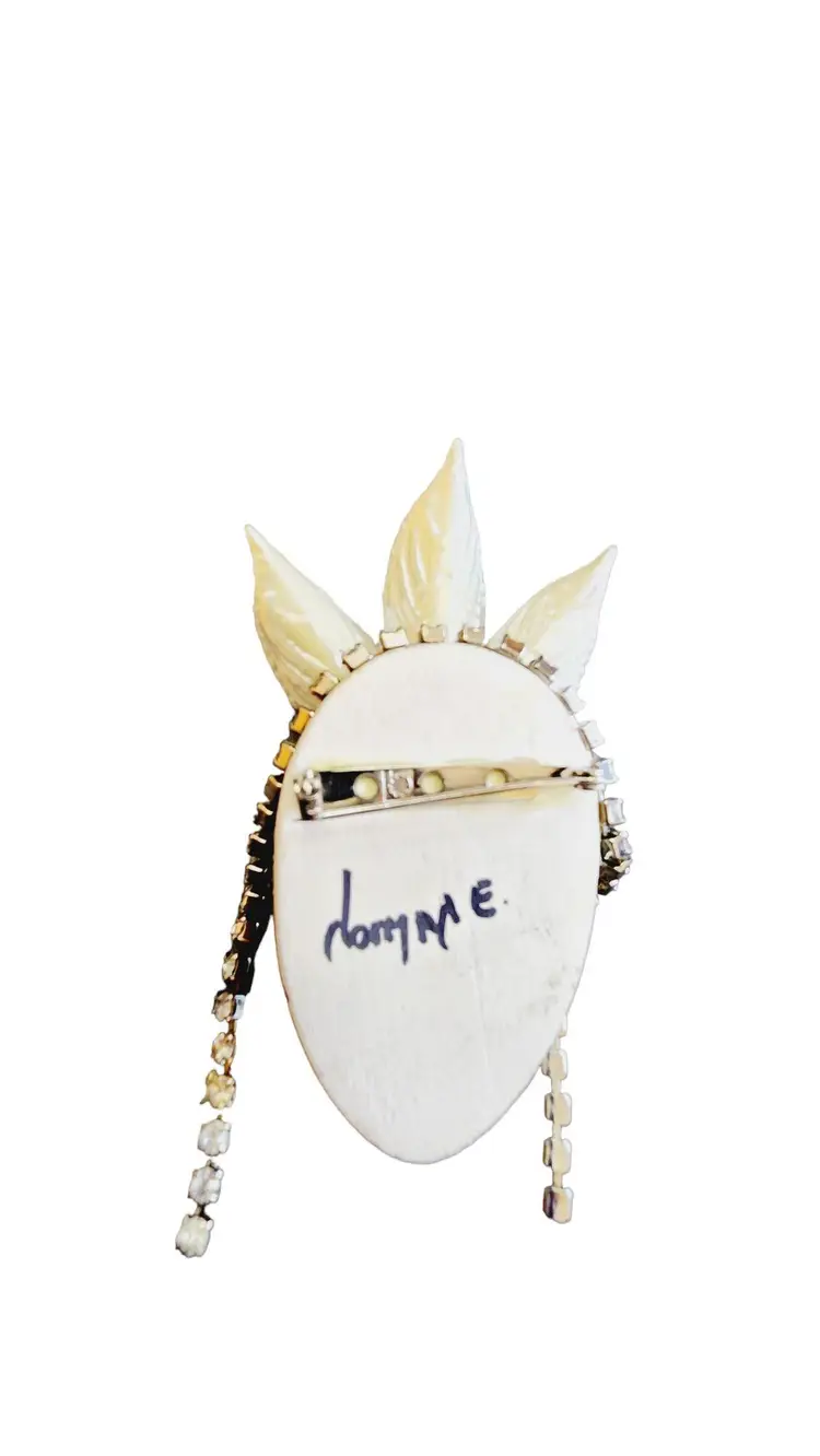 Size: 3" Color: White Condition: Very good vintage; 2 rhinestones out of 2 top leaves. Era: Circa 1980s Signed: Yes, but I can't make it out.
