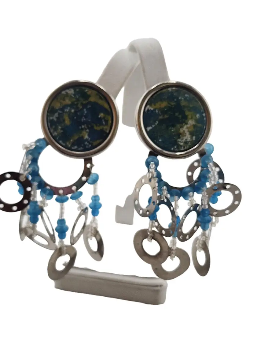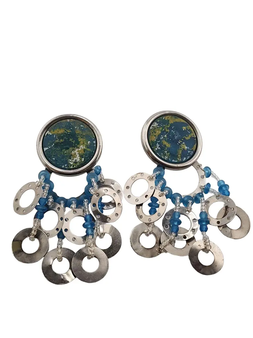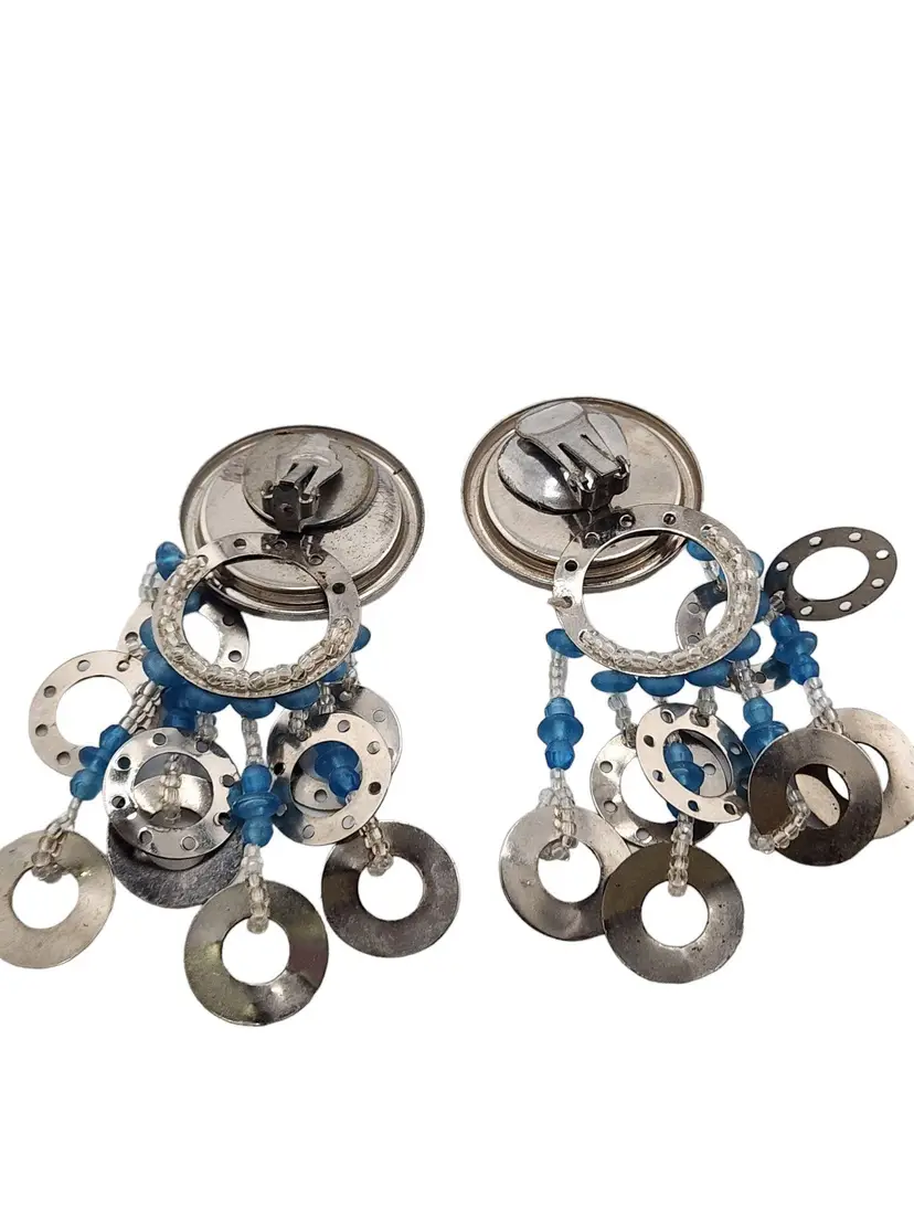 Size: 3.5" Color: Silver, Blue Condition: Good vintage Era: Circa 1980s Signed: None Details: 1 circle off on 1 earring