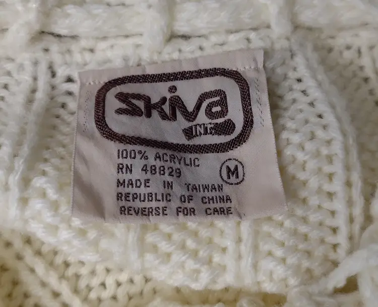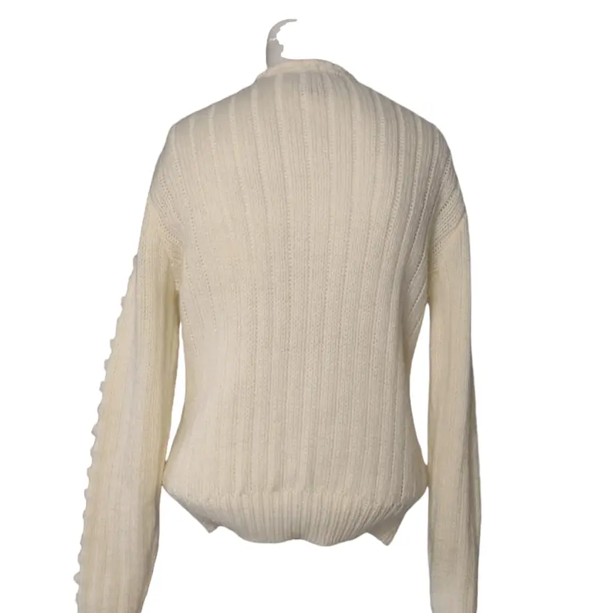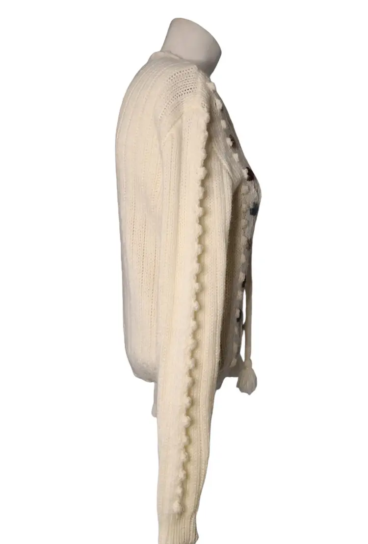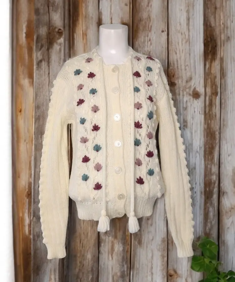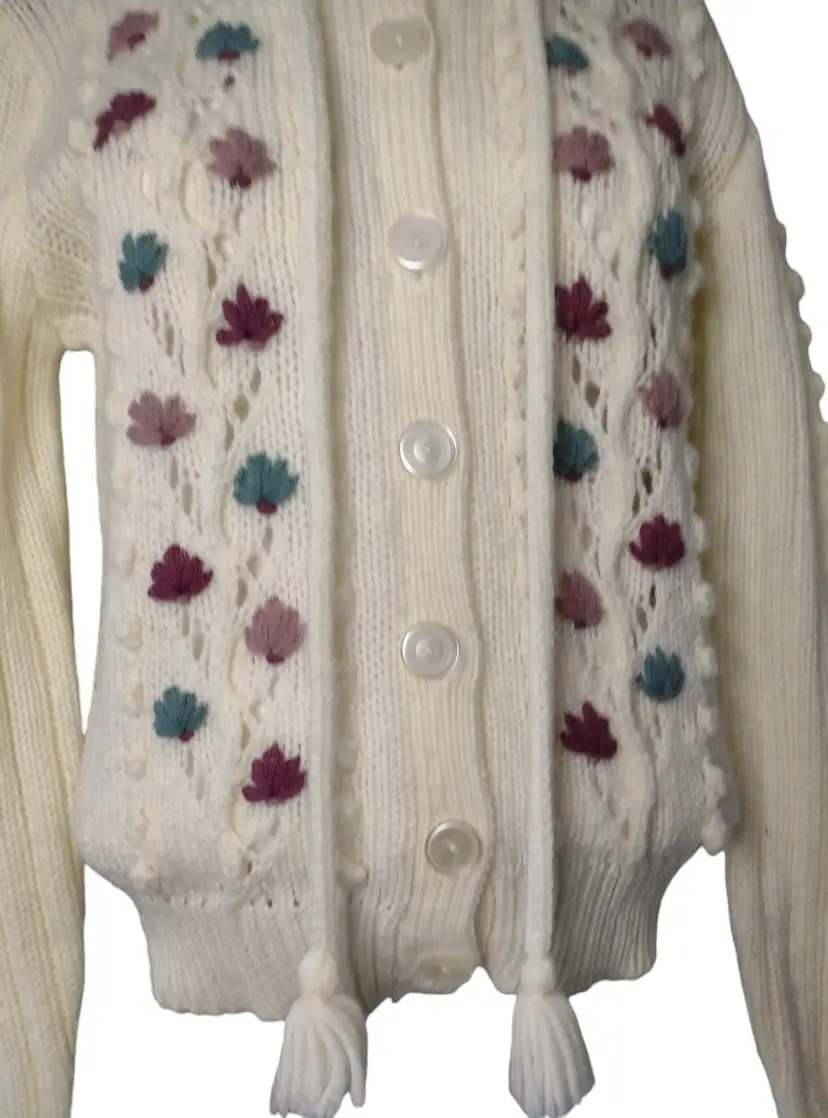 This is a beautiful cardigan sweater with so much going for it! This is a button front with ridges and a partial open knit & crewel embroidered flowers on the front. There are knit baubles all down the arms & in the front chest. Shoulder to shoulder measures 18" x pit to pit measures 22" x shoulder to hem measures 21".