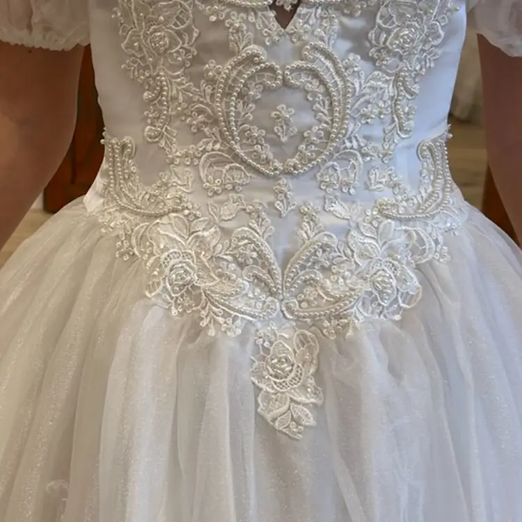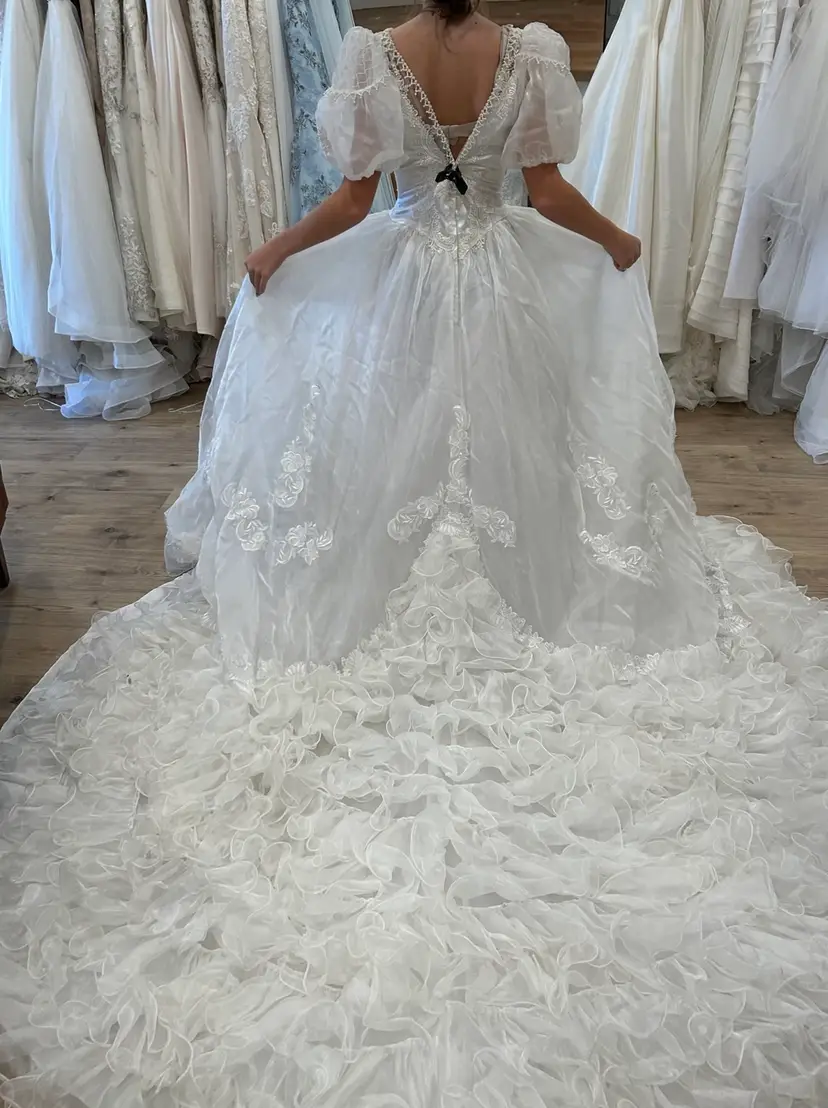 This beautiful vintage 80s wedding dress is a stunning piece. It is a size 2-4 is a private label has been dry cleaned. A few spots of discoloration on lace very minimal do to age of dress.