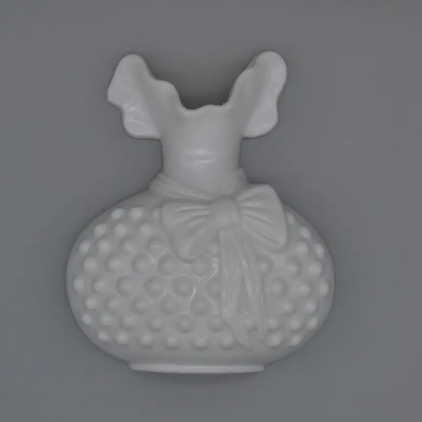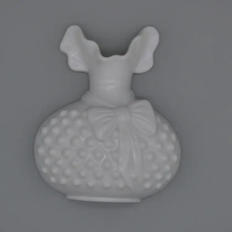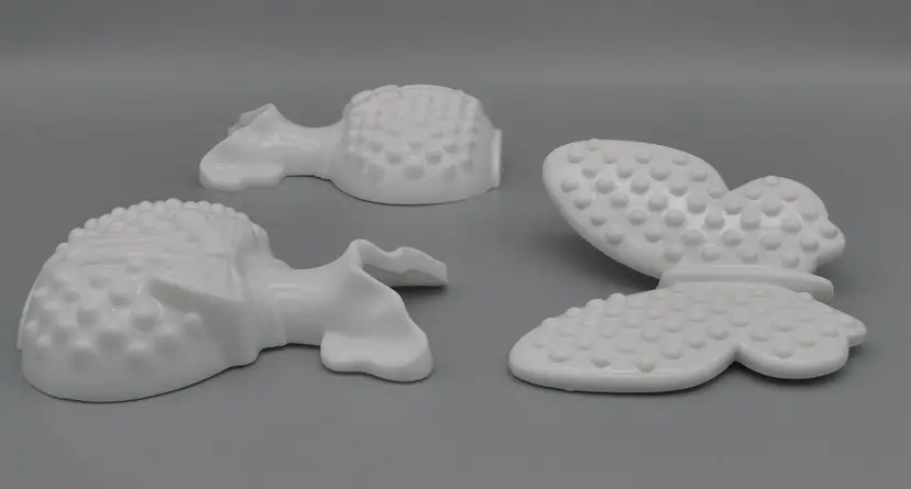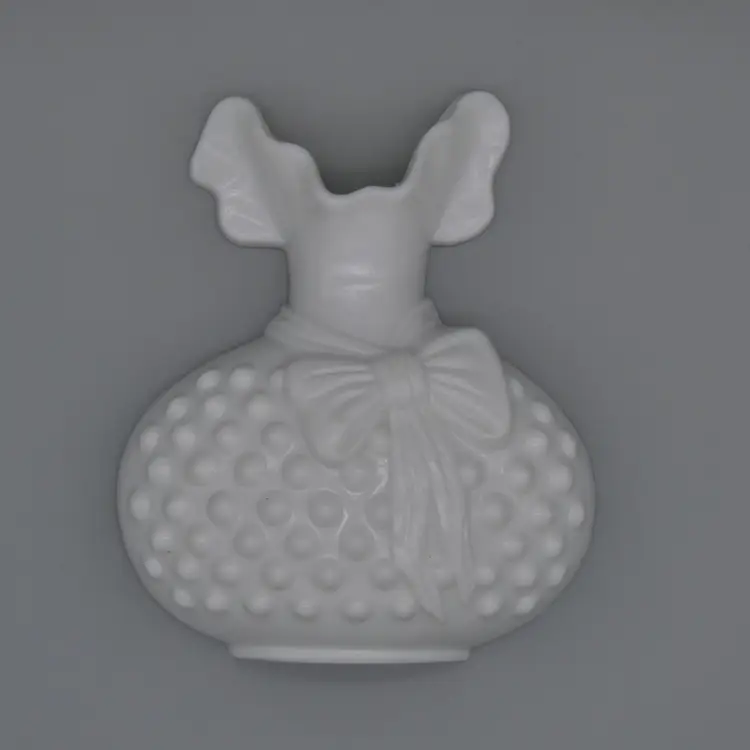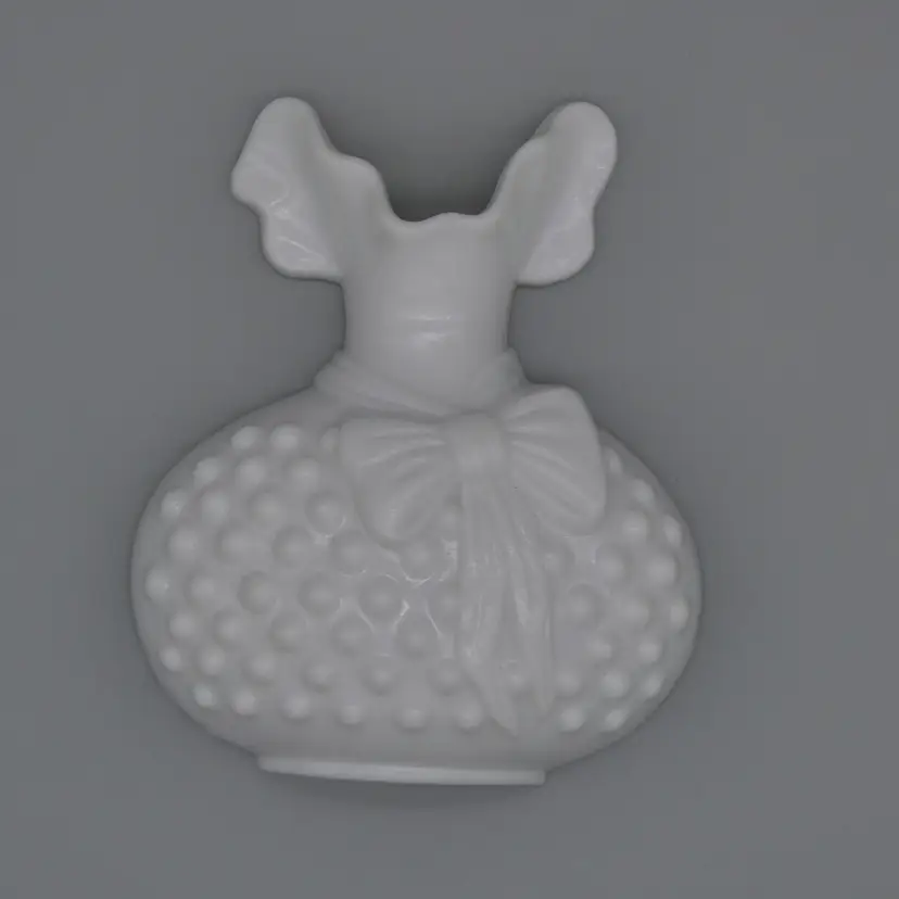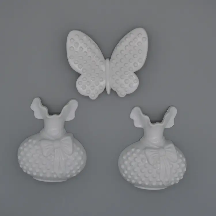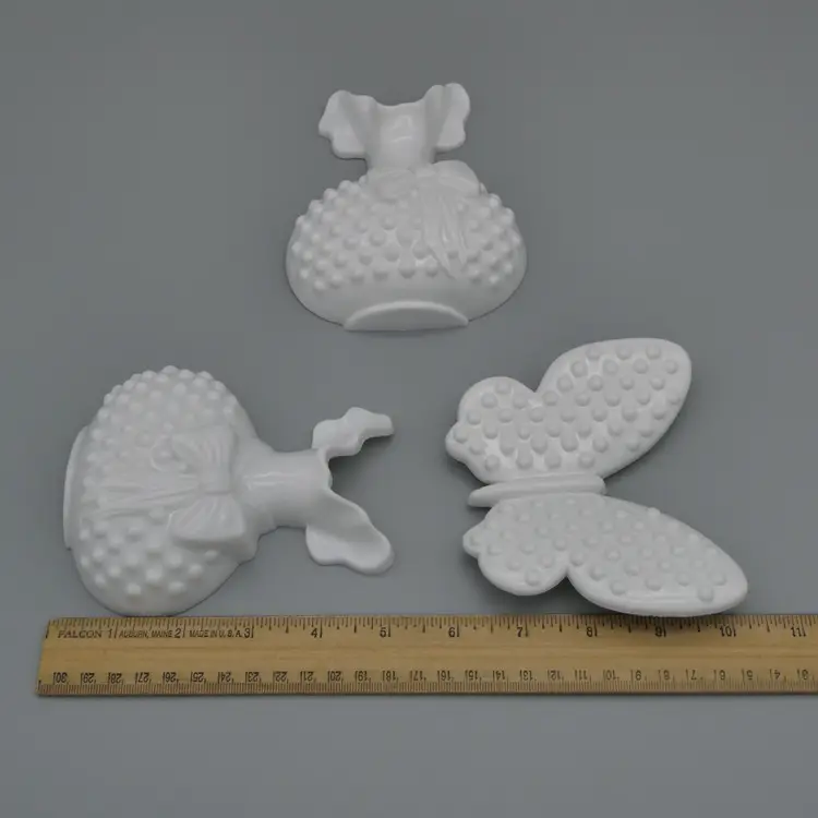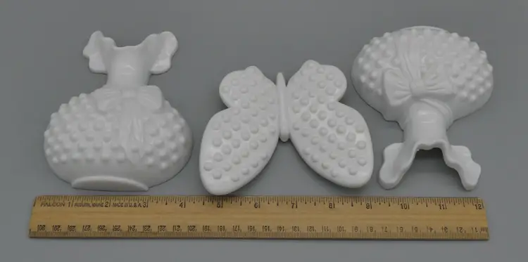 Featuring two ruffled vases and a butterfly designed to imitate hobnail milk glass pieces Bas-relief white plastic composition wall decor The vases have cardboard backing with a hole for wall hanging Vases could be used as small wall pockets for lightweight faux foliage (3/4" wide opening) Butterfly has a metal hanger that swivels for wall hanging Vases marked: MCMLXXXVIII (1988), Burwood Prod Co., Made in USA, 2656-2-(?) Butterfly marked: MCMLXXXVII (1987), Burwood Products Co., Made in USA, 2704 Vases measures overall about 5" tall x 4-1/8" wide x 1-1/4" deep at their thickest Butterfly measures overall about 4-1/4" tall x 4-3/4" wide x 1" deep at its thickest Set of 3 weighs about 8 ounces before being packaged to ship