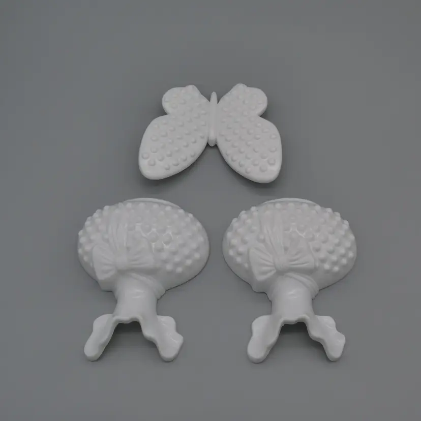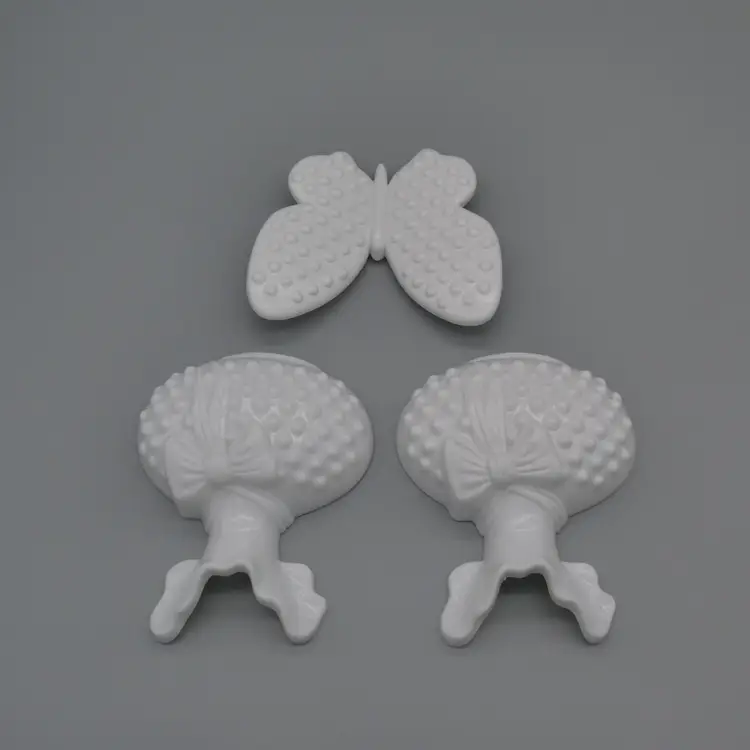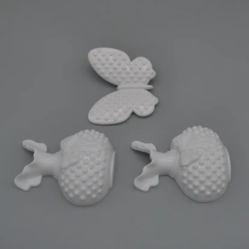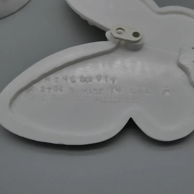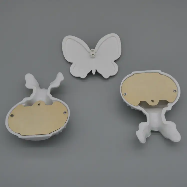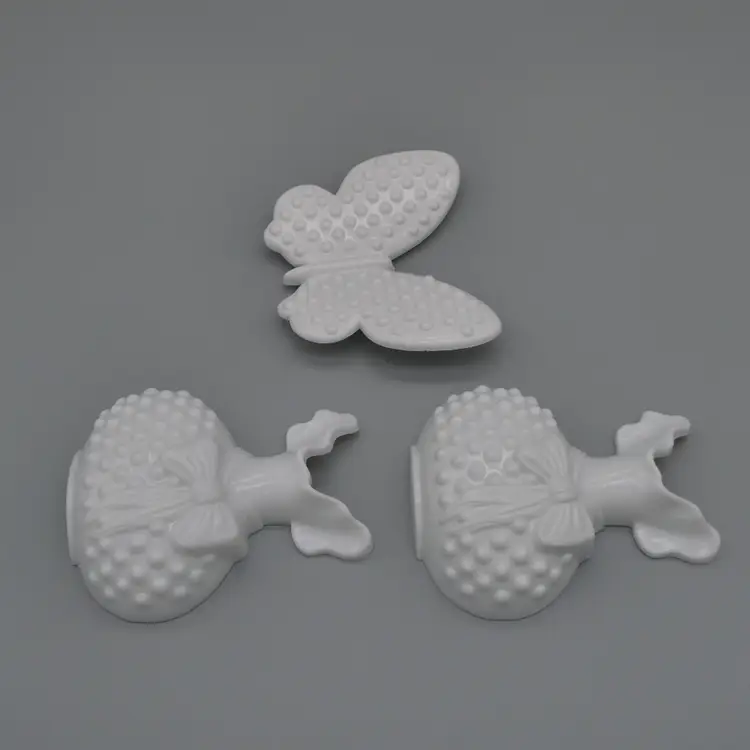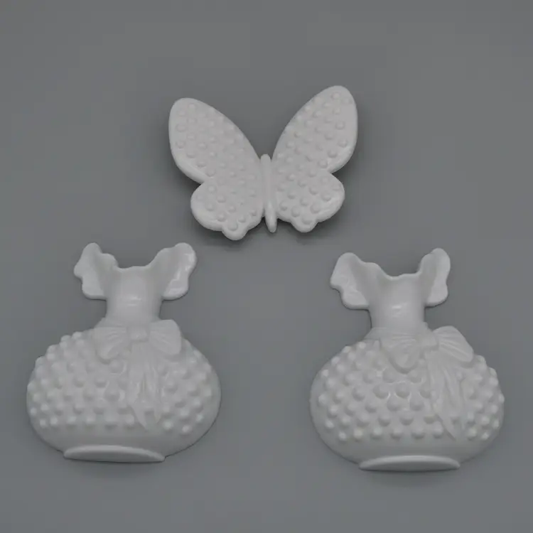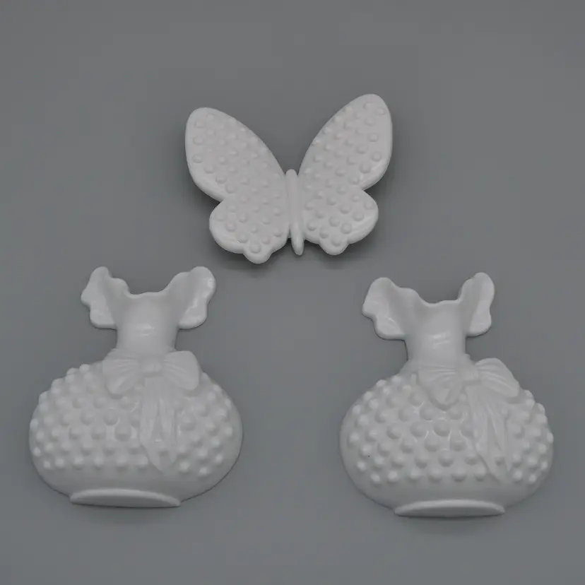 Featuring two ruffled vases and a butterfly designed to imitate hobnail milk glass pieces Bas-relief white plastic composition wall decor The vases have cardboard backing with a hole for wall hanging Vases could be used as small wall pockets for lightweight faux foliage (3/4" wide opening) Butterfly has a metal hanger that swivels for wall hanging Vases marked: MCMLXXXVIII (1988), Burwood Prod Co., Made in USA, 2656-2-(?) Butterfly marked: MCMLXXXVII (1987), Burwood Products Co., Made in USA, 2704 Vases measures overall about 5" tall x 4-1/8" wide x 1-1/4" deep at their thickest Butterfly measures overall about 4-1/4" tall x 4-3/4" wide x 1" deep at its thickest Set of 3 weighs about 8 ounces before being packaged to ship