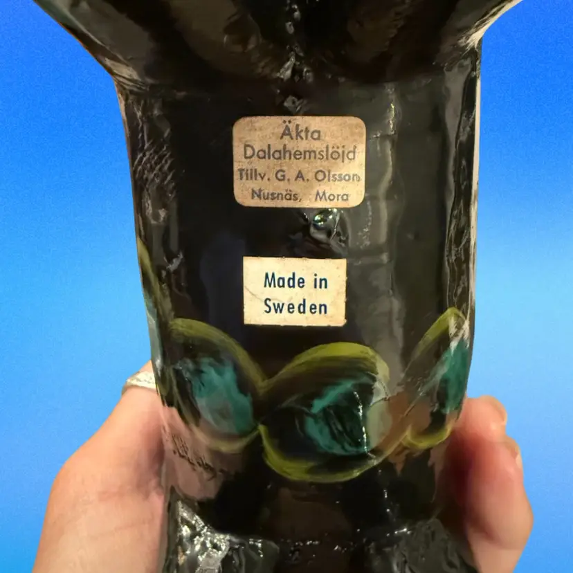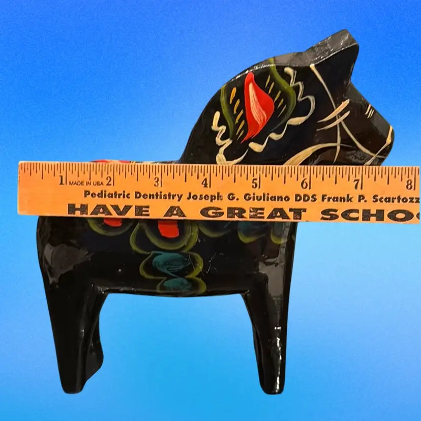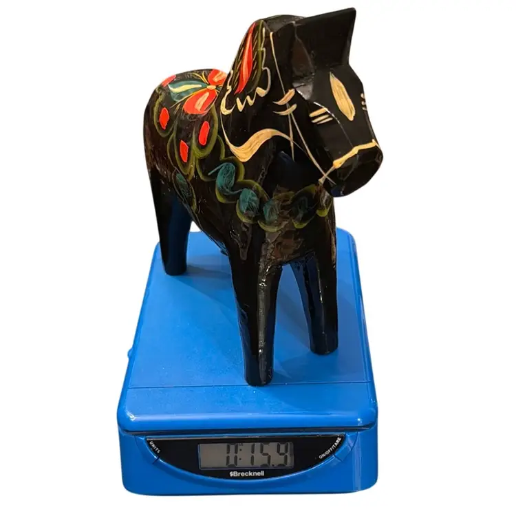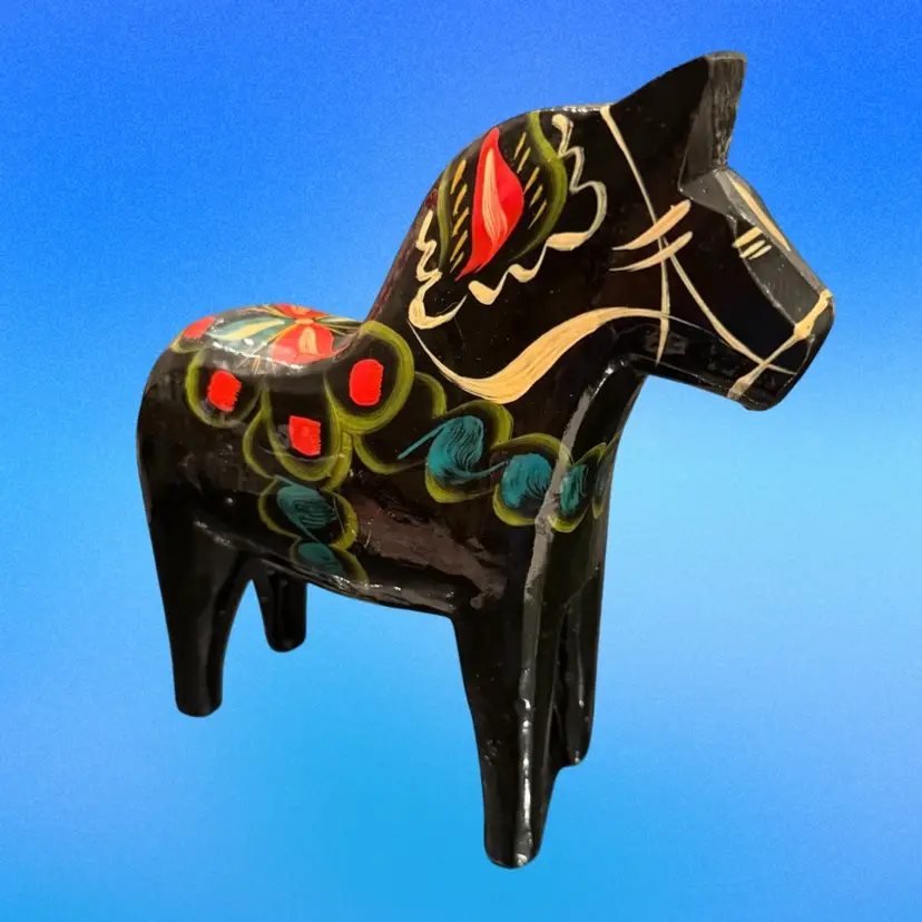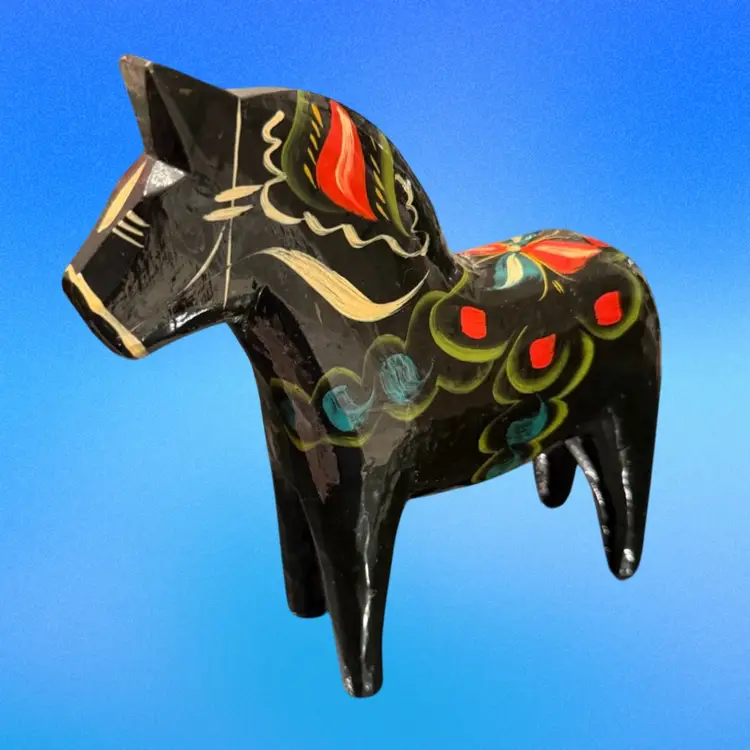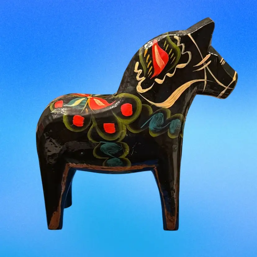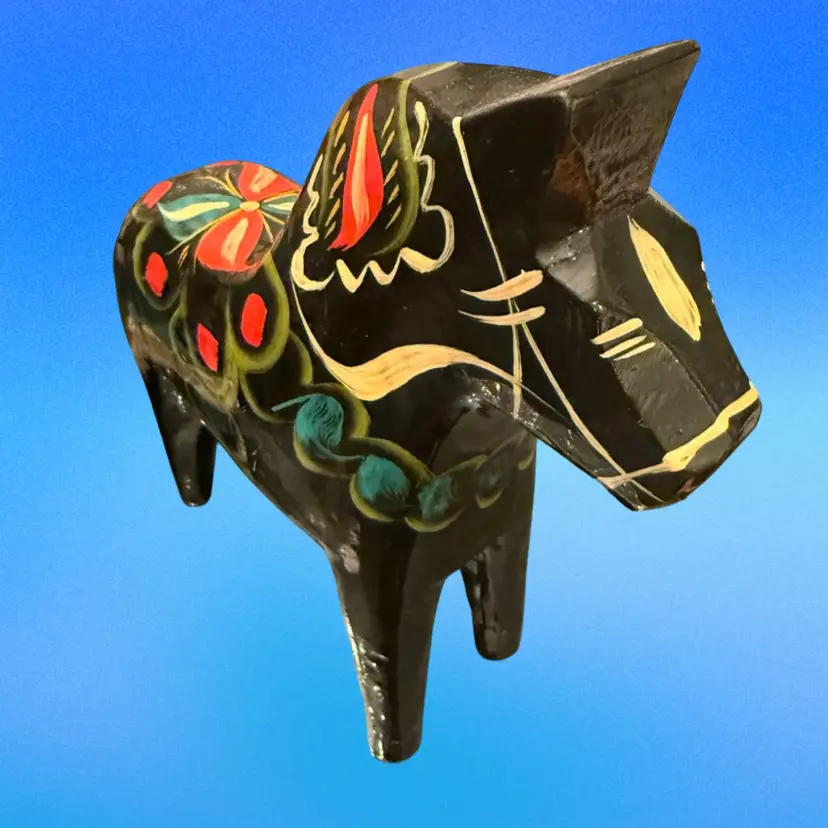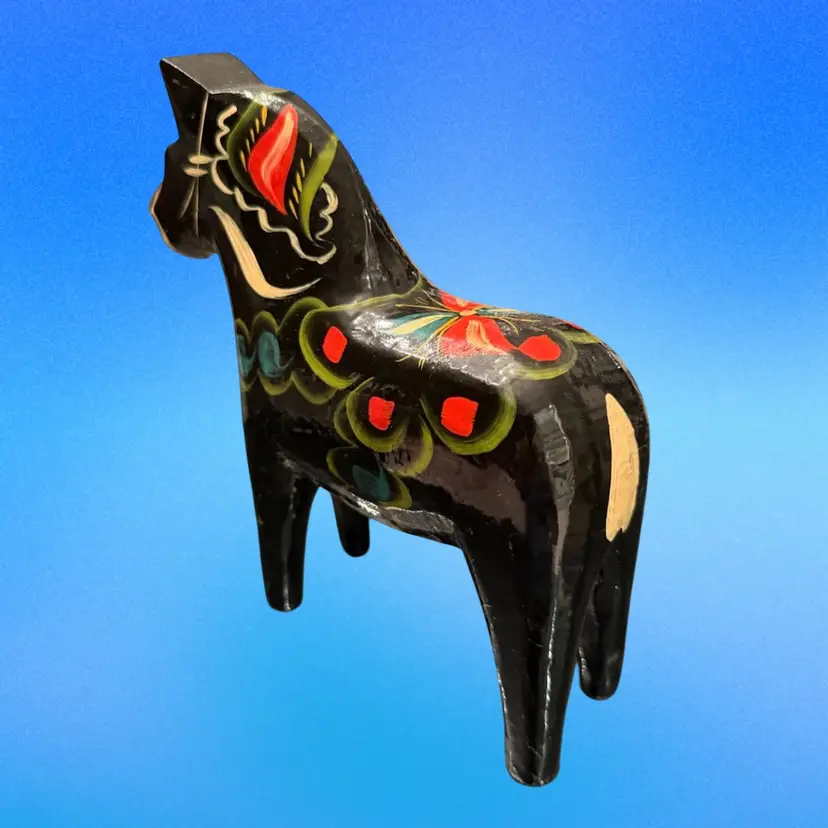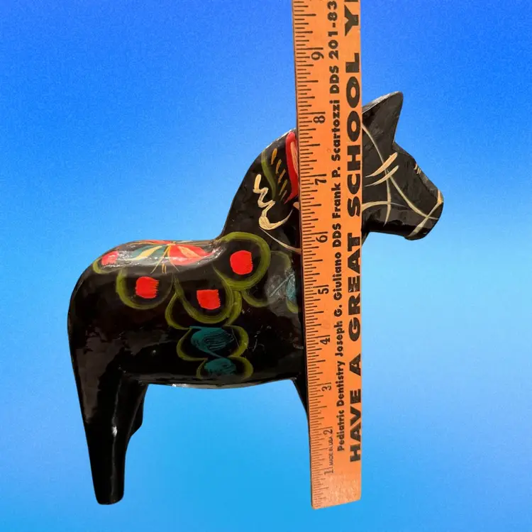 Vintage circa 1970’s large 8.5”x7.5” Dala Horse original label on underside. Very nice condition, no chips, cracks or repairs. Light surface scuffs but no paint loss.