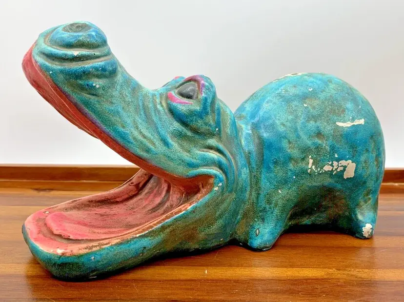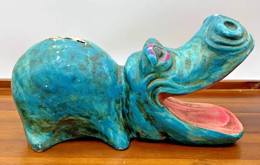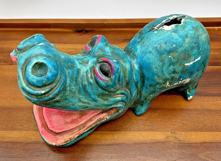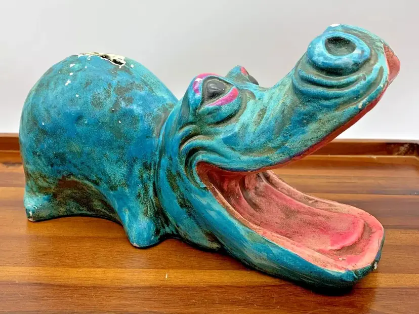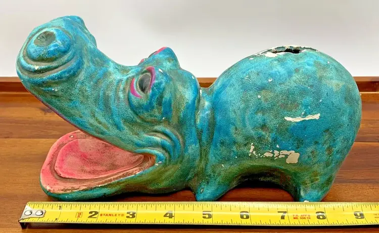 Vintage 9" Coin Piggy Bank Hippopotamus Hippo Shaped 1960s 70s Open Mouth Decor