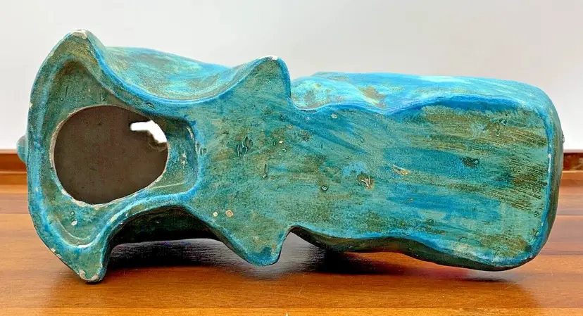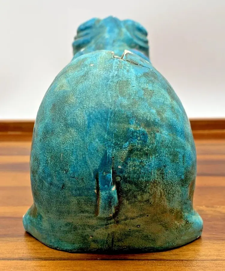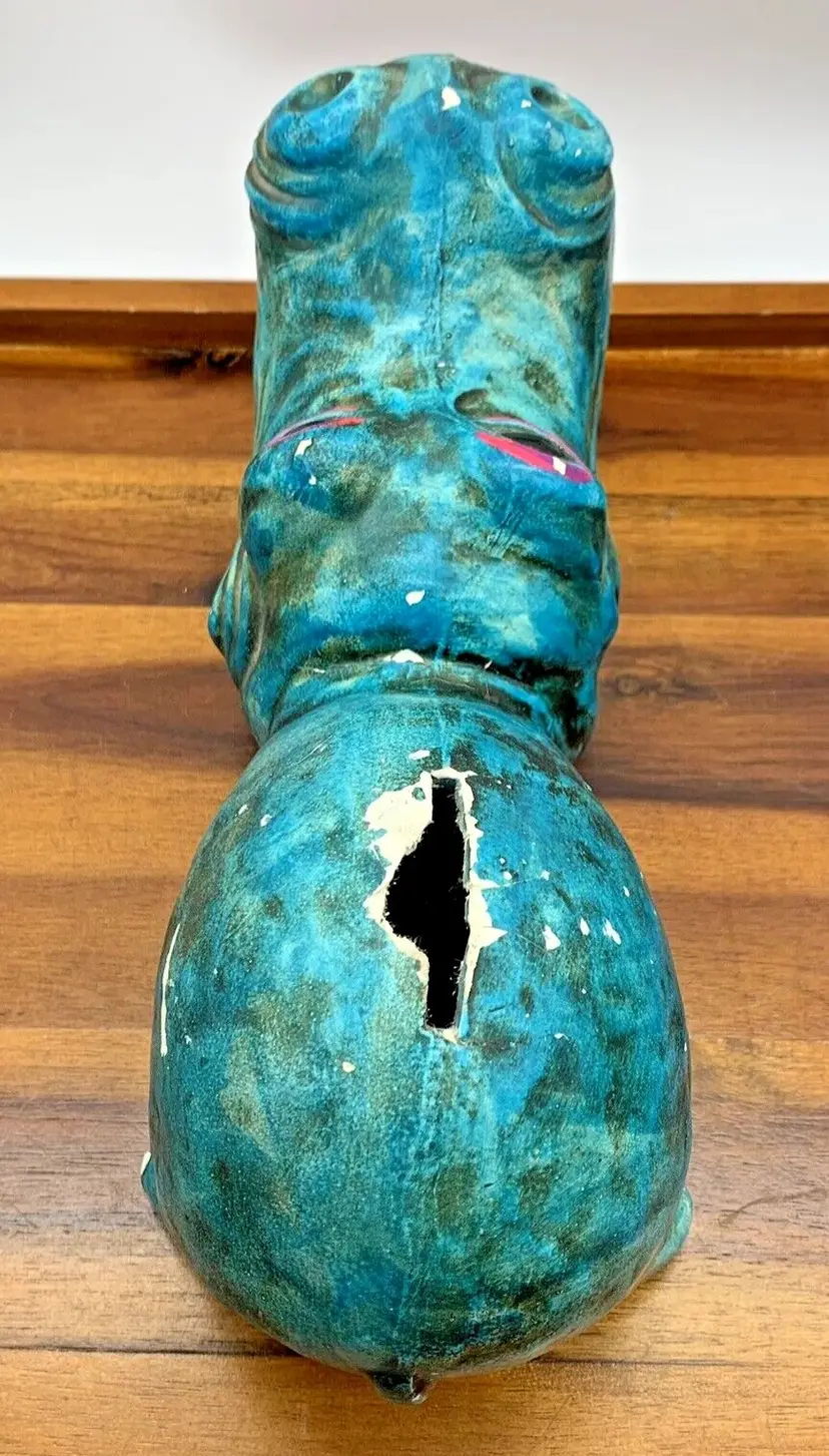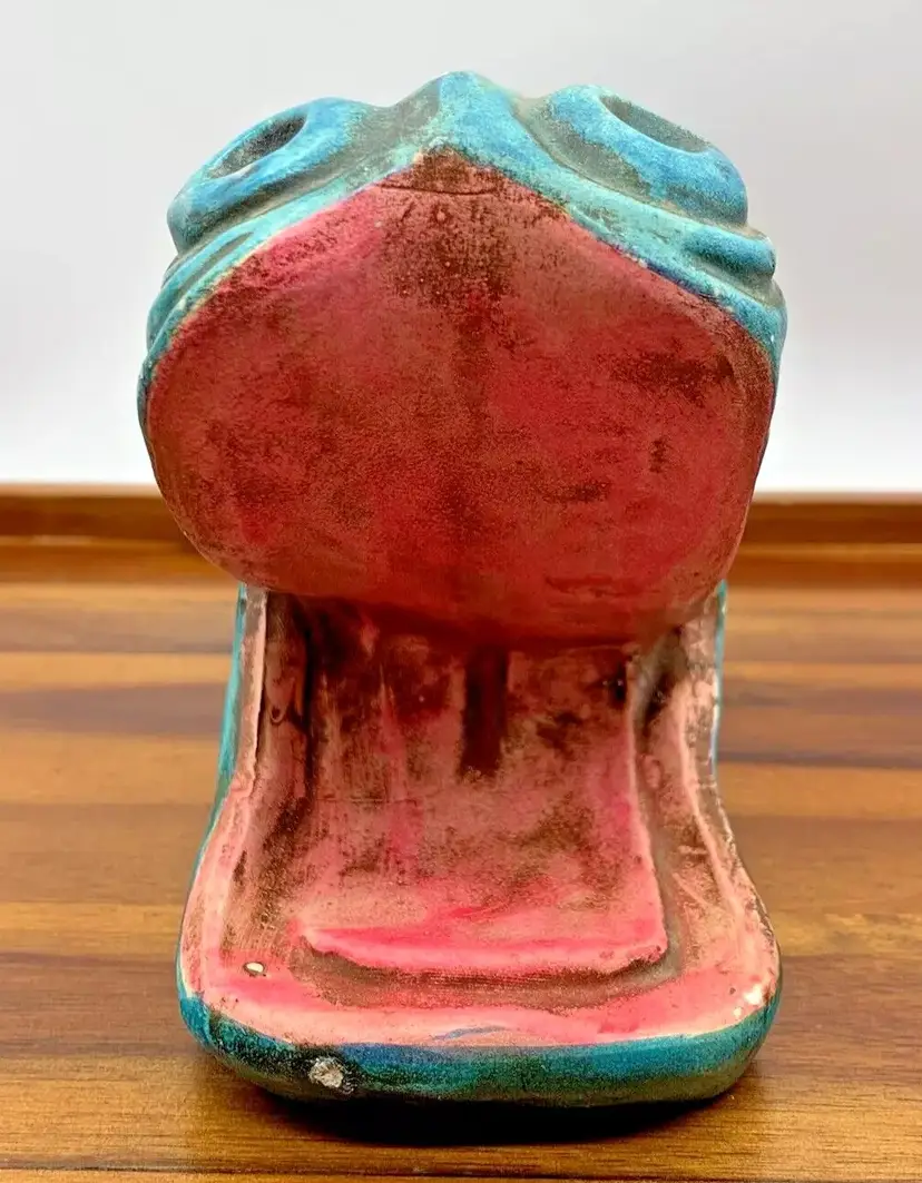 This looks to be from a mold made in Japan, circa 1960s to 1970s. Has a ceramic / chalkware / plaster type feel for the material. You can see there is some wear on the coin slot and there is no stopper. Still a fantastic piece that can be displayed anywhere! Measures roughly 9 inches long and weighs 1 lb.