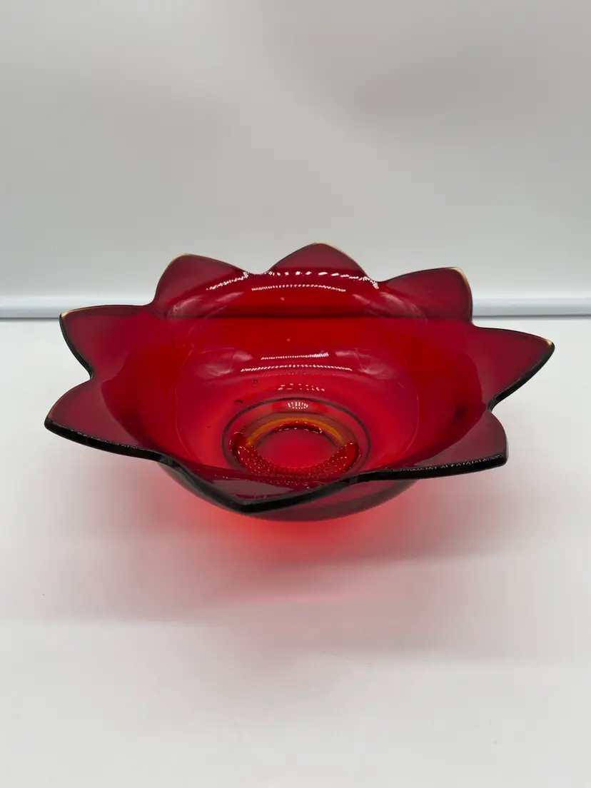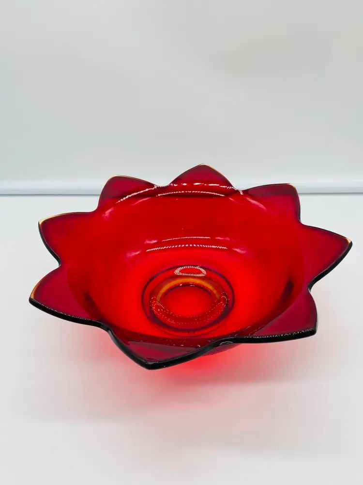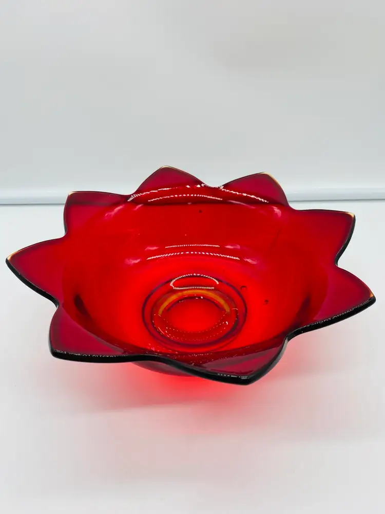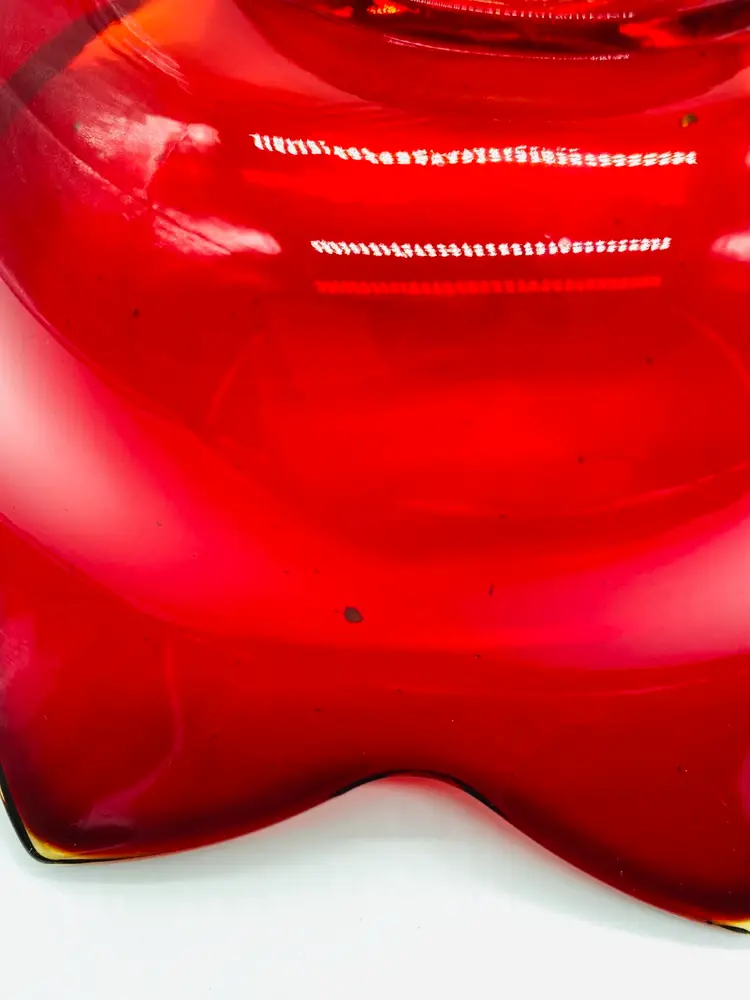 This bowl is unsigned but credit goes to Fenton. This bowl is 9” across (point to point)and just over 3” tall. It is Amberina in color going from Ruby Red to a golden Yellow on the bottom. There are not chips or cracks. There are some air bubbles and a few small spots as shown in photos. The bottom only glows.