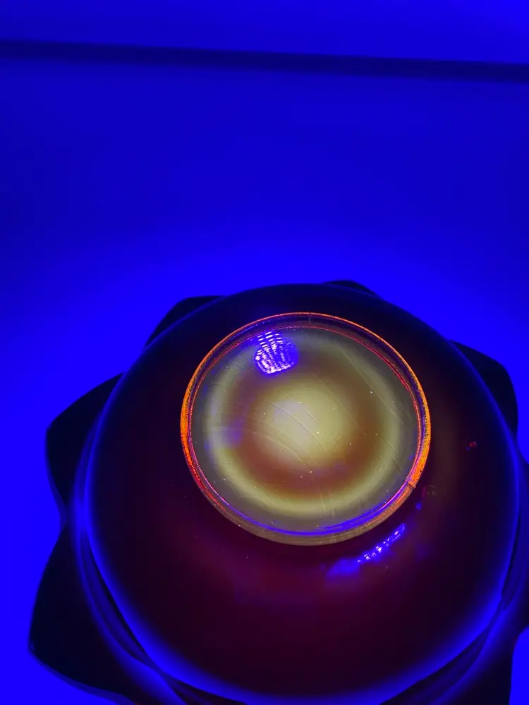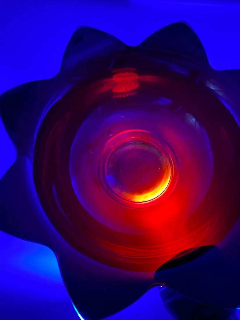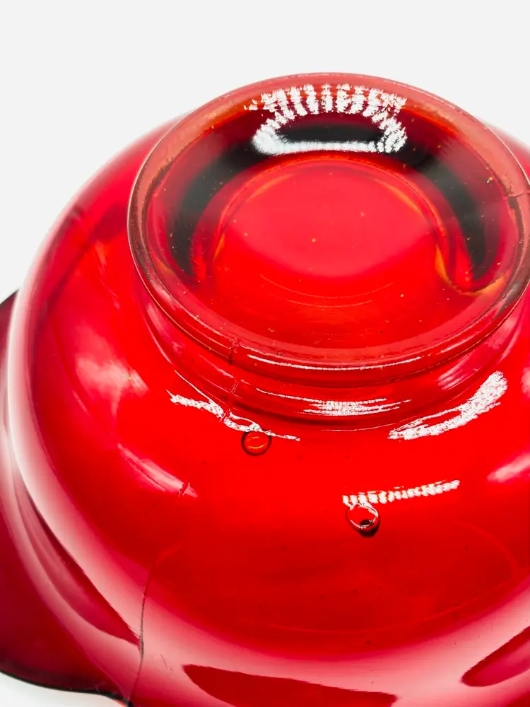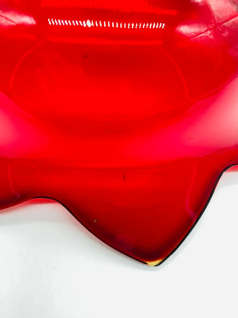 This bowl is unsigned but credit goes to Fenton. This bowl is 9” across (point to point)and just over 3” tall. It is Amberina in color going from Ruby Red to a golden Yellow on the bottom. There are not chips or cracks. There are some air bubbles and a few small spots as shown in photos. The bottom only glows.