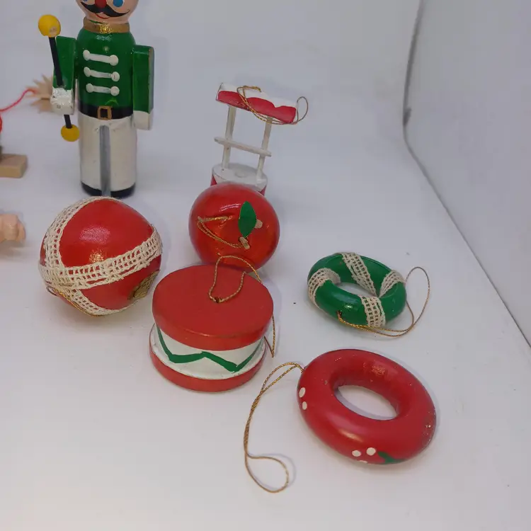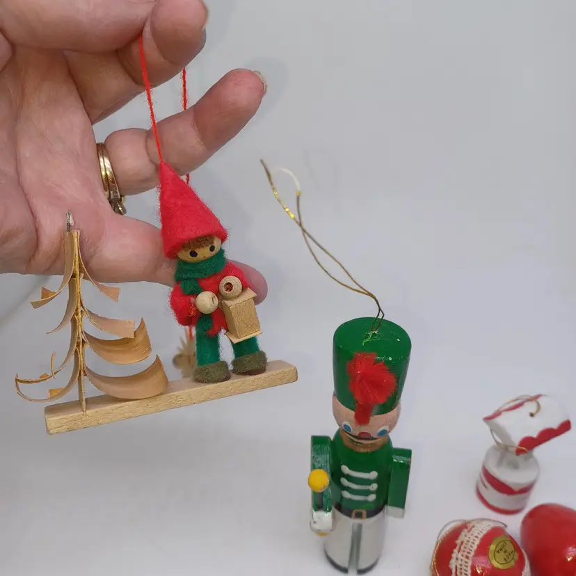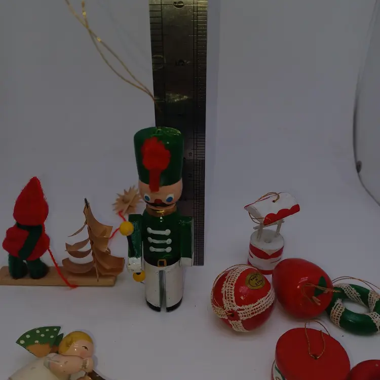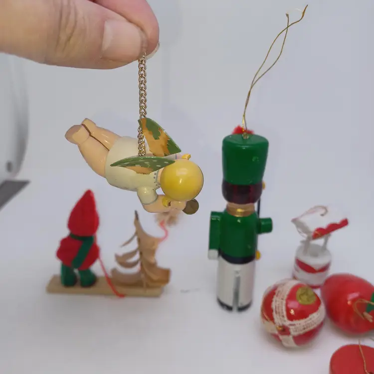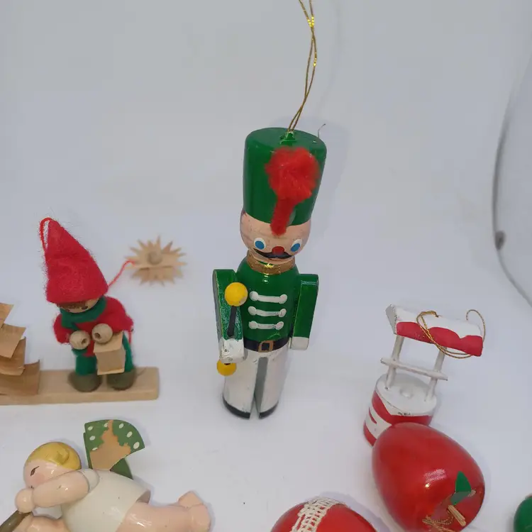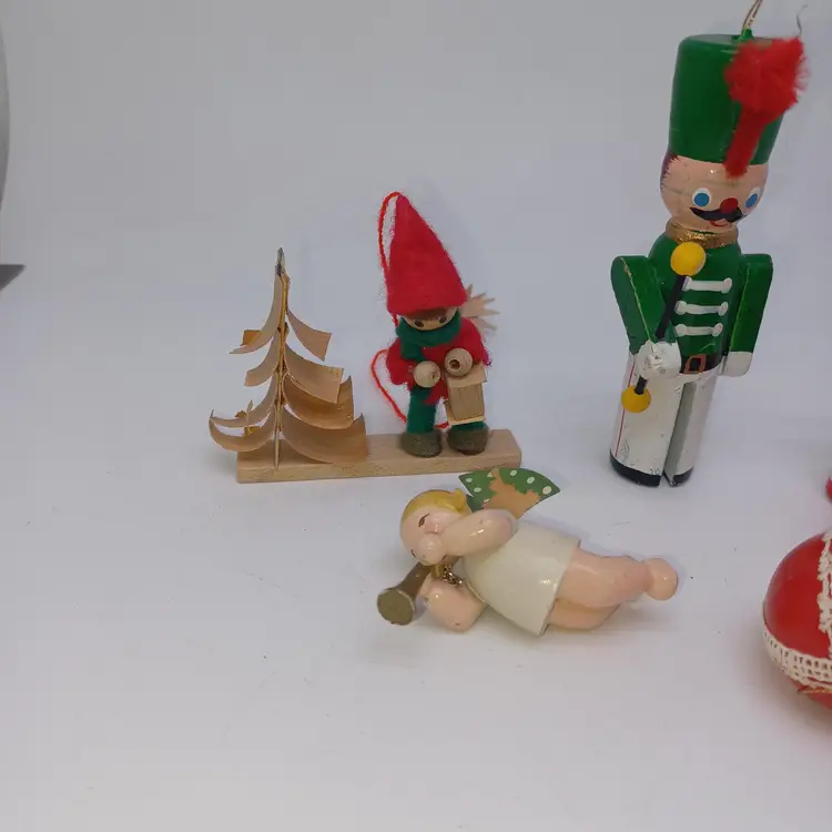 9 vintage wood Christmas ornaments the smaller roundish ones and the wishing well are marked with the made in China sticker t he felted snowboy with the wood curls is handmade and adorable the wooden Nutcracker and the angel I believe are Germany but they are unmarked the angel does have some condition issues with paint missing on her wings and arm but she still is adorable and hangs from a chain please see all pictures as they are the best description all items from a smoke-free home with pets experienced fragile shipper