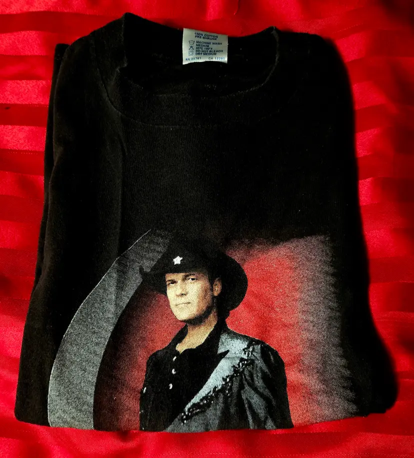 This vintage 90s Ricky Van Shelton country music artist Brockum shirt in size XL features a solid multicolor design with a double-sided print. Made of a cotton blend material, this short sleeve crew neck shirt is machine washable and perfect for any fan of 90s music and artists. The shirt showcases the iconic character of Ricky Van Shelton and is a regular fit for a comfortable and nostalgic look.