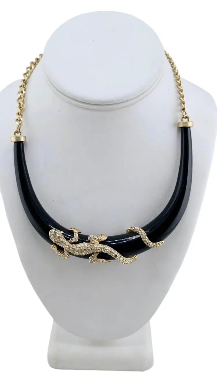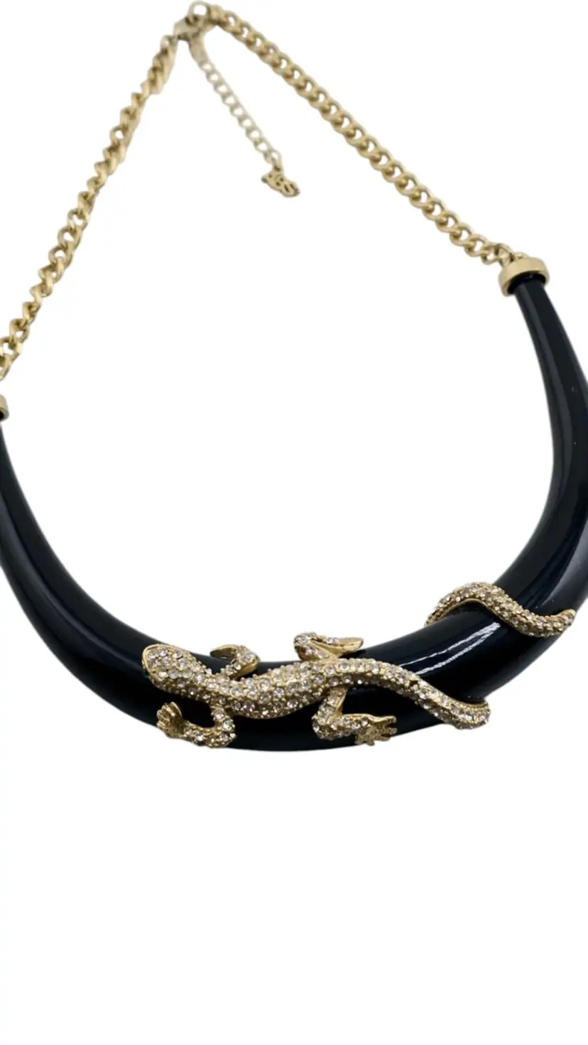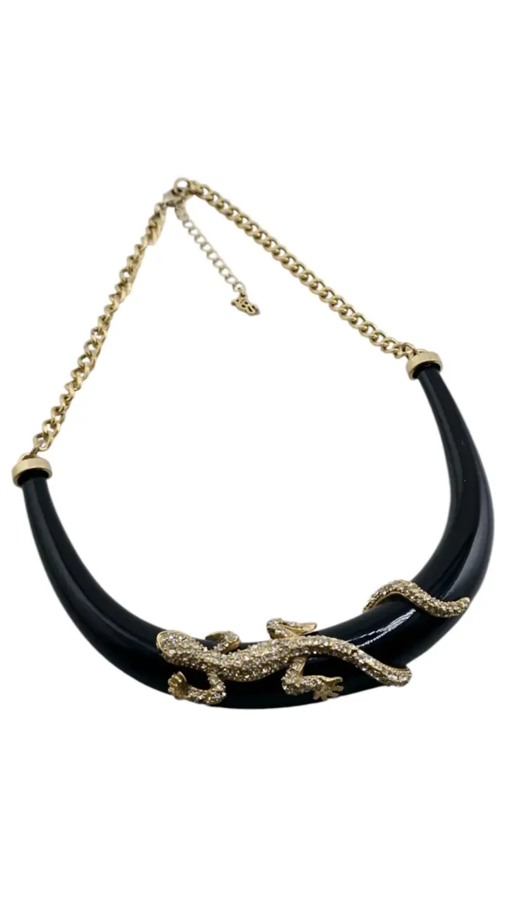 Vintage 90s ABS Rhinestone Lizard Collar Necklace Black Enamel Statement Piece (A829)