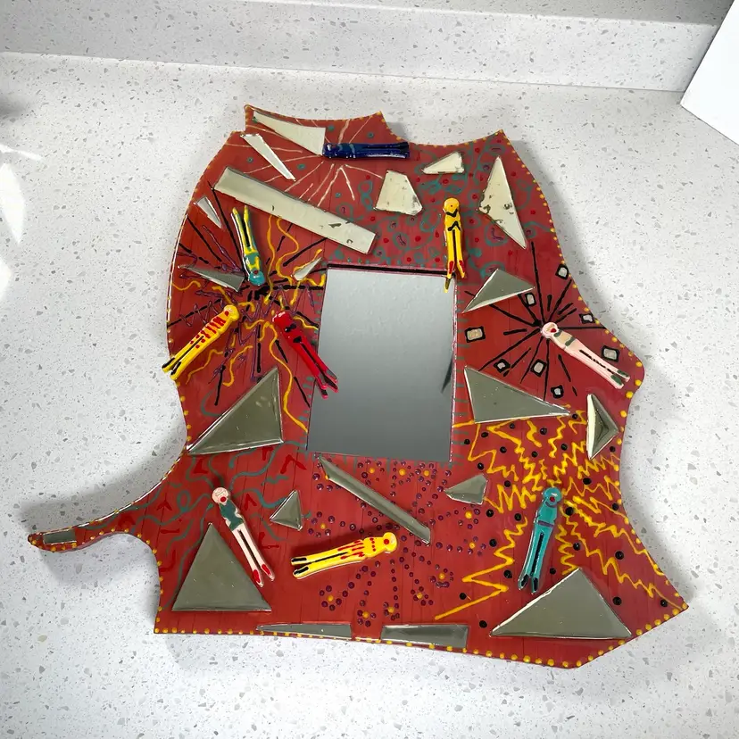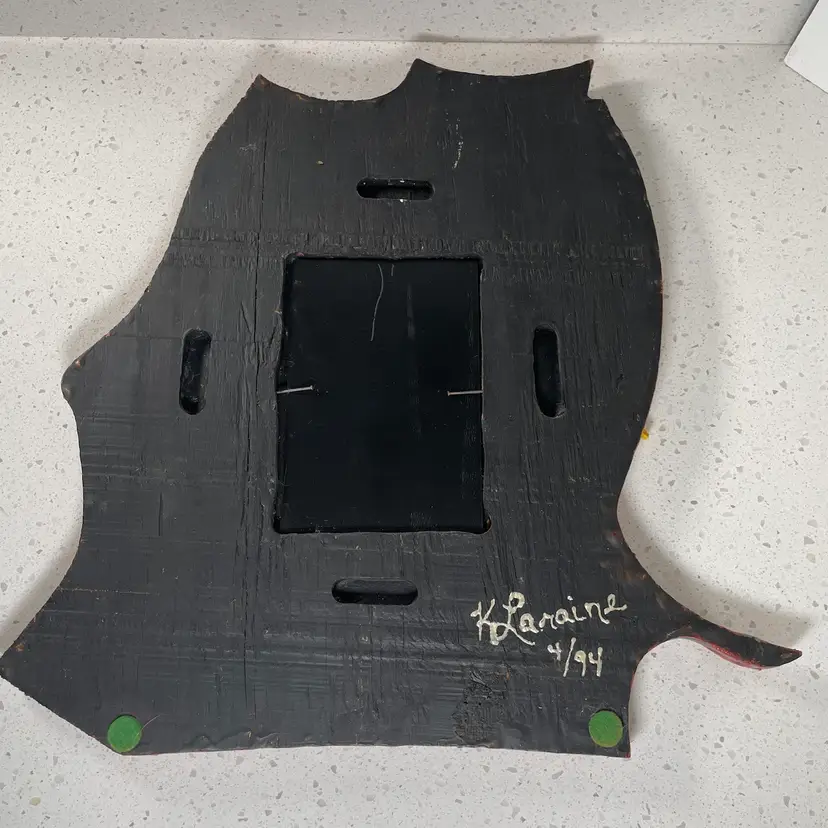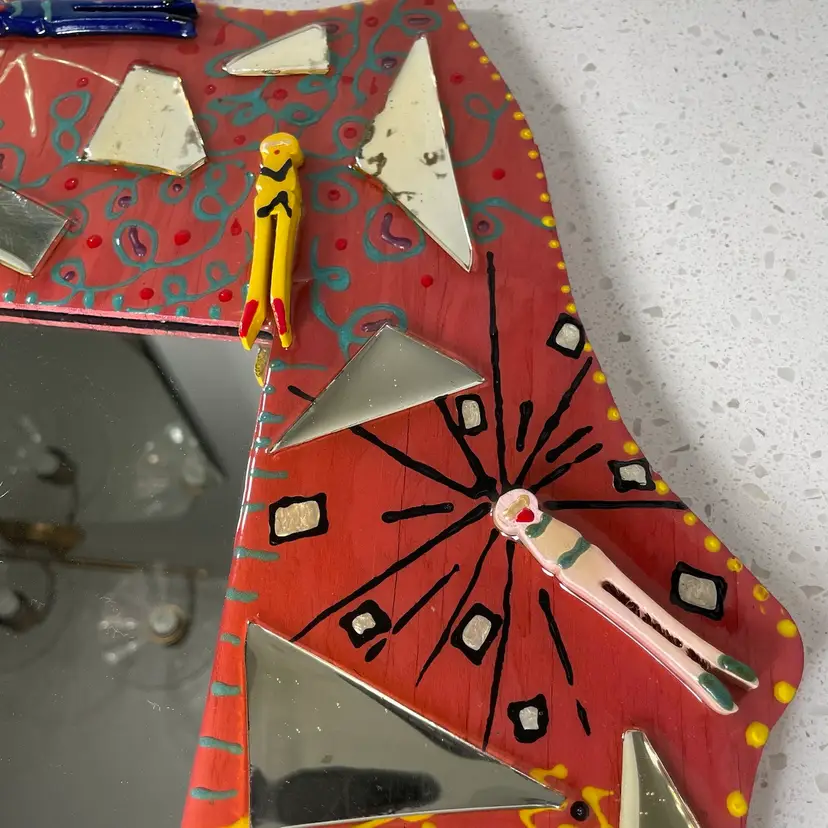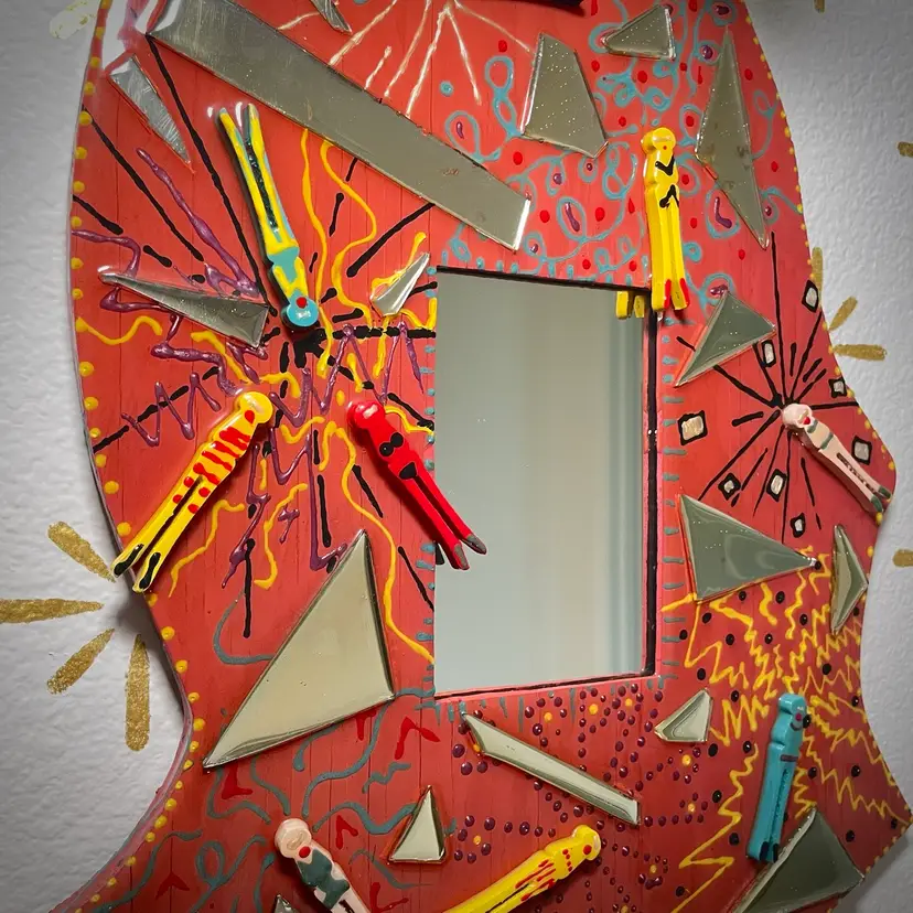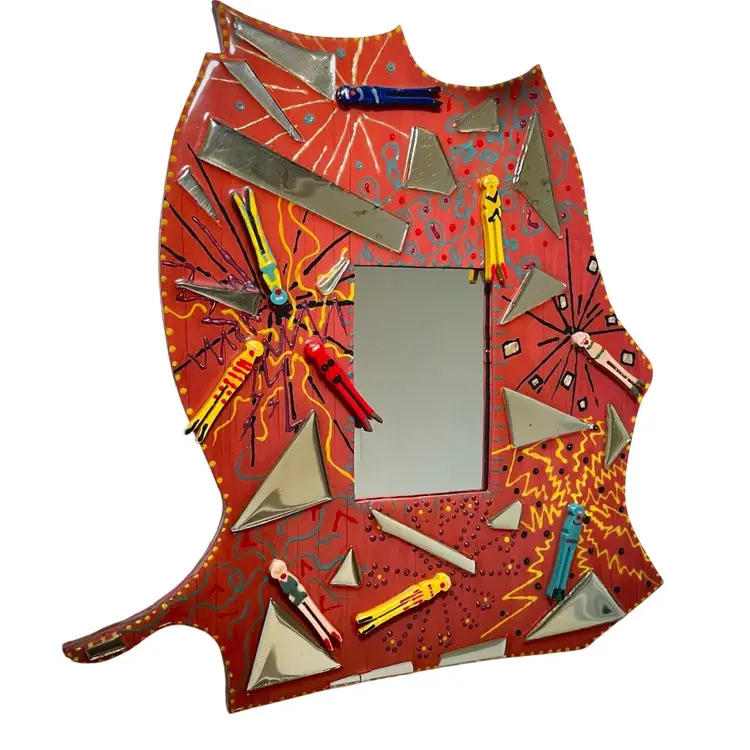Awesome handmade folk art piece, can be hung from any direction. Signed K Laraine. Check my listings for a second eclectic mirror by this artist.