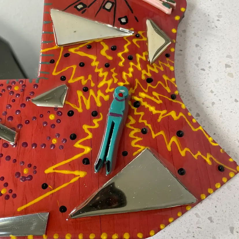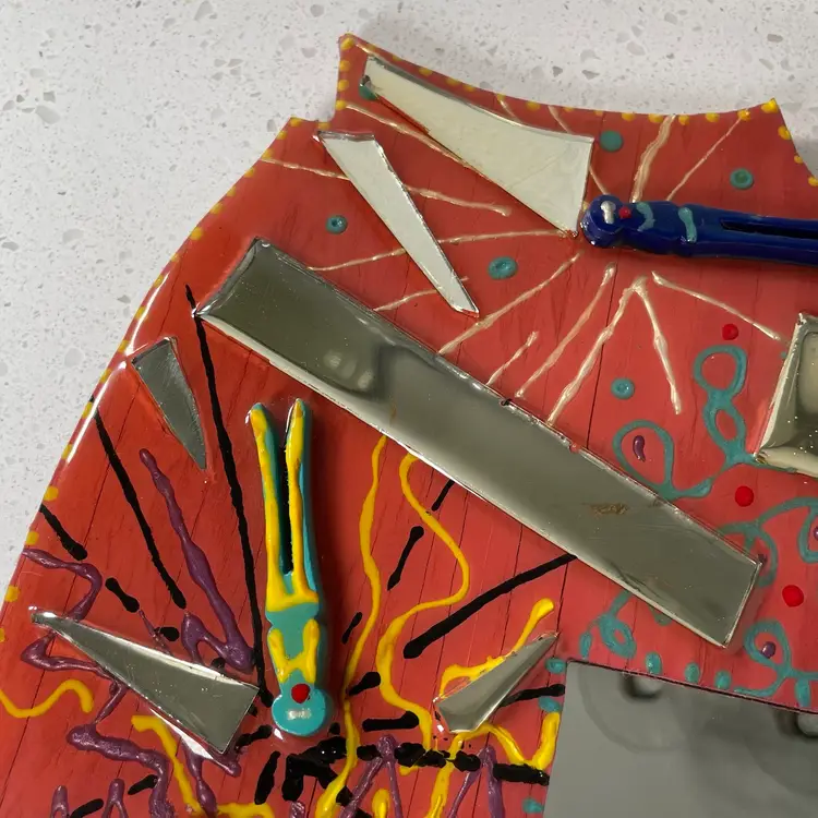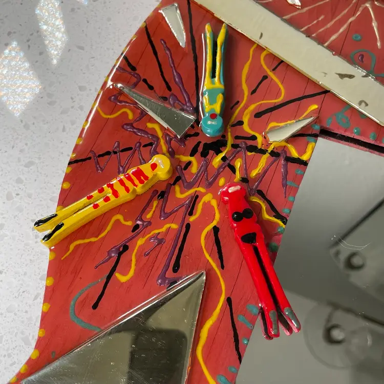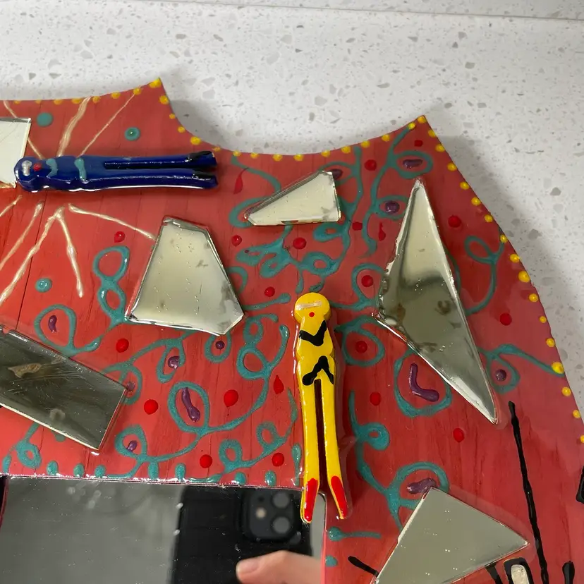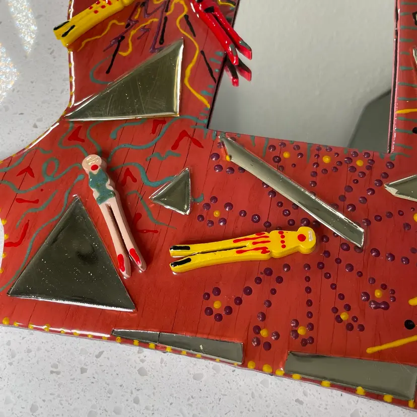 Awesome handmade folk art piece, can be hung from any direction. Signed K Laraine. Check my listings for a second eclectic mirror by this artist.