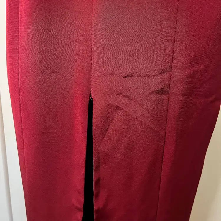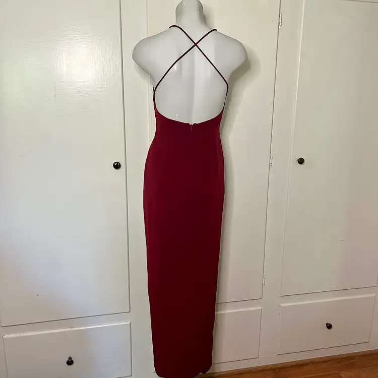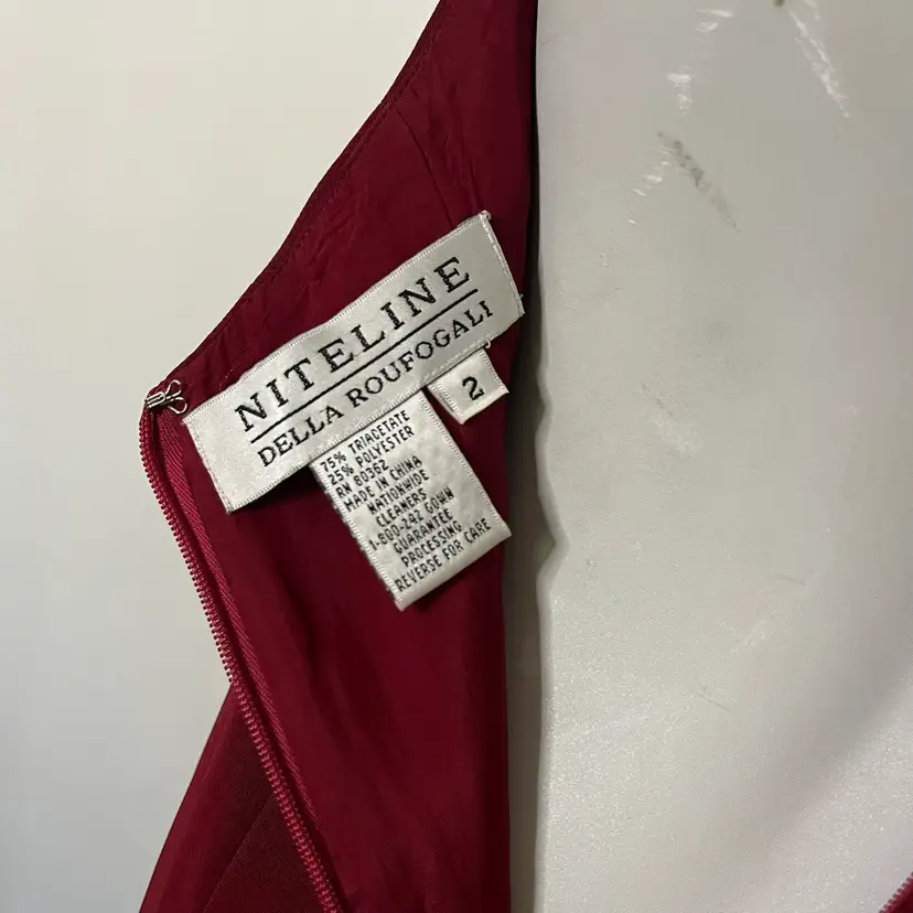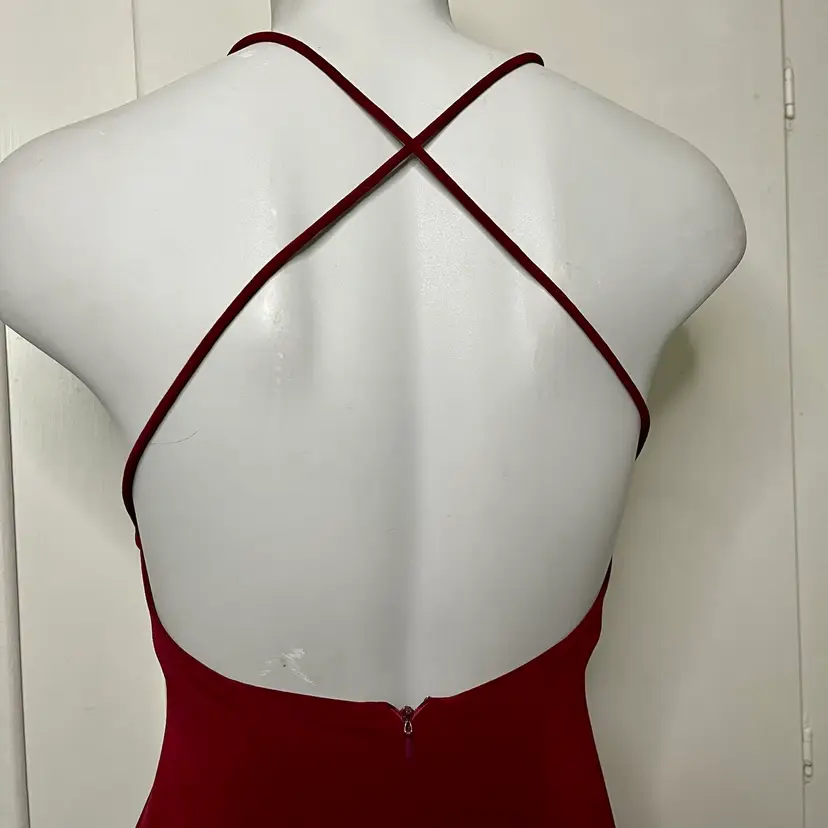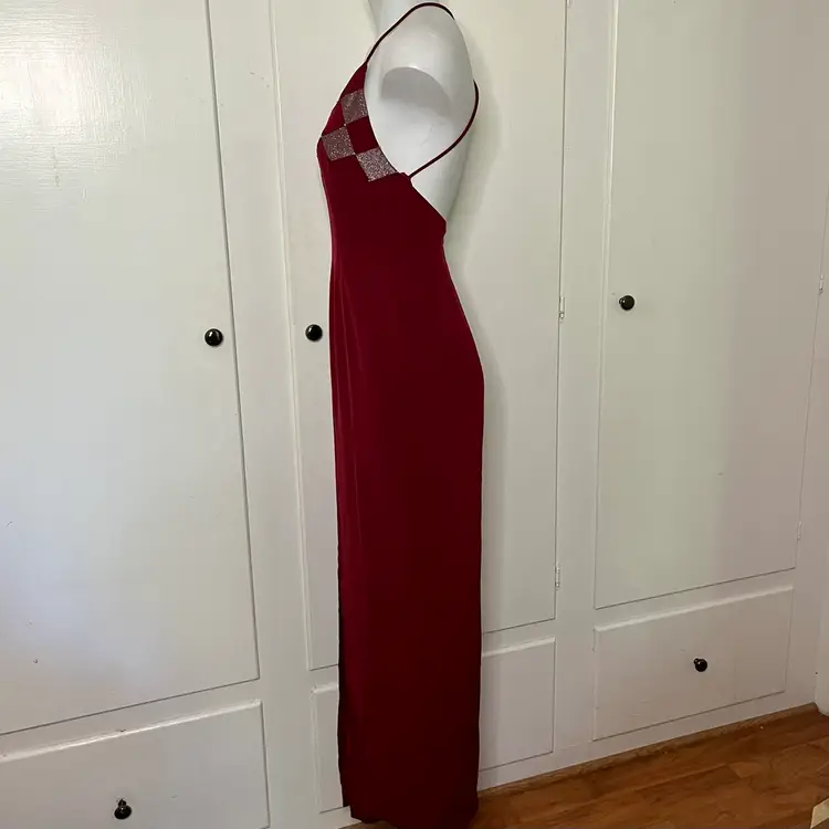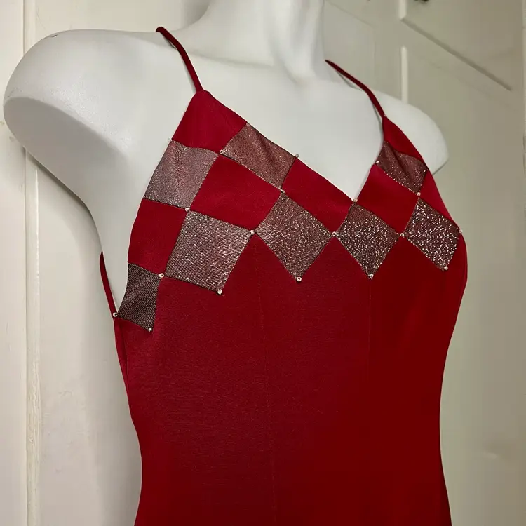 ✨Size 2 ✨Fully Lined ✨Metallic Harlequin print on the top with small clear beading details at the corners ✨Straps cross and leave the back open ✨Slit in the front 27” long ✨Center back zipper ✨Bust 32-34” ✨Waist 27” ✨Hip 38” ✨Length 60” ✨Great Preowned vintage condition no holes or stains