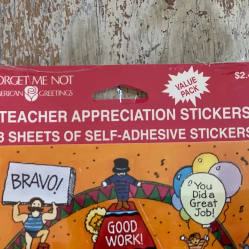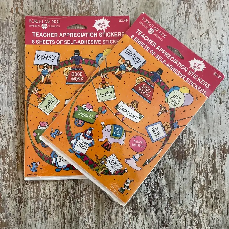 1993 Teacher Appreciation Sticker Pack with 8 sheets of Circus and Clown Theme positive encouraging sayings. 1993 by American Greetings. Great for your classroom, junk journaling or anyone who wants to share some good vibes.