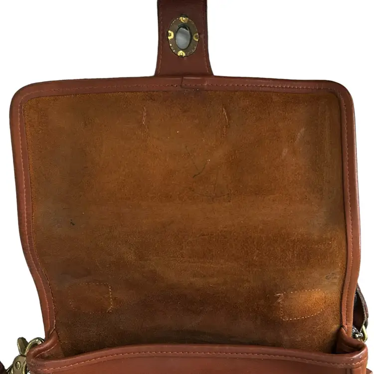•Made in USA •90s era •No. F5D-5130 •Removable strap •Glove-tanned cowhide leather •8.5” width / 9.5” height / 2.5” depth / 21” shoulder strap drop •Fair pre-loved conditon •Exterior callouts: leather hairline scratches, three distinct marks on front flap, white paint on back, missing coach hangtag •Interior callouts: Suede has scratches/discoloration, hairline scratches to interior leather, small stain spots