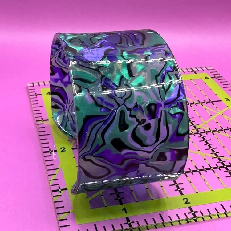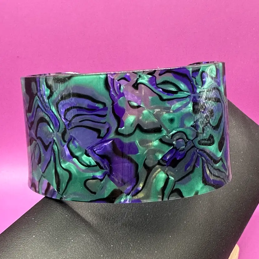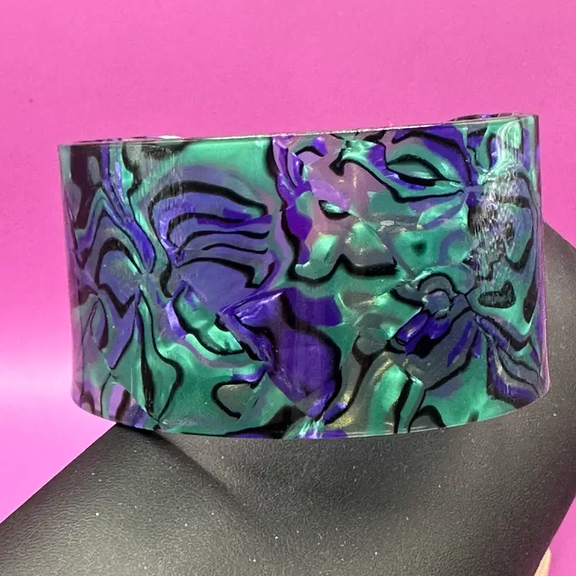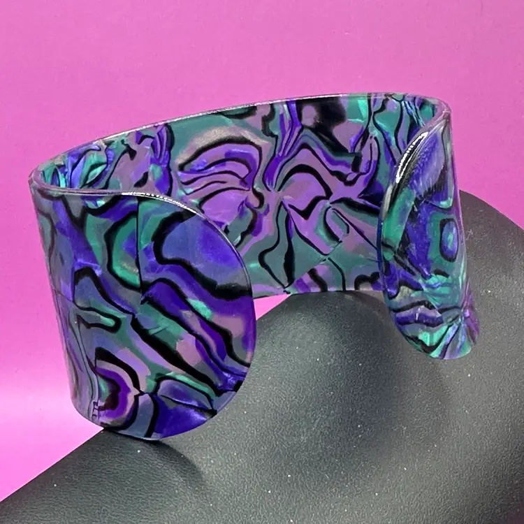 This bracelet is partially clear and includes green and purple swirl with black. It’s a marbled style.