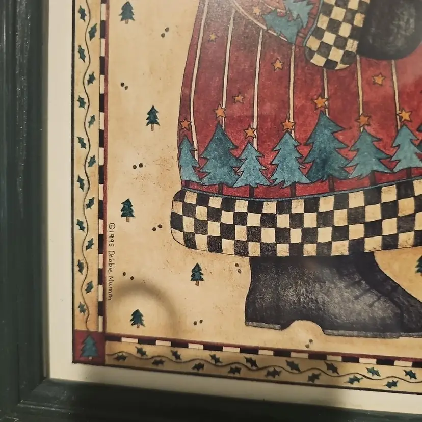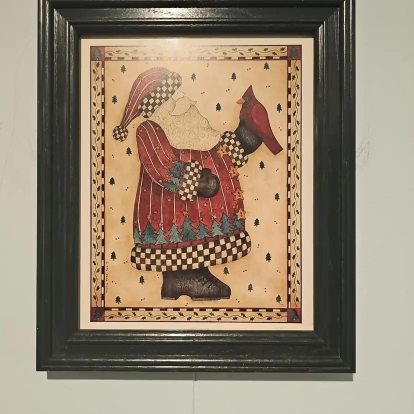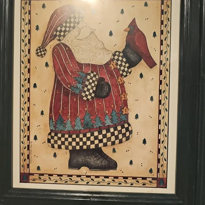 The art print is signed by Debbie Mumm and is an officially licensed reproduction from the late 20th century. The wall-mounted print is made of high-quality art print material and has a vertical orientation. This Santa-themed art print is a part of Debbie Mumm's Santa collection, making it a perfect addition to your holiday and seasonal wall decor.