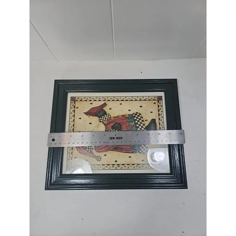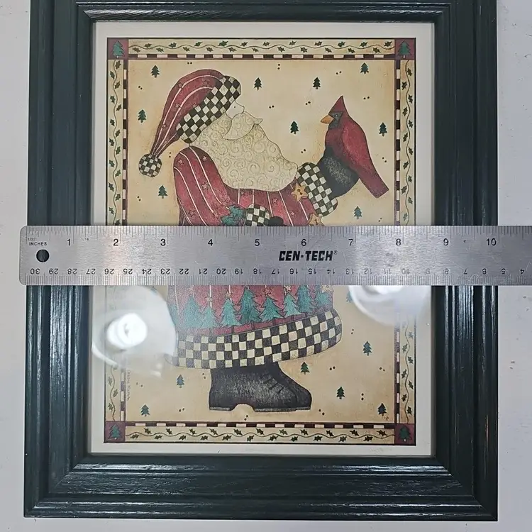 This beautiful medium-sized rectangular art print by Debbie Mumm is perfect for Christmas wall decor. The framed print features an all-over pattern of Santa in his classic pose, with his bag of gifts slung over his shoulder. The artwork has a folk art style, with vibrant and multicolor paint finish, making it suitable for teens, adults, and kids alike.