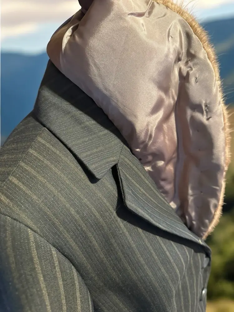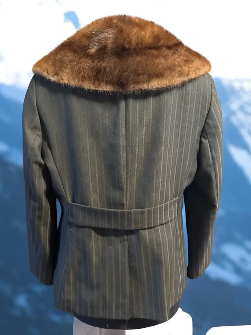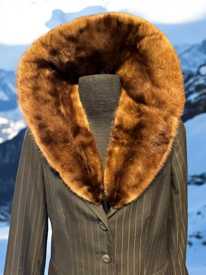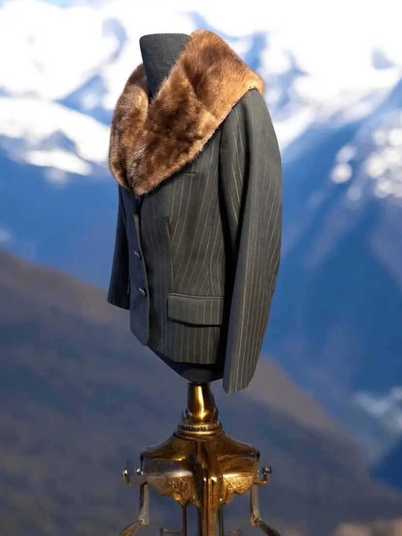 This is a darling Vintage, 90’s pinstripe jacket that has been up cycled with a real mink, big wide collar. The Pin striped jacket is so classy as a faux belt on the back. Has three buttons up the front .. pockets on each side. The material has a nice shimmery design. The big mink collar can be worn up or down. It’s been hand stitched onto the coat professionally It is made by KASPER. Smoke and pet free .. the jacket is in great condition .. the inside lining in the sleeves at the bottom could be tacked a little tighter … Falls at the waist.Marked a Sz 6P .. measurements 36 bust, 34 waist, 21 in sleeve, and 23.5 in long the mink collar is 5.5 in wide .