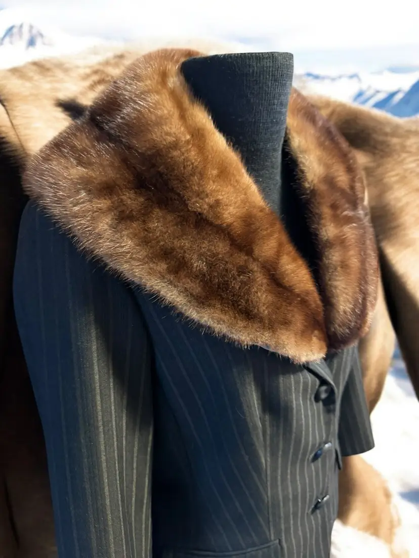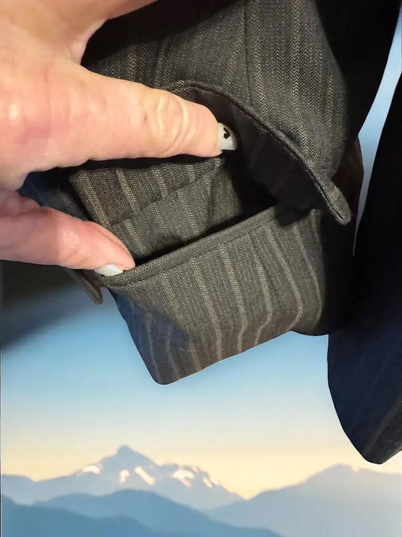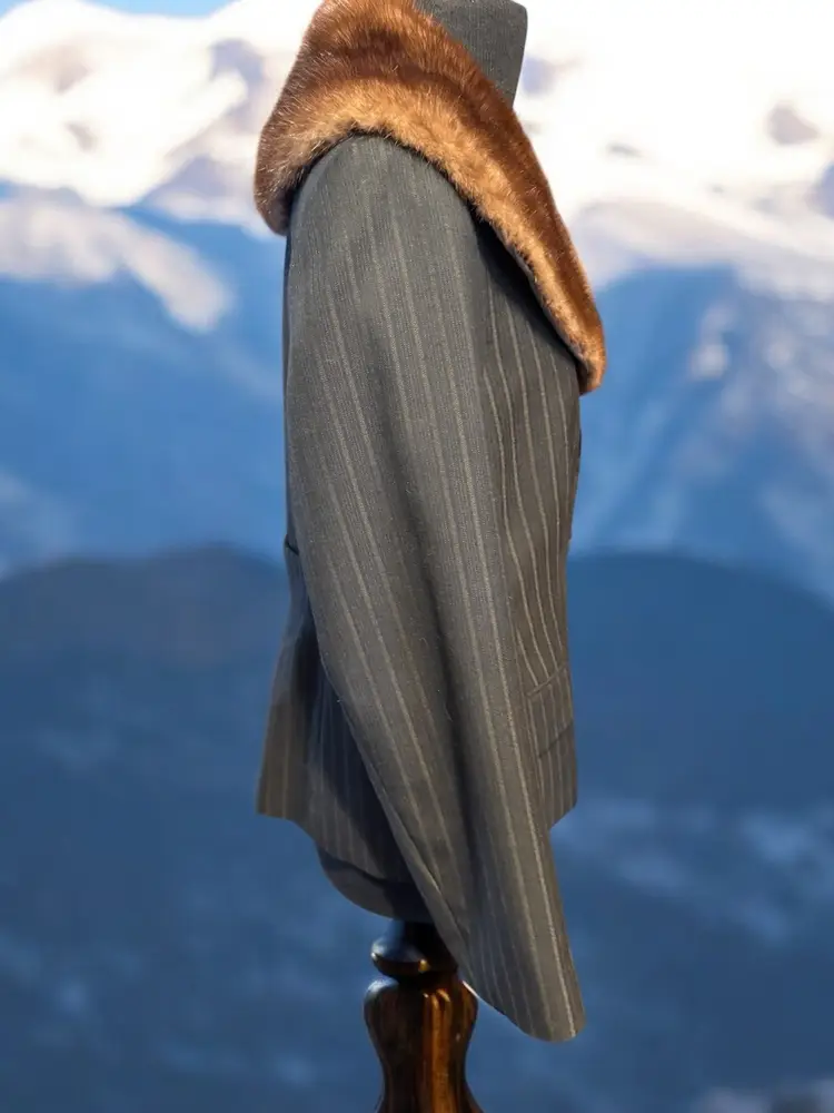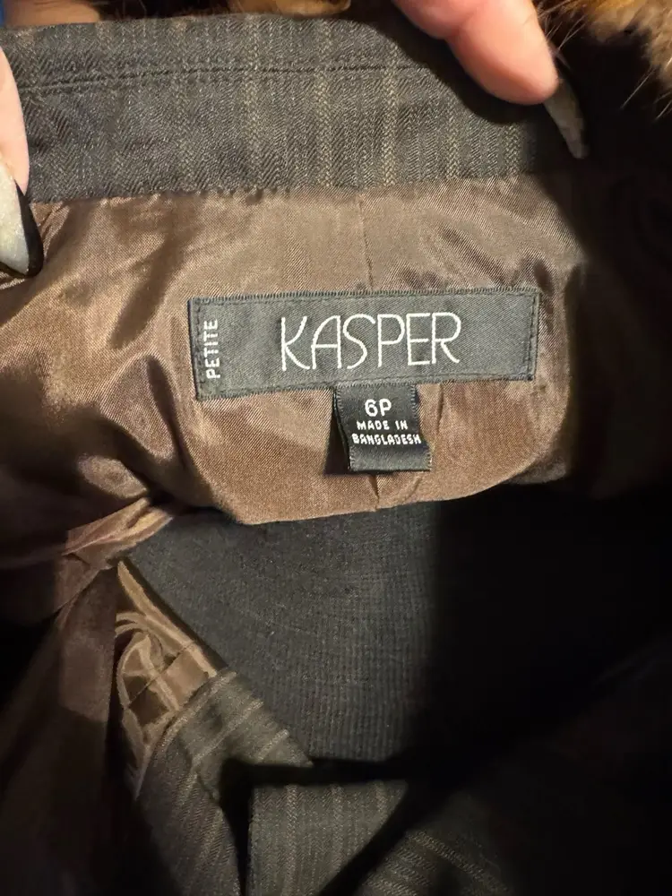 This is a darling Vintage, 90’s pinstripe jacket that has been up cycled with a real mink, big wide collar. The Pin striped jacket is so classy as a faux belt on the back. Has three buttons up the front .. pockets on each side. The material has a nice shimmery design. The big mink collar can be worn up or down. It’s been hand stitched onto the coat professionally It is made by KASPER. Smoke and pet free .. the jacket is in great condition .. the inside lining in the sleeves at the bottom could be tacked a little tighter … Falls at the waist.Marked a Sz 6P .. measurements 36 bust, 34 waist, 21 in sleeve, and 23.5 in long the mink collar is 5.5 in wide .