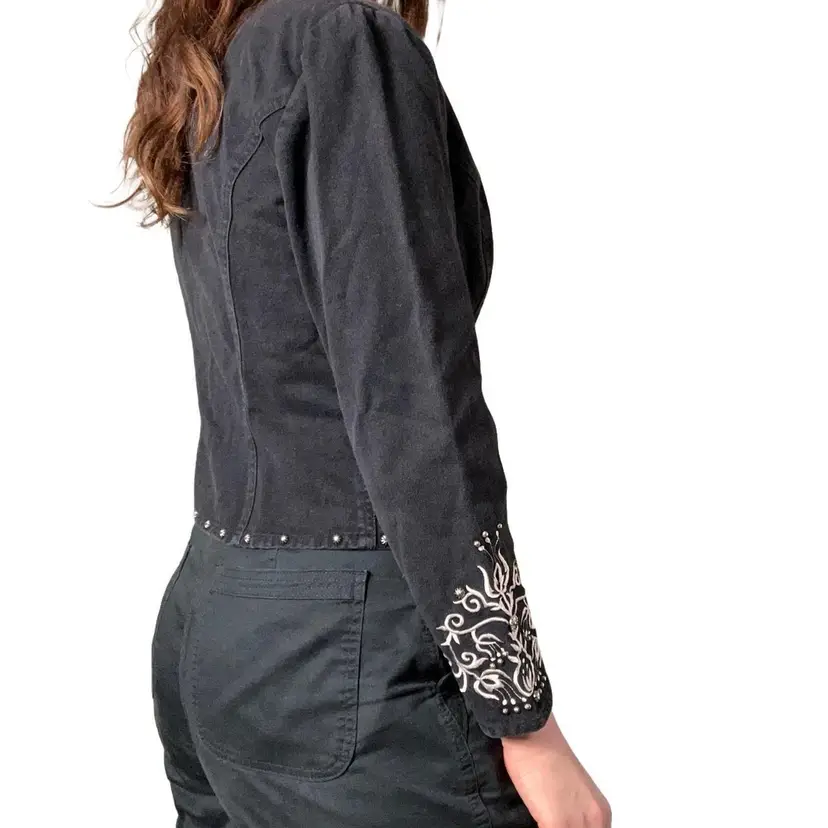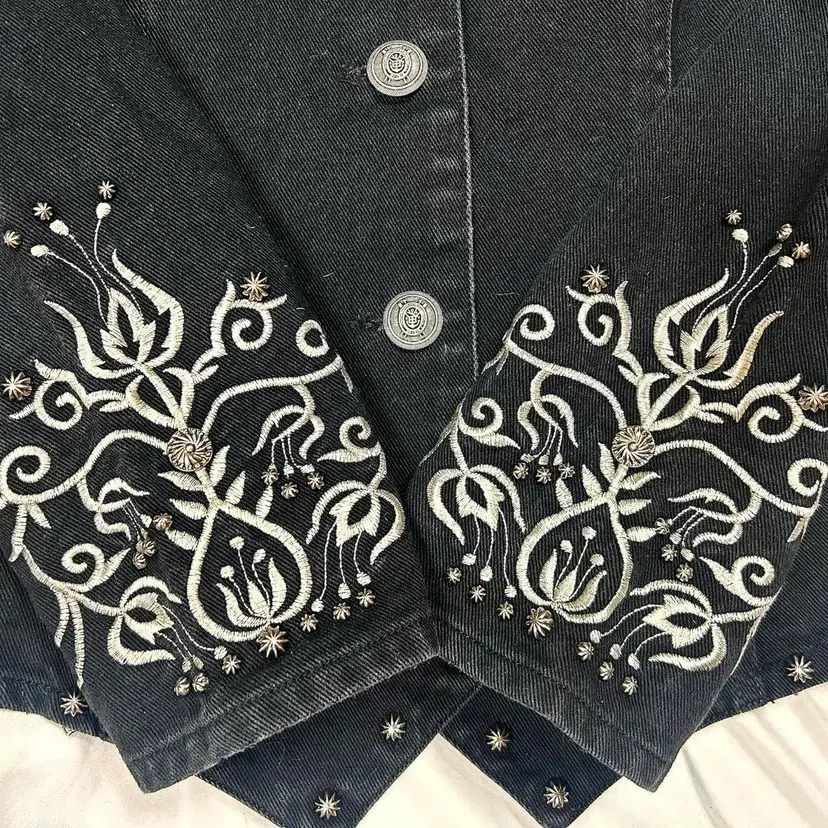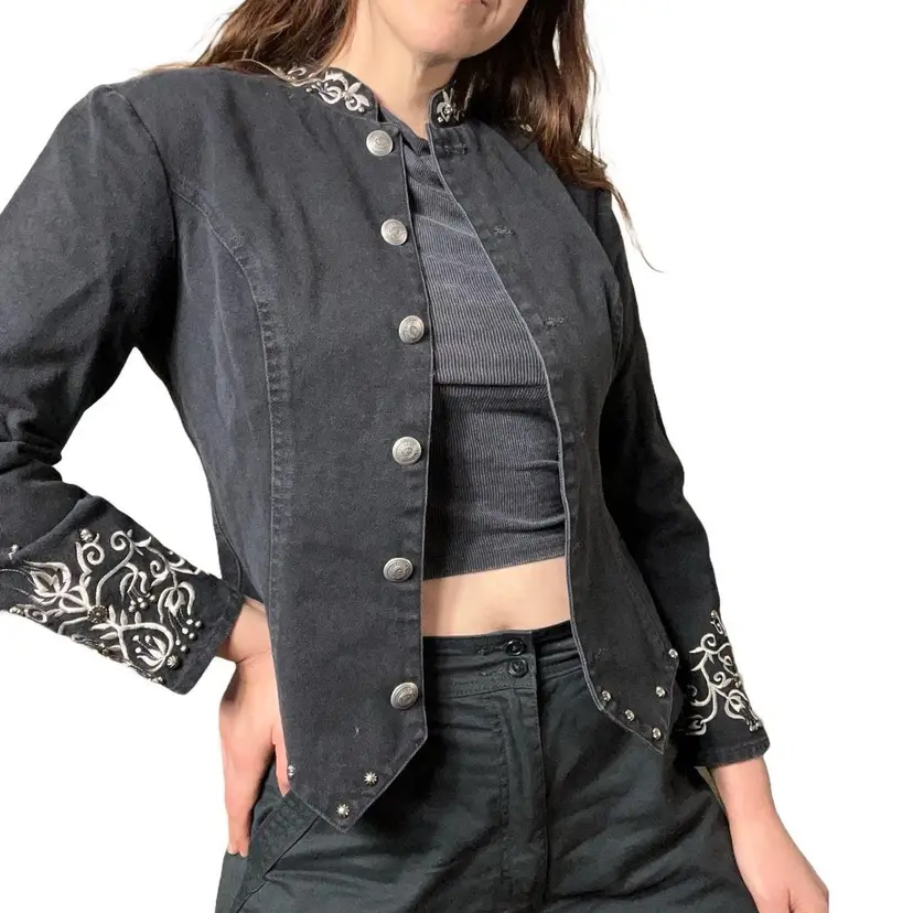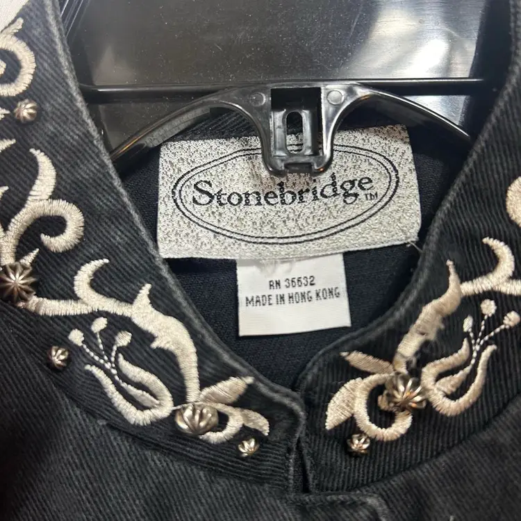 Vintage 90s Stonebridge Western dark grey denim jacket with silver embroidery and silver buttons. Very cool jacket!! Has light shoulderpads. No size shown but best for XS/S. 100% cotton. Great condition!! PTP: 16.5” / 33” doubled Length: 22” Sleeve Length: 22”