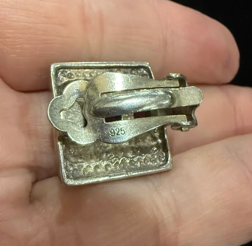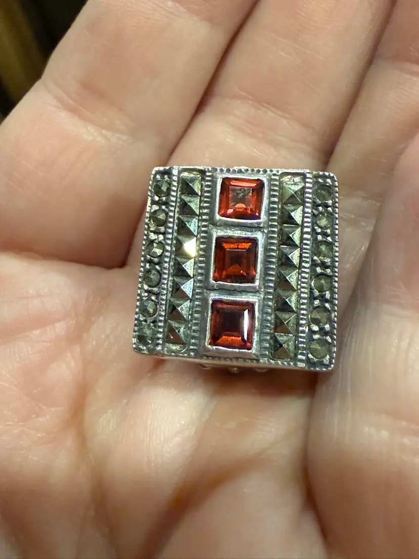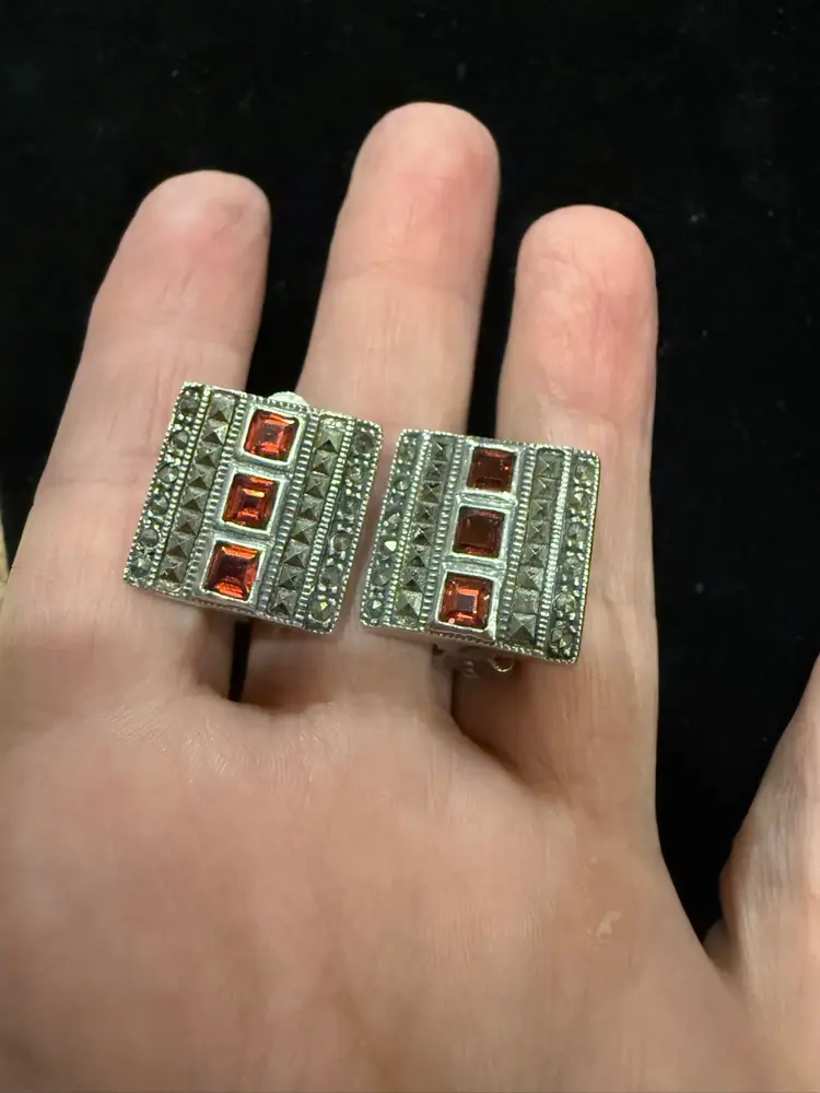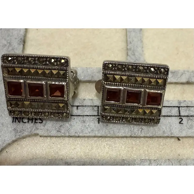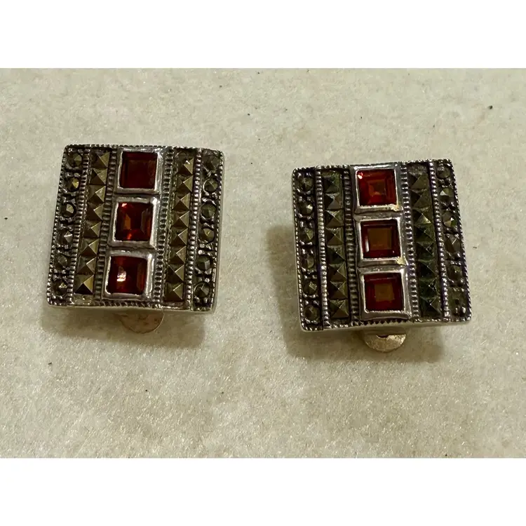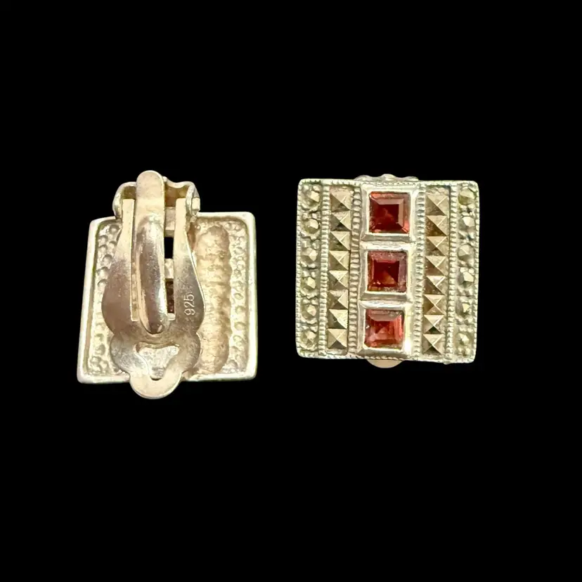 These vintage 925 sterling silver earrings feature six genuine garnets in a square shape with an excellent cut grade. The bezel setting style highlights the natural beauty of the gemstones, which are not enhanced. The clip-on earrings have a diameter of 1.7 inches and are signed by the maker. 02253