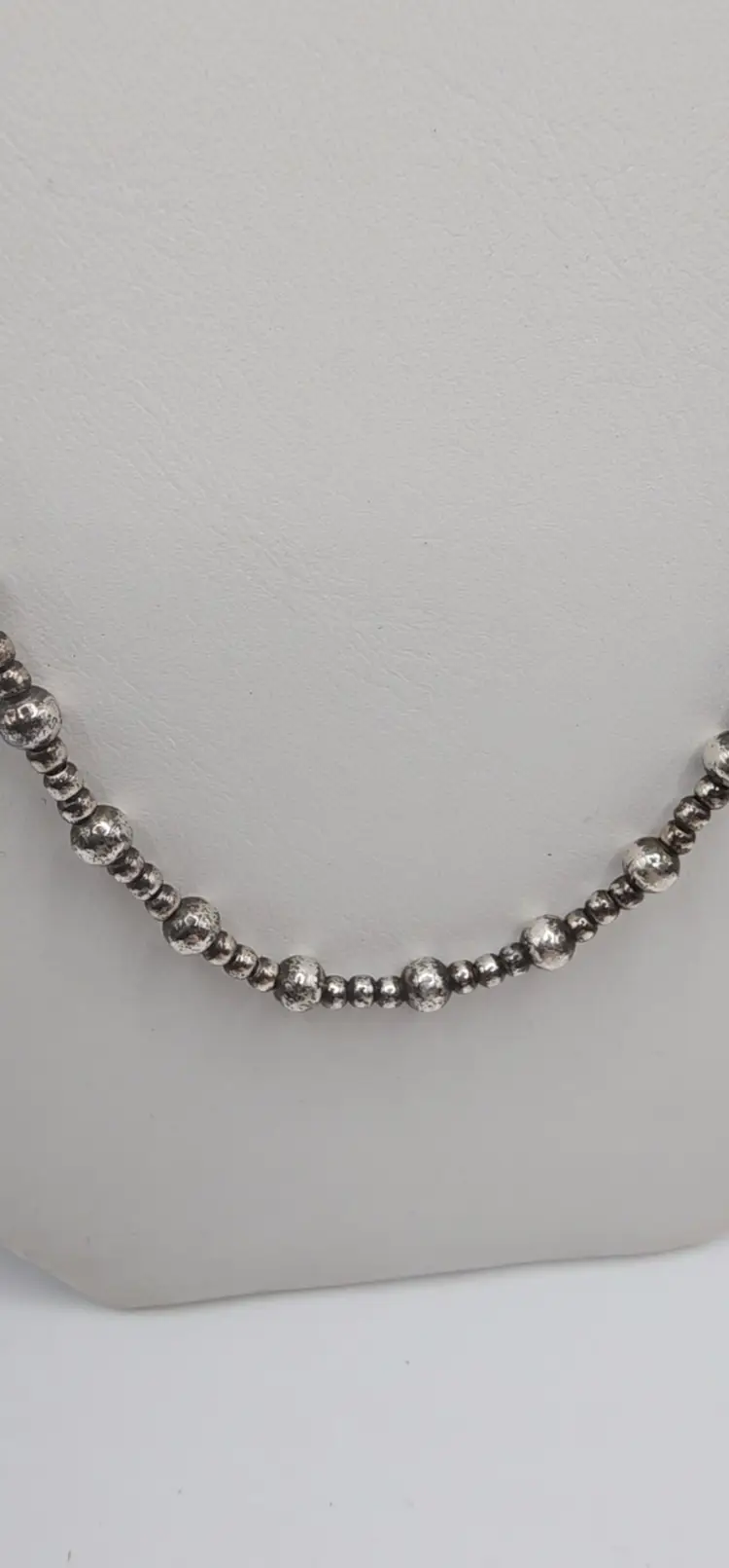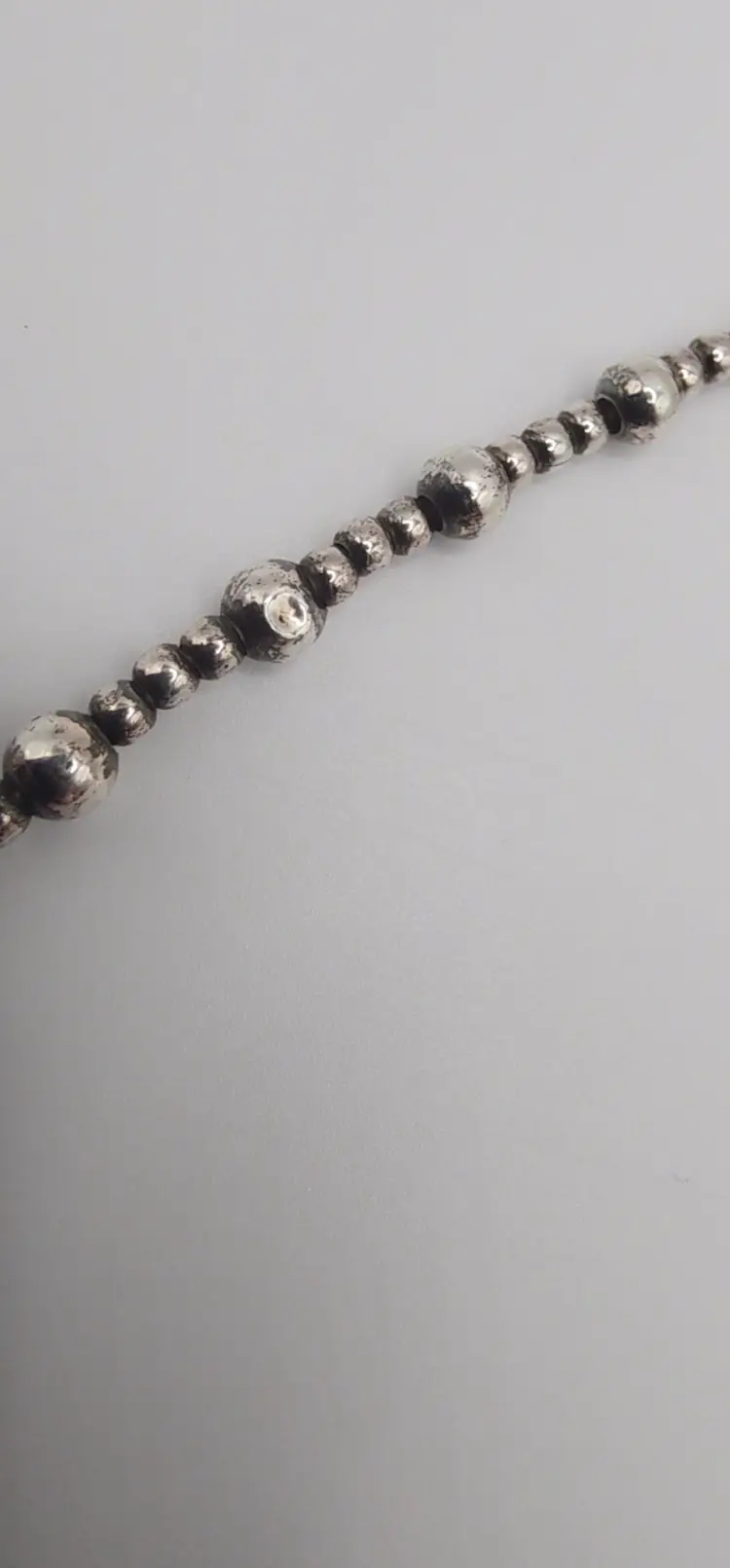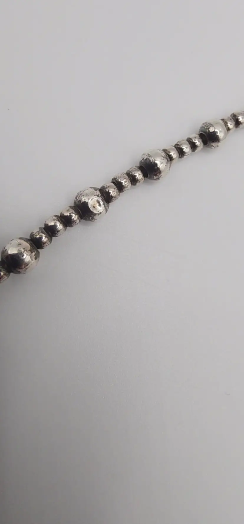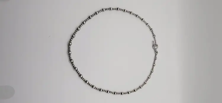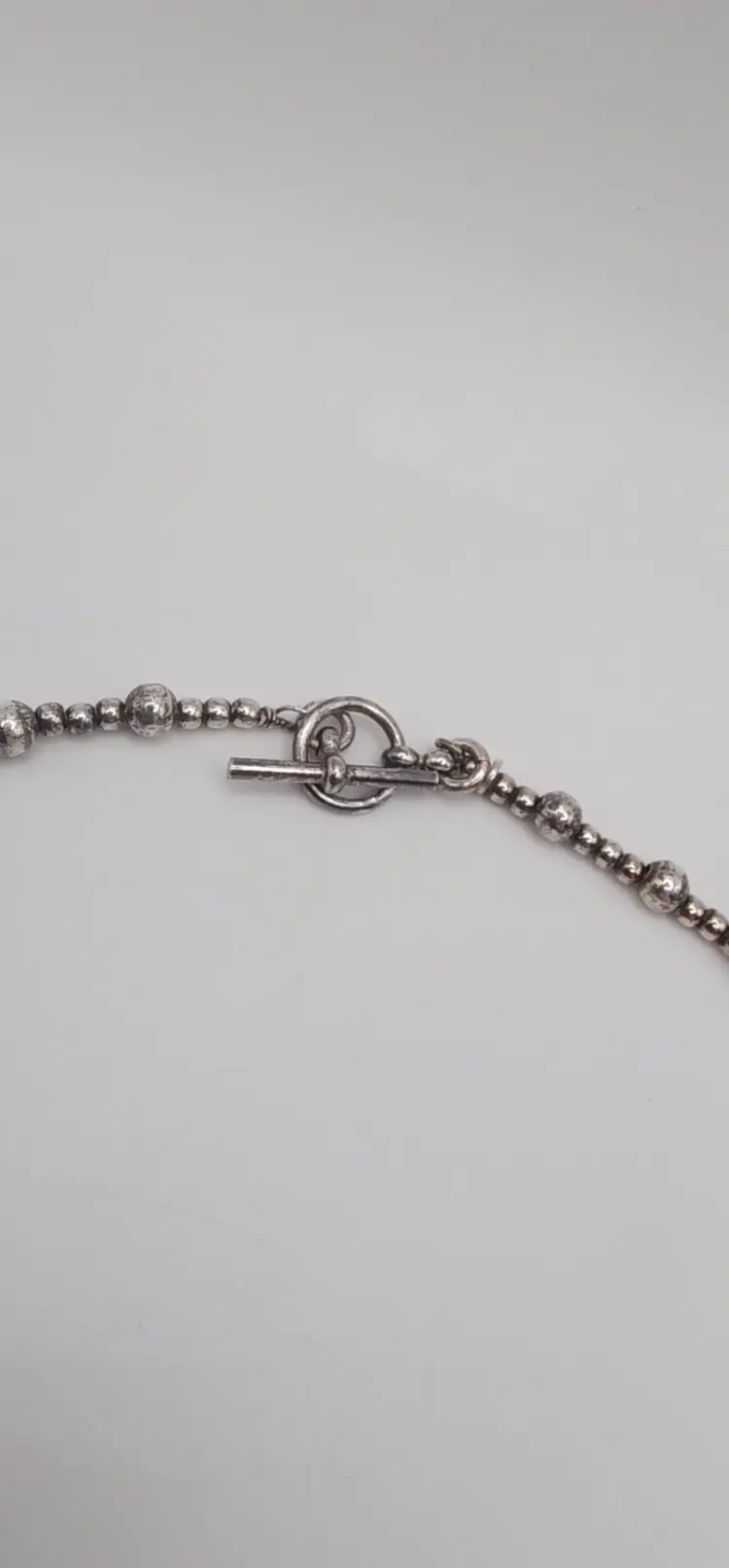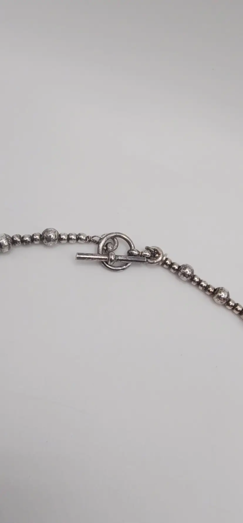 Beautiful 925 beaded necklace with a Toggle clasp. 18" and 14.8 grams. There is a dent on one of the beads. Please see all pics. I have not shined this, but if interested I can for an added amount. Please let me know prior to purchase. Thanks!