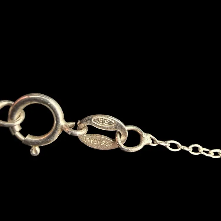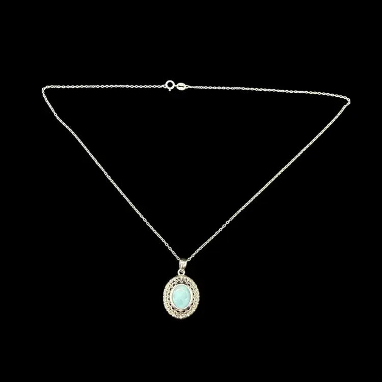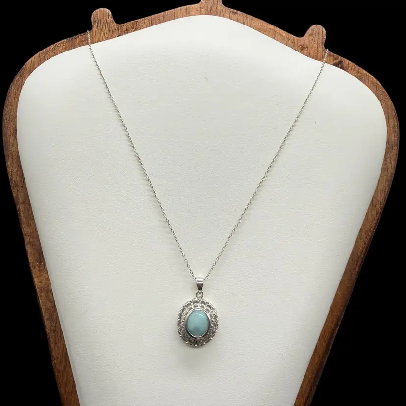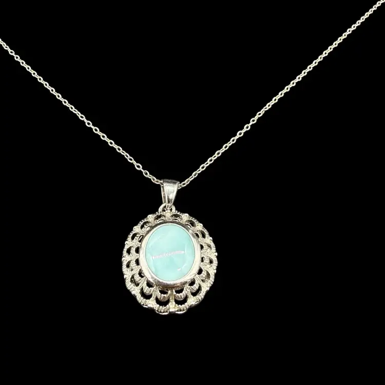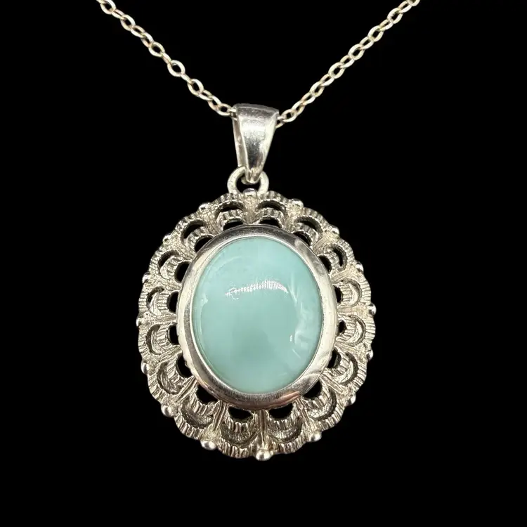 This Vintage 925 Sterling Silver Larimar Cabochon Pendant Necklace from Italy features an oval-shaped pendant with a natural blue Larimar stone sourced from the Dominican Republic. The necklace has a spring ring closure and is crafted from sterling silver with a bezel setting. The pendant exudes a beauty and nature theme, making it a stunning and unique piece of fine jewelry.