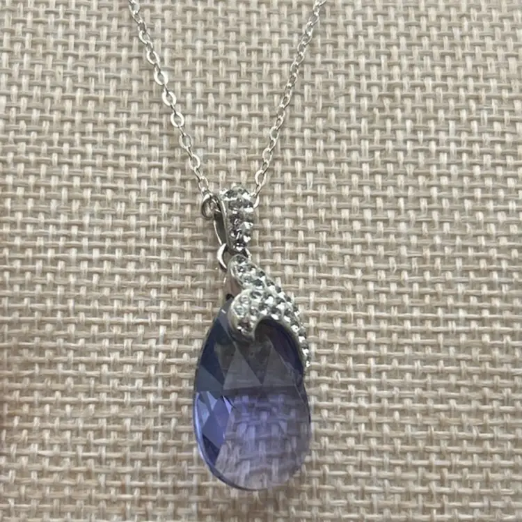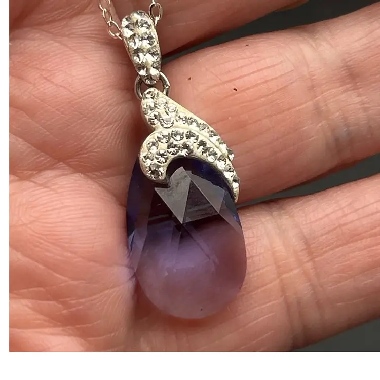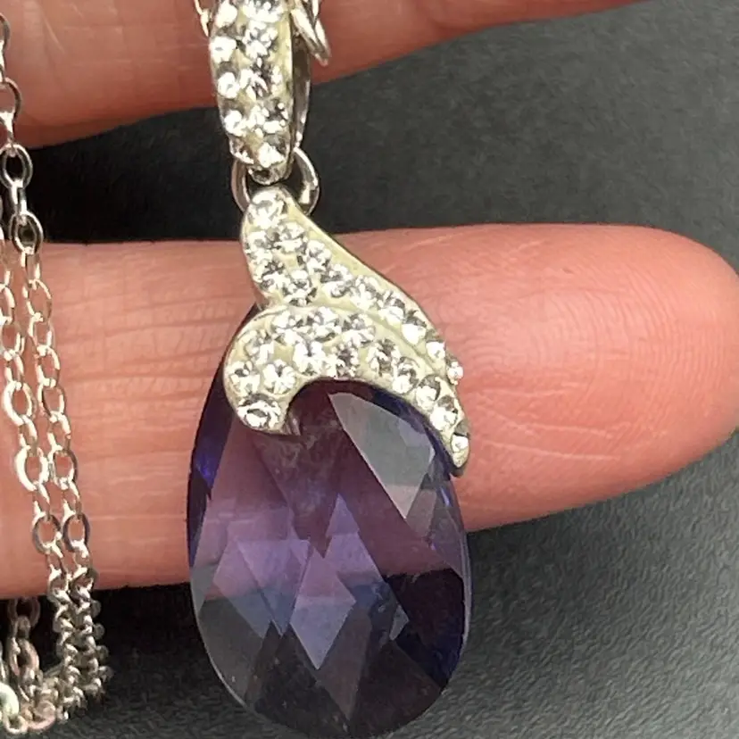 Notable Details: • Stamped 925 sterling silver chain (17” length) • Faceted amethyst glass teardrop pendant • Rhinestone accents on bail and flourish design • Pendant drop approx. 1.25” • Classic, feminine, and elegant vintage style