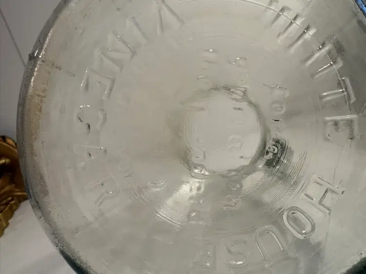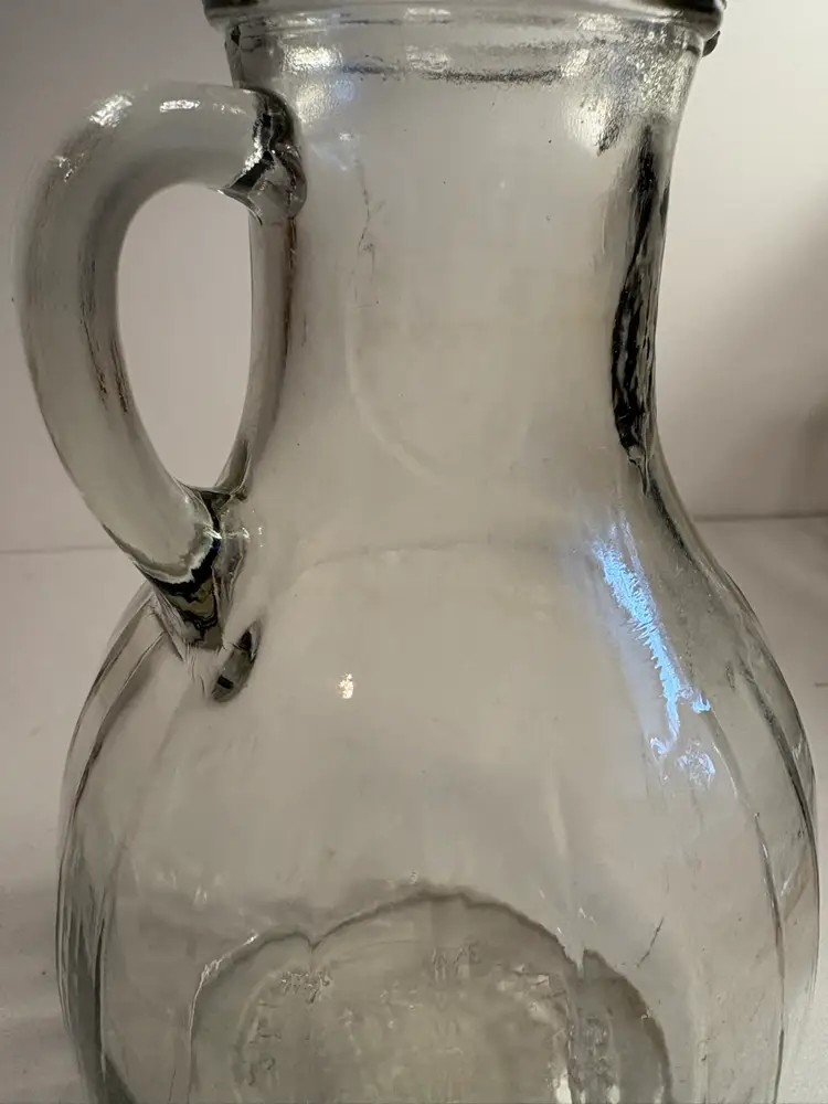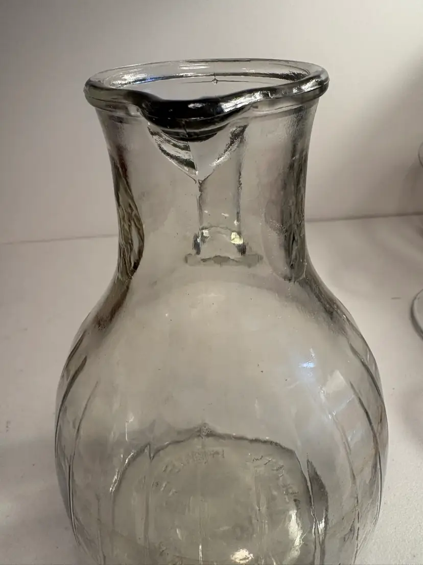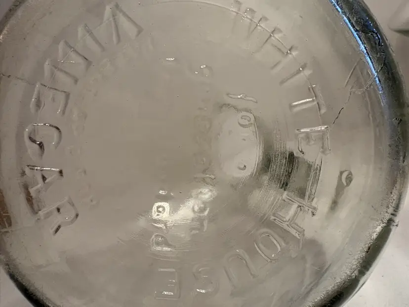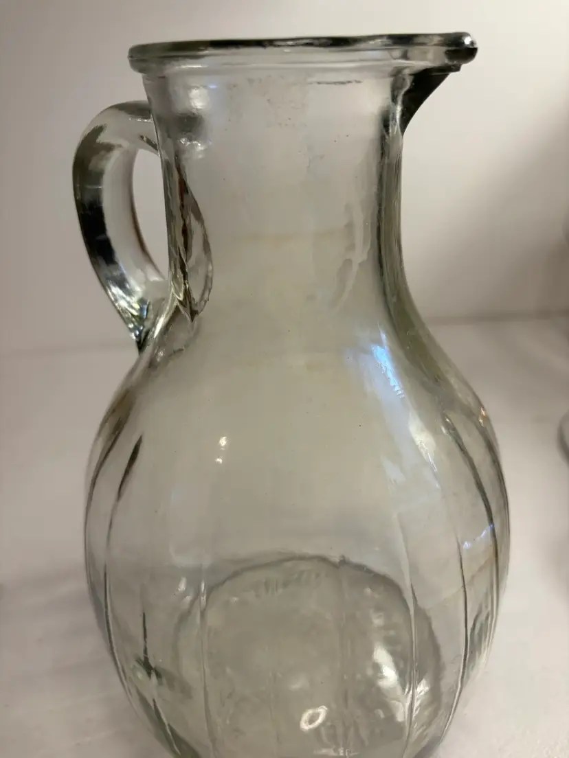 This vintage White House Vinegar clear glass pitcher jug stands at 9.5 inches tall, making it a unique and eye-catching piece for any kitchen or collector's display. The pitcher's sleek design and classic color add a touch of elegance to dinnerware and serveware collections. Crafted from high-quality glass, this pitcher is both durable and stylish, perfect for serving beverages or displaying as a decorative item in the home.
