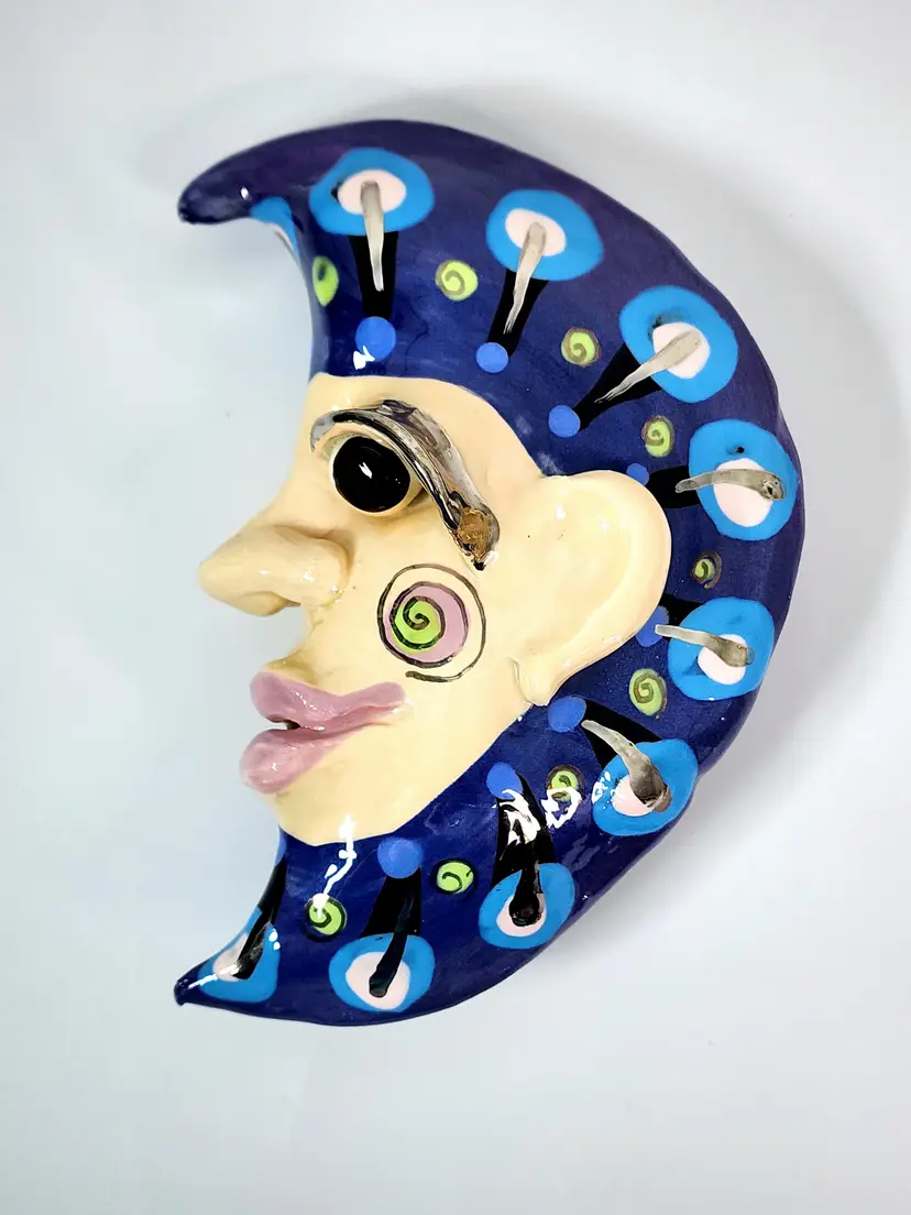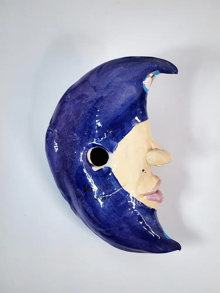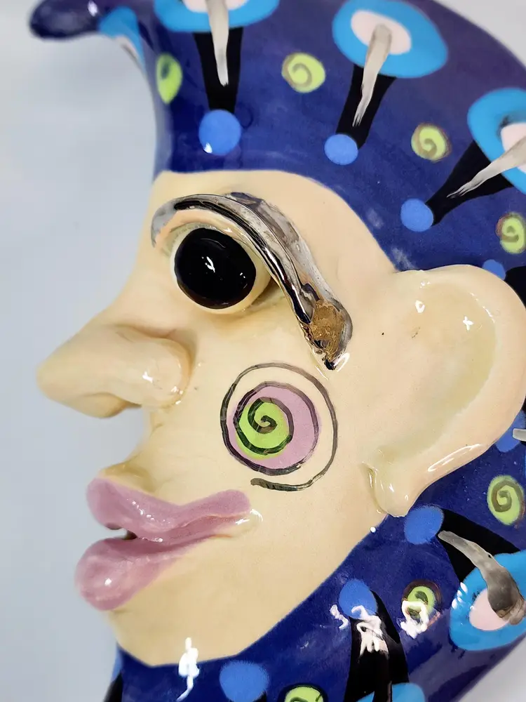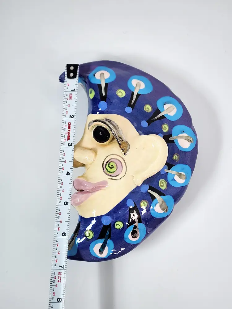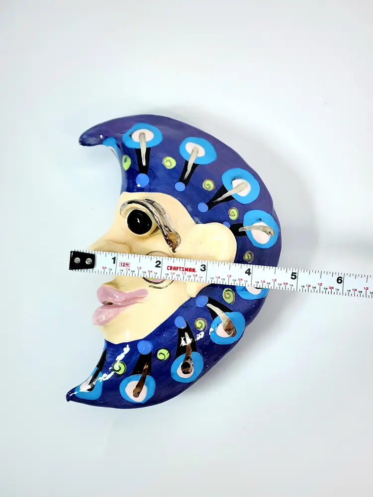 Vintage 1996 Anthropomorphic Chalkware Moon wall decor. Hand made, hand painted, glazed. Signed and dated by Laurie Schinko. Measurement: 7" x 5" Condition: very good.