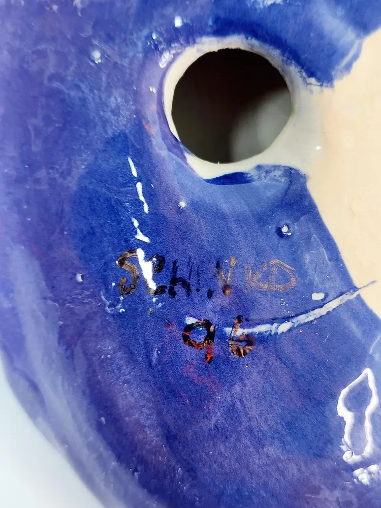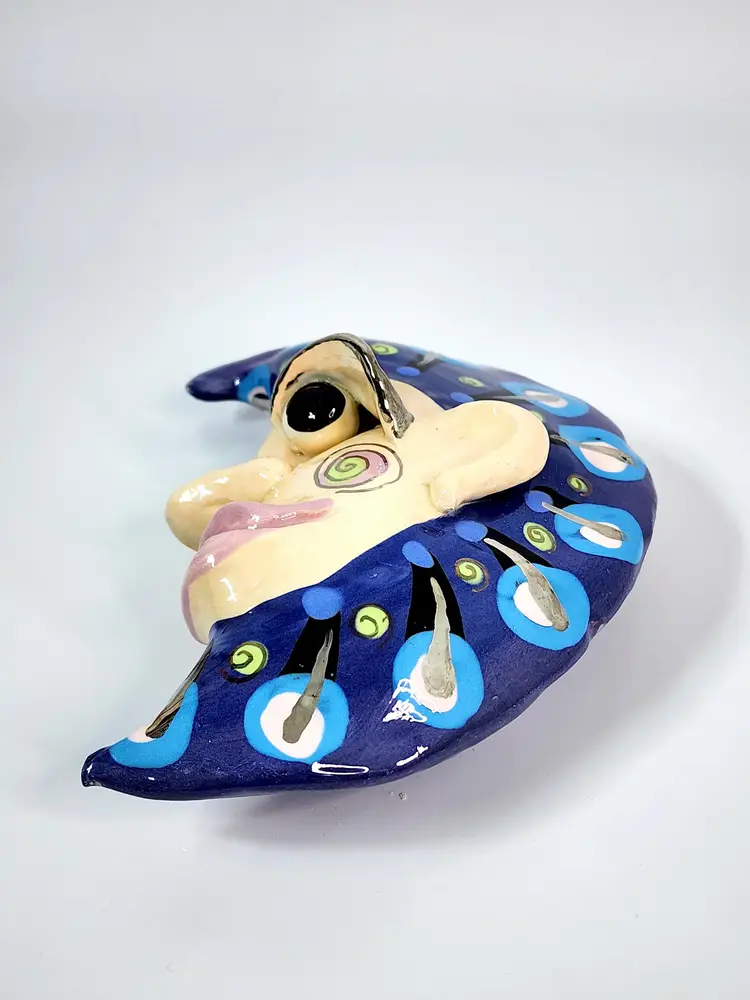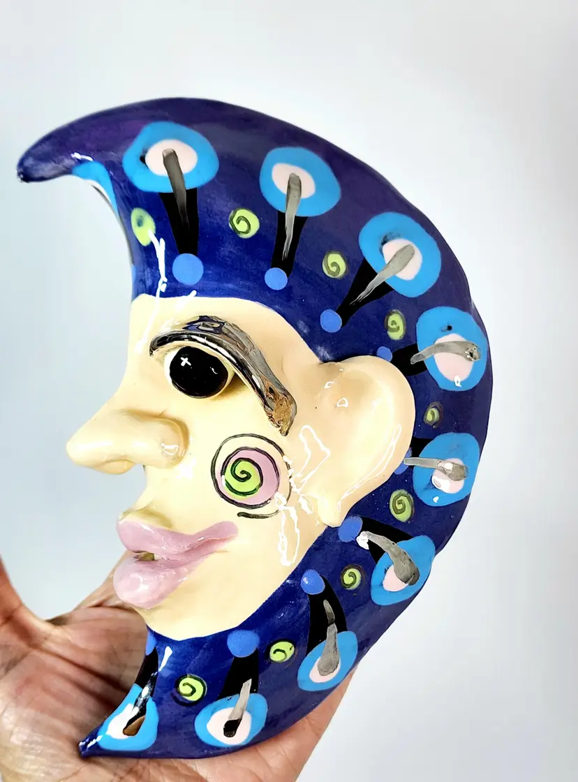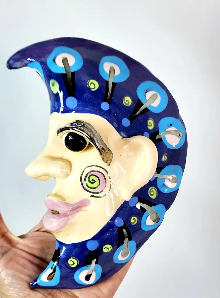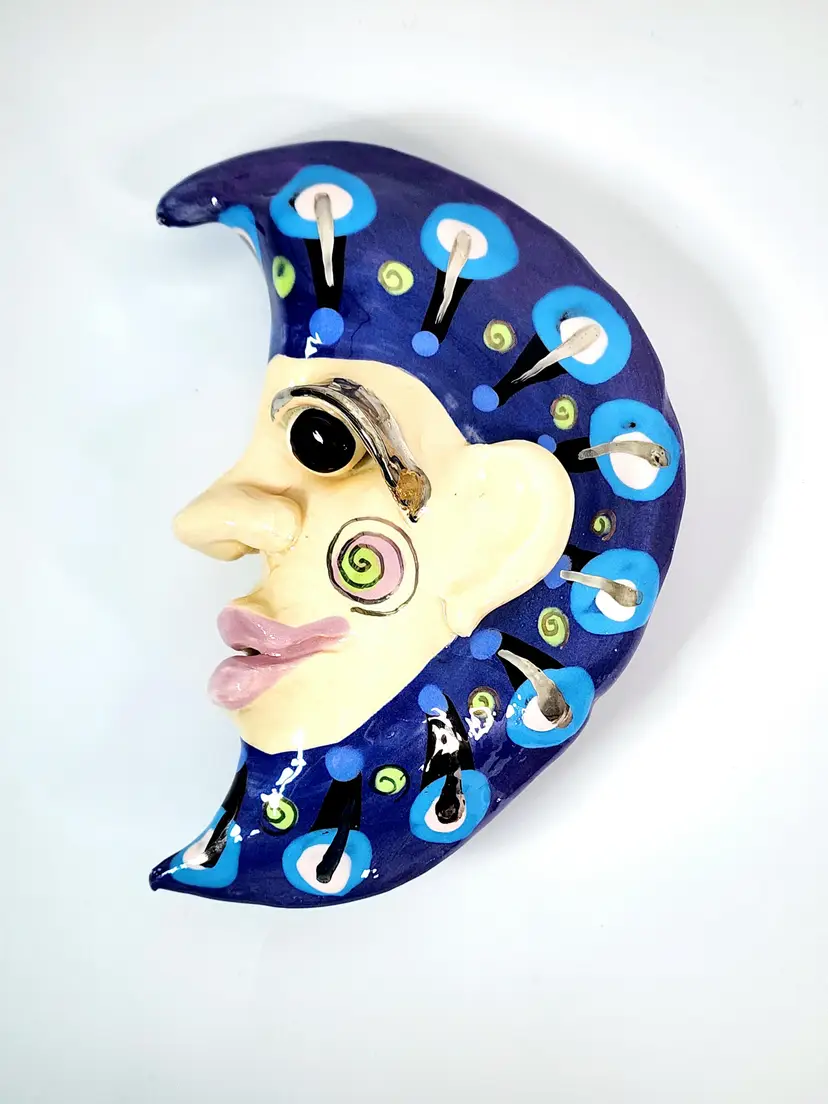 Vintage 1996 Anthropomorphic Chalkware Moon wall decor. Hand made, hand painted, glazed. Signed and dated by Laurie Schinko. Measurement: 7" x 5" Condition: very good.