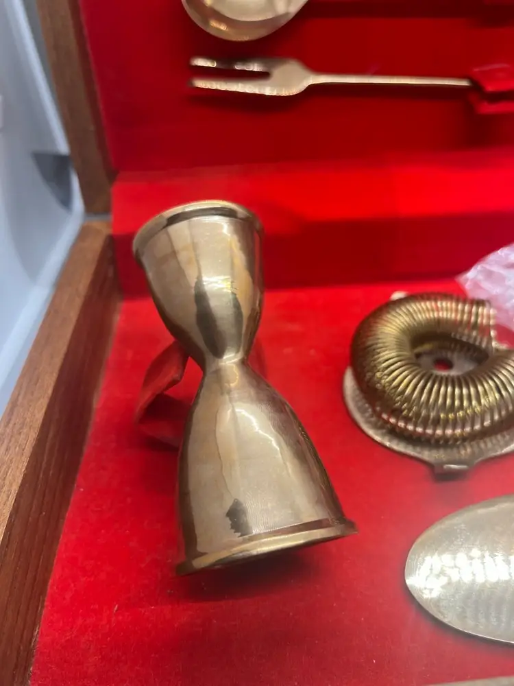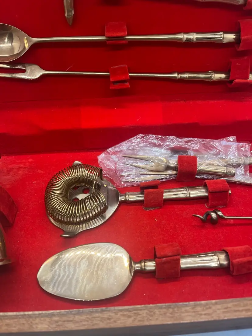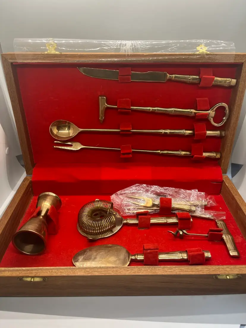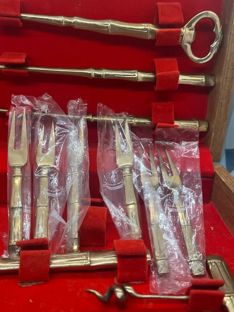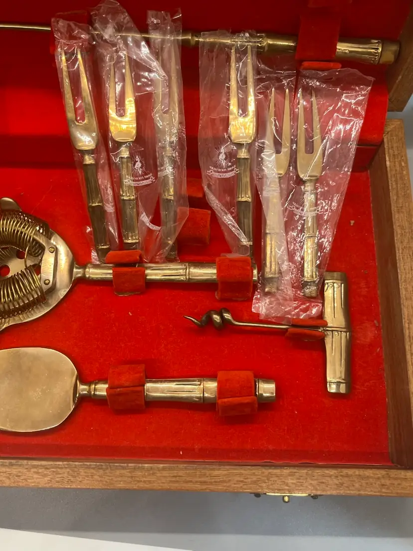 Vintage Thai Bronzeware in original case in excellent condition. 9 piece bar ware. Forks are still sealed in original bags.