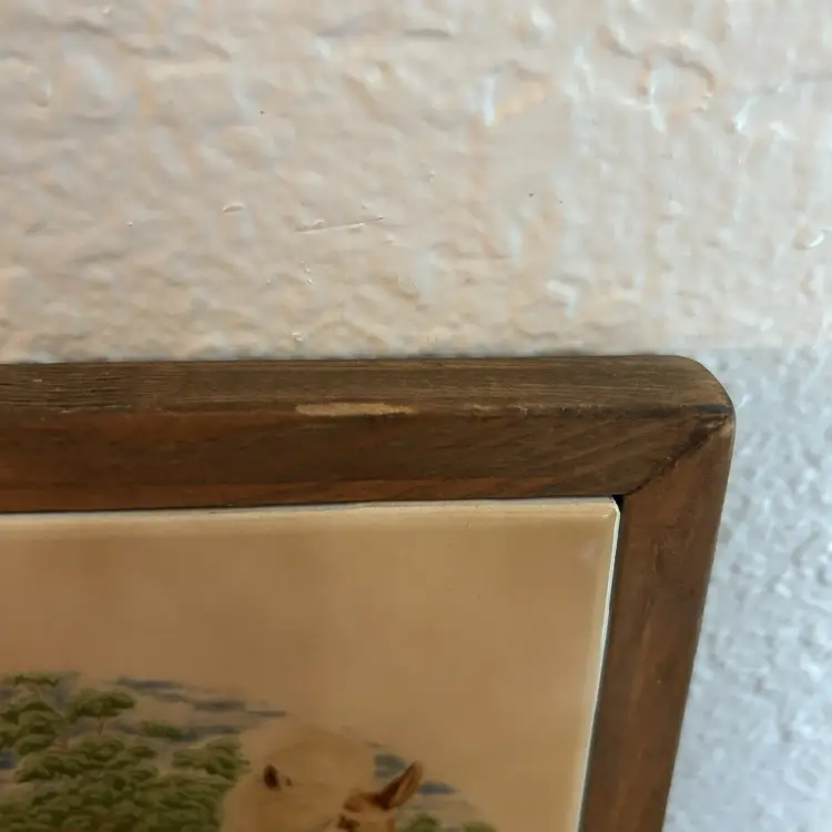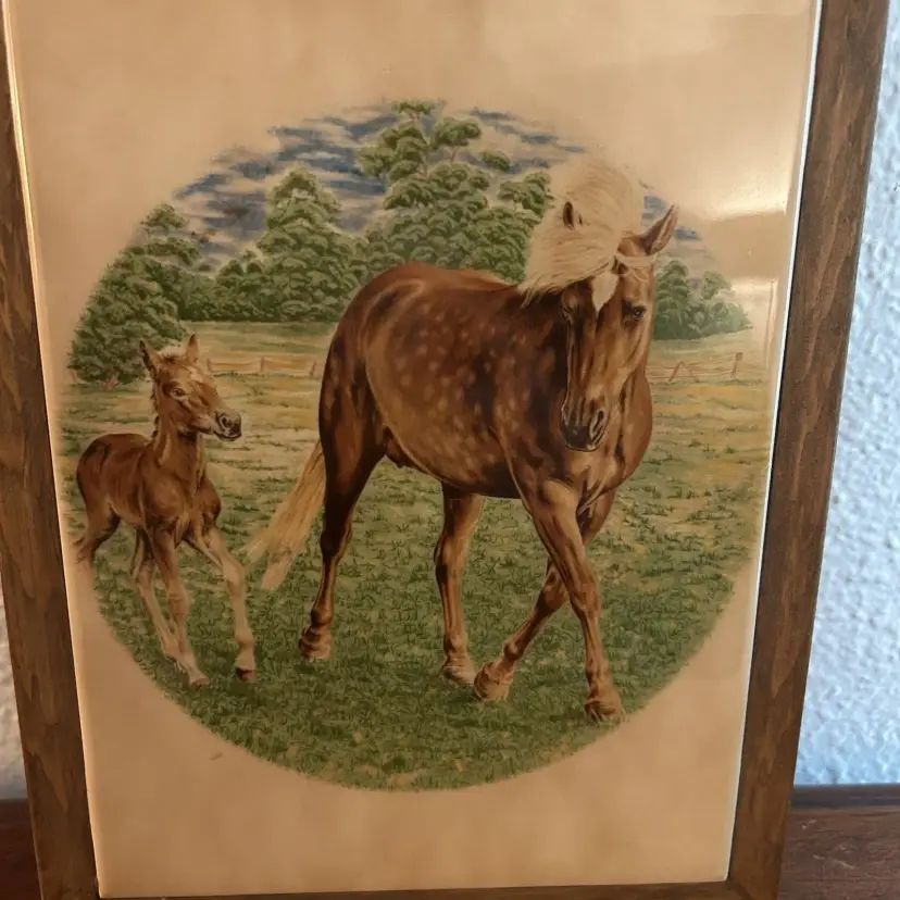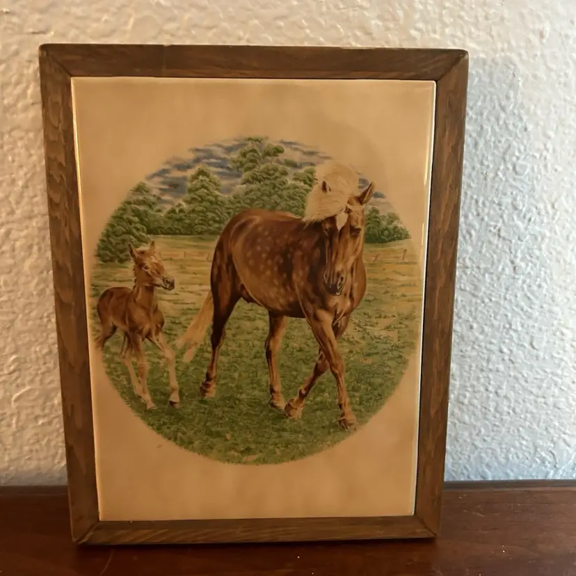 Vintage 9x7 Ceramic Tile Trivet Horse & Foal Wood Frame Western Country Decor