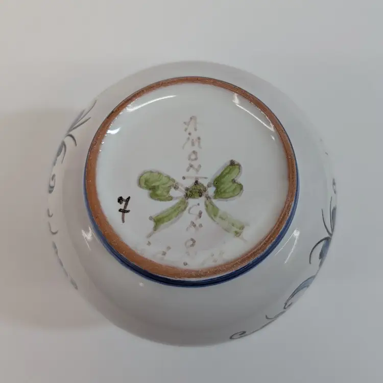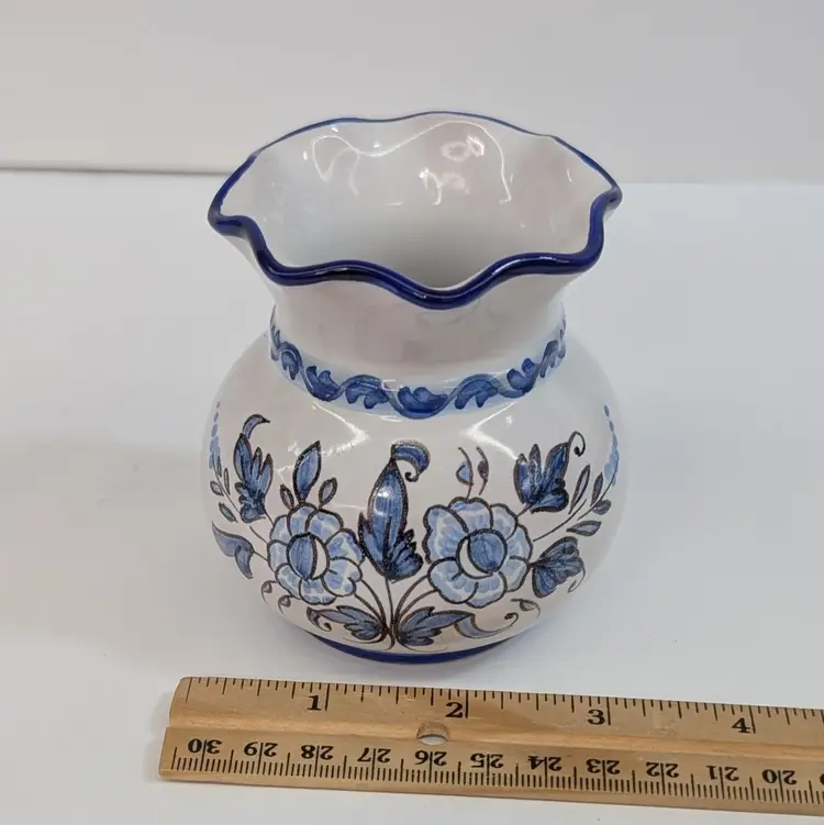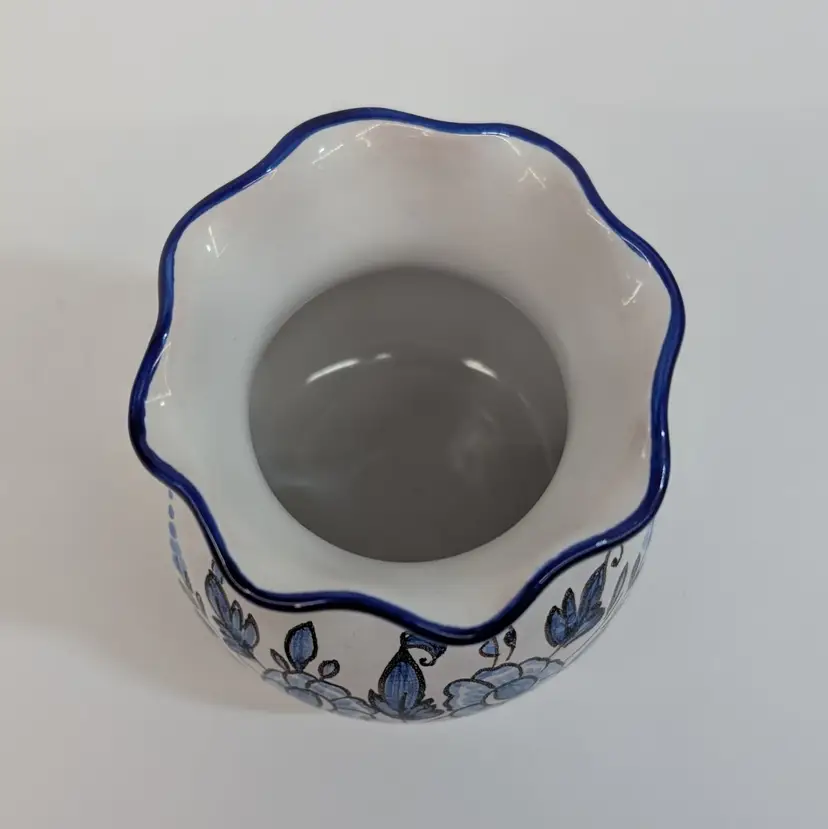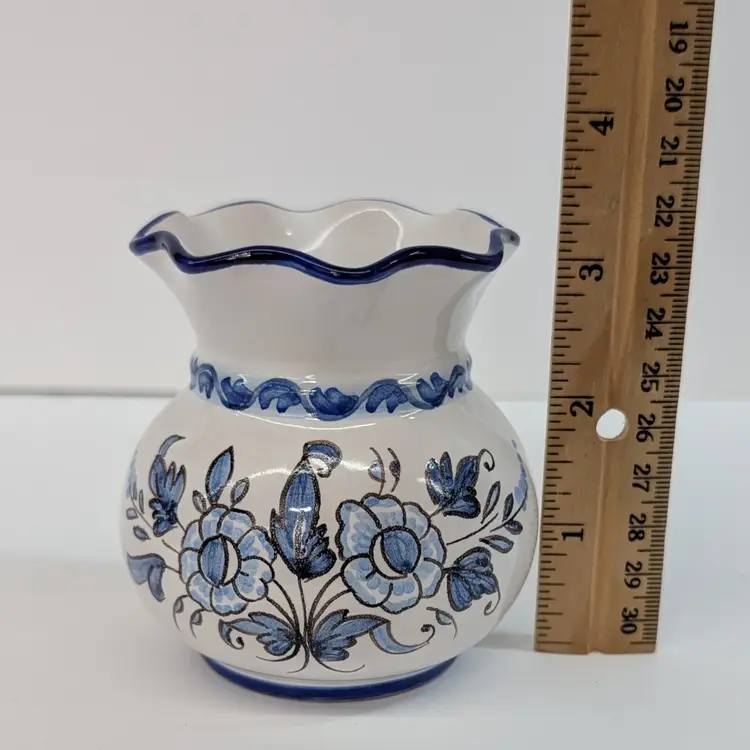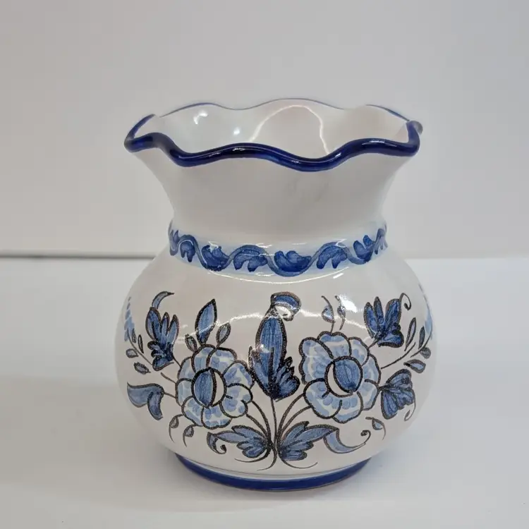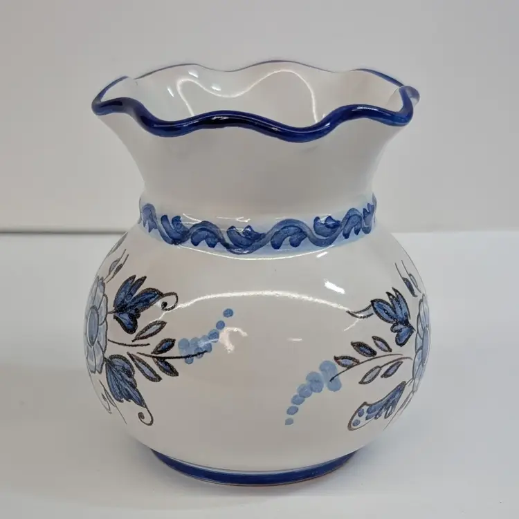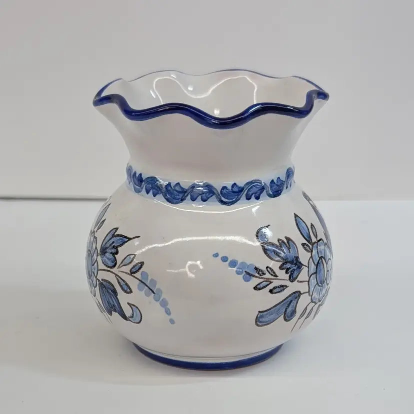 Beautiful, hand painted vase in the style of Nevers pottery with a ruffled top. It has a floral design on each side and blue detailing. In nice, used condition. Measurements ~ 3.25 x 3.25"