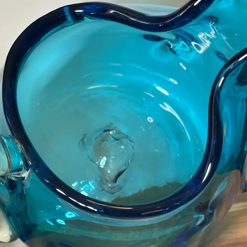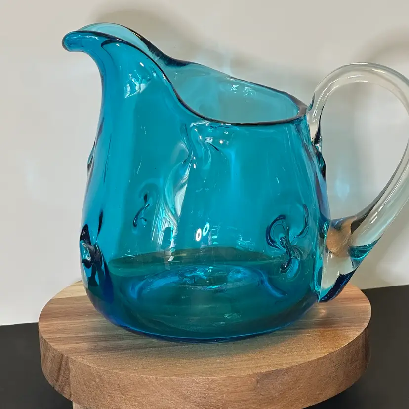 This item is a vintage Bischoff Art Glass pitcher featuring a blue, dimpled, hand-blown design with a clear applied handle. Mid-century modern, hand-blown art glass. Decorative collectible or functional pitcher.