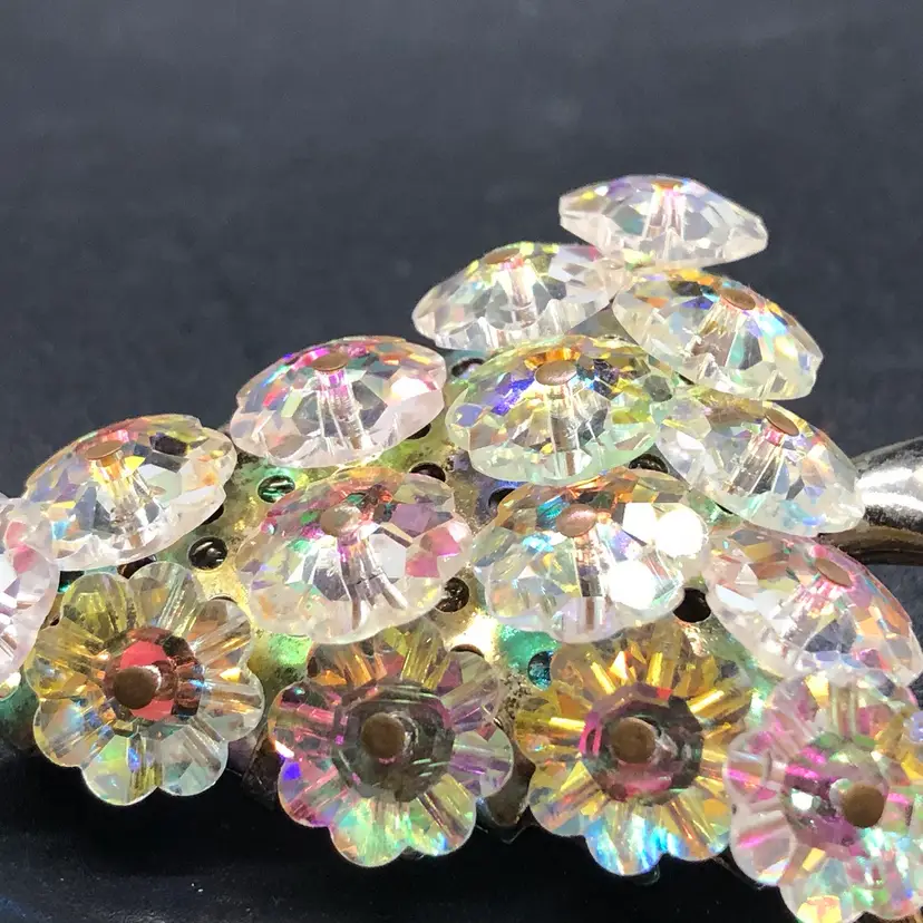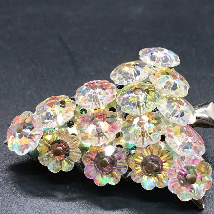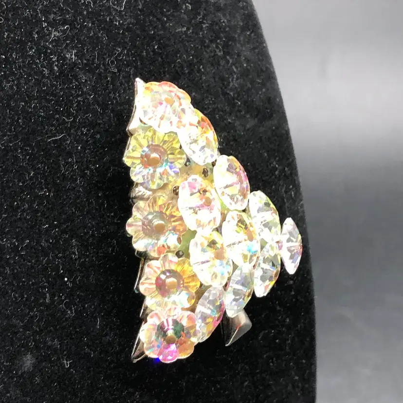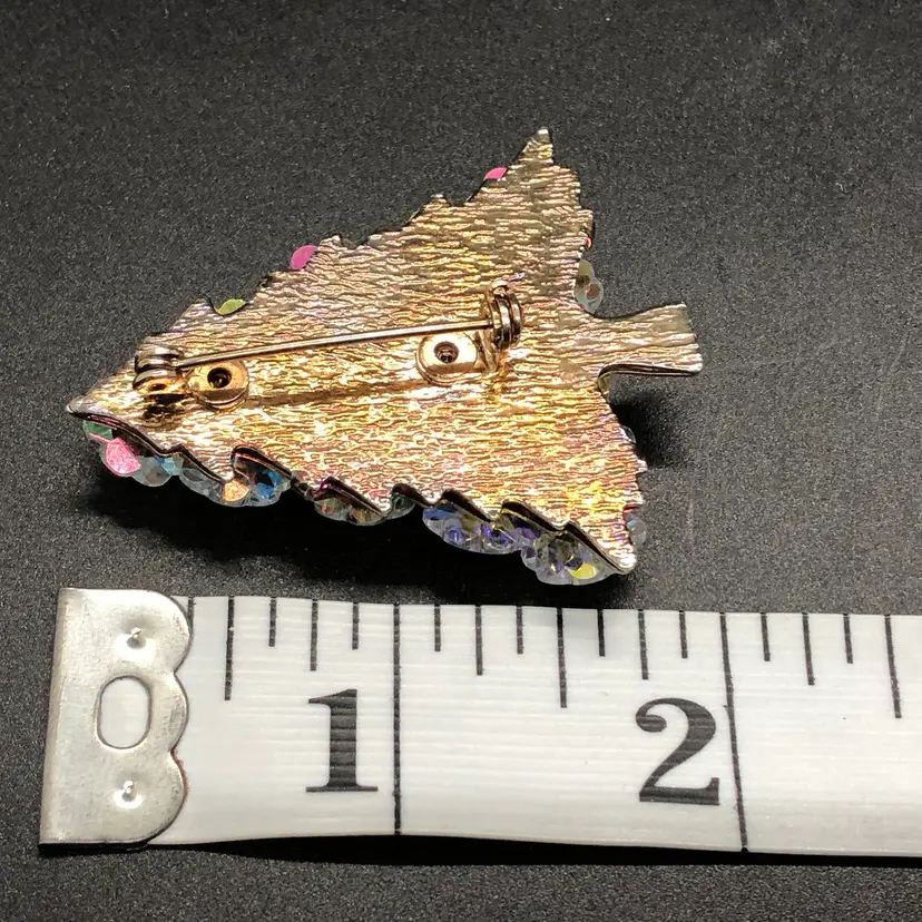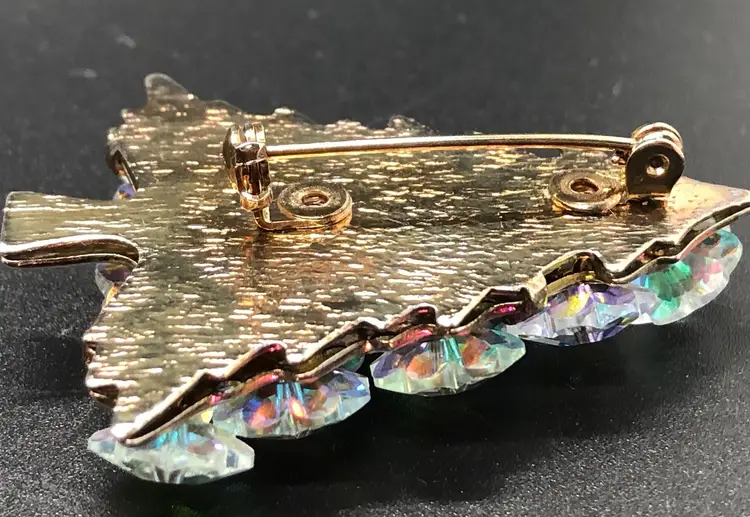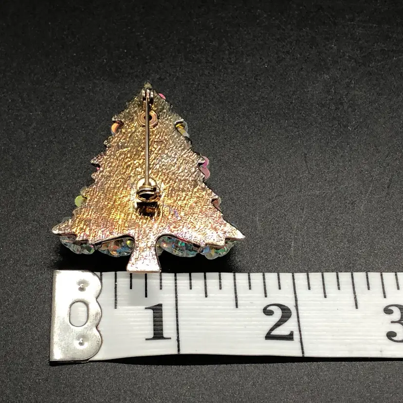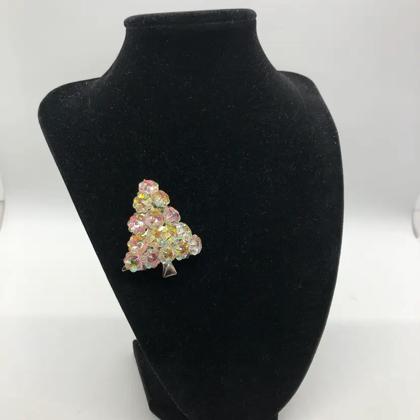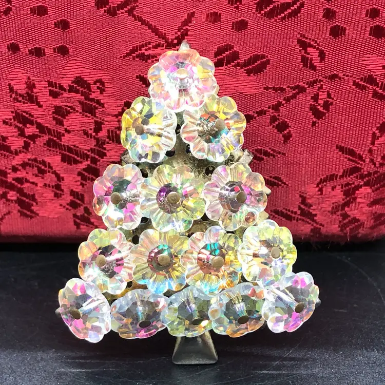 This Vintage AB Crystal Christmas Tree Brooch features a charming design perfect for the holiday season. Made likely of Austrian glass in a multicolor variety, this 2-inch brooch is adorned with crystal accents and a round main stone shape. With a Bohemian theme and signed as likely Austrian, this original piece is a beautiful addition to any fashion department, suitable for both men and women. The vintage nature of this brooch adds a touch of nostalgia and elegance to any outfit, making it a timeless choice for Christmas or any special occasion. Please check photos. Thank you ๐
