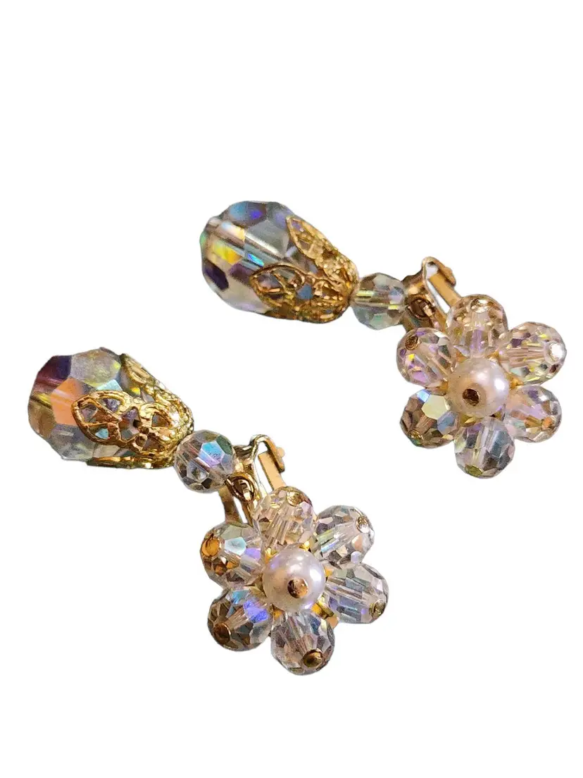 Vintage Ab Crystal Flower Drop Earrings (A1997)