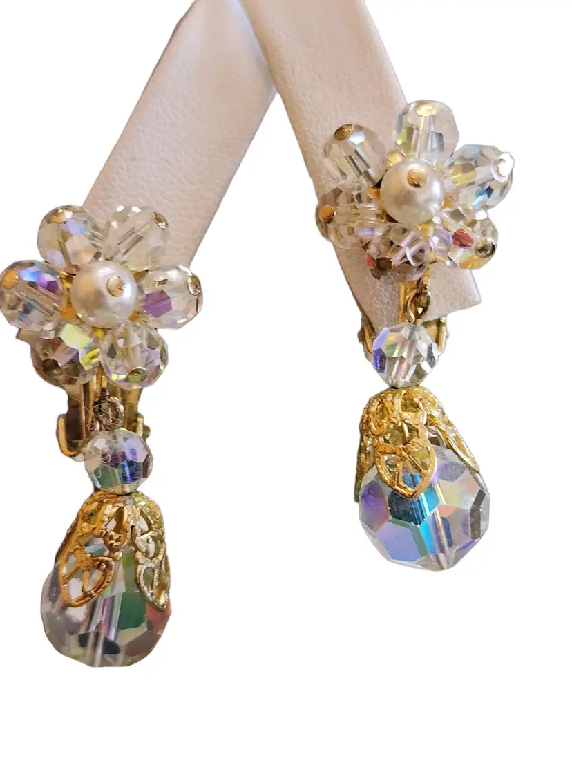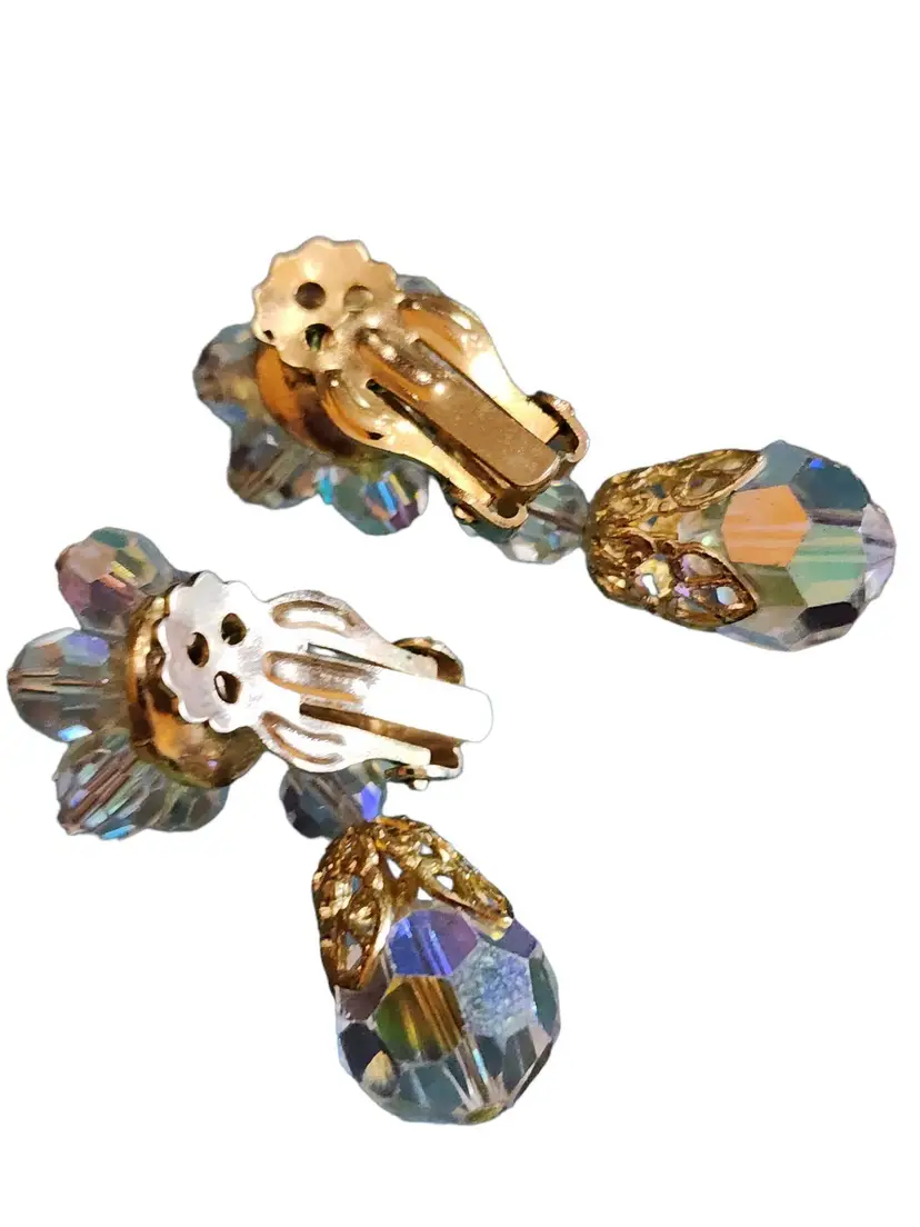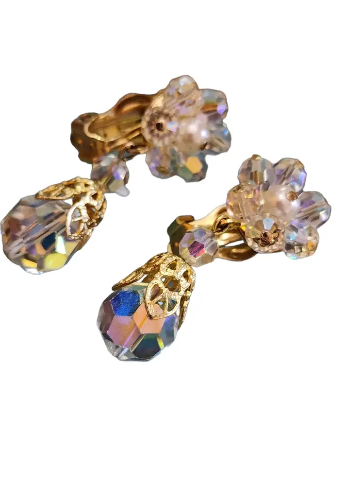 These vintage clip earrings are made of clear Ab crystal beads. It features a flower-shaped base and a crystal drop with gold trim. It has a beautiful crystal, all handwired.
