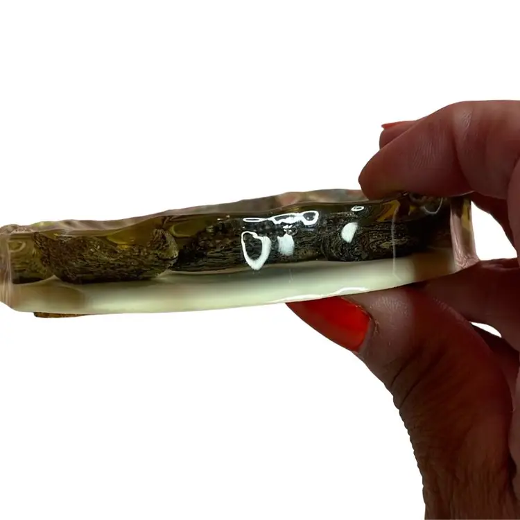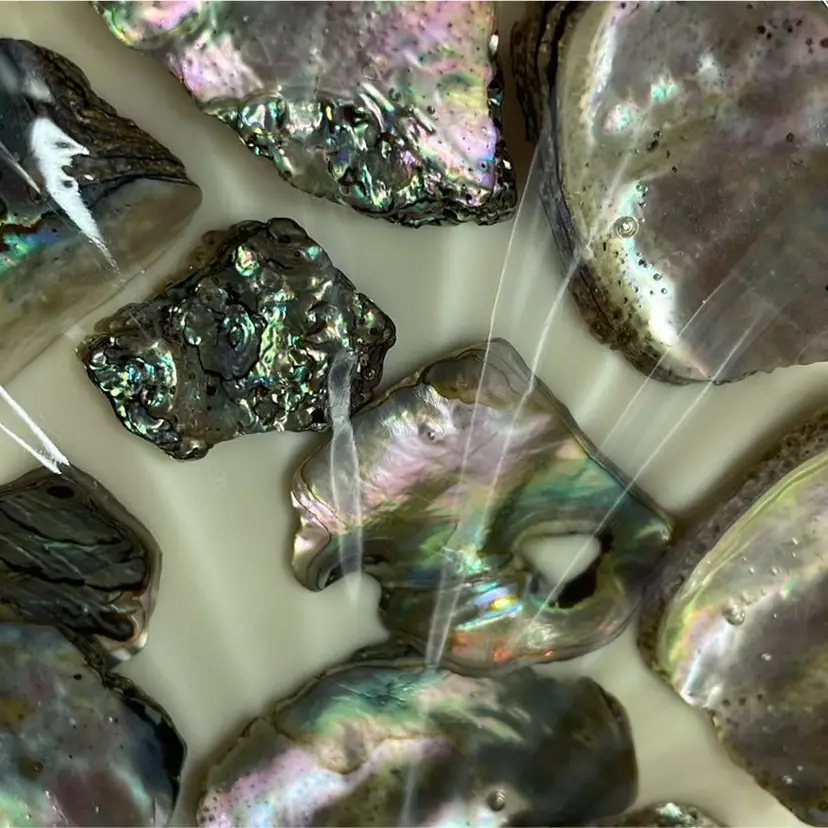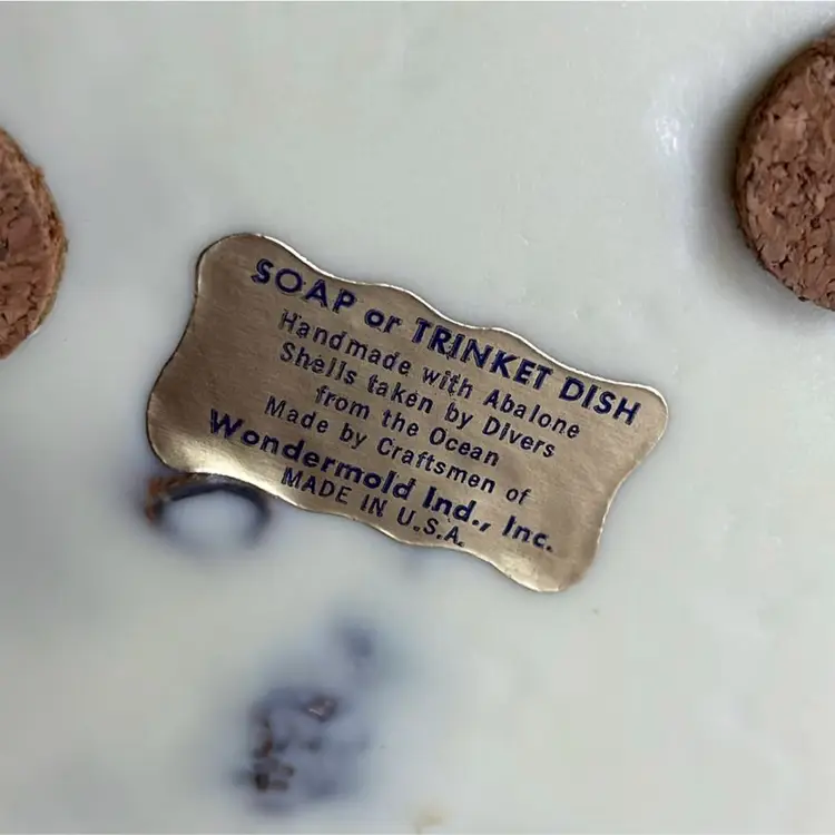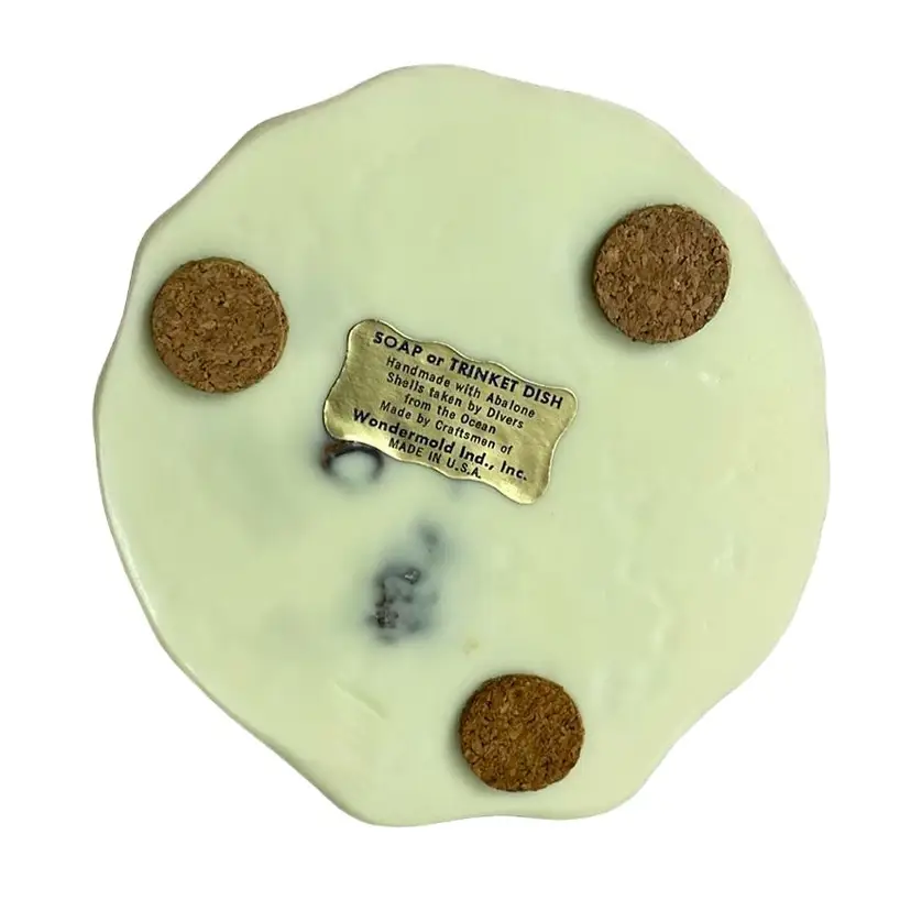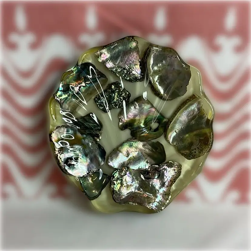 A vintage abalone in resin soap or trinket dish. Off white cream colored base in excellent vintage condition. Measures approximately 4 1/4in in diameter and 3/4in. thick. No cracks, breaks, chips, it is all intact.