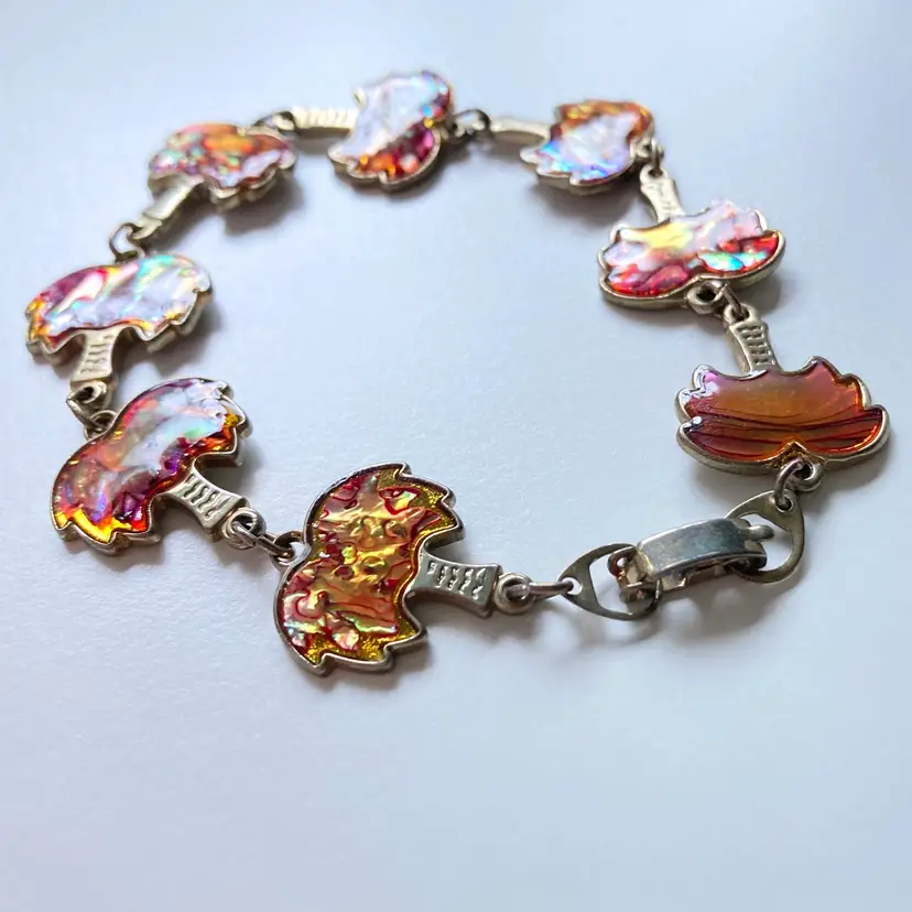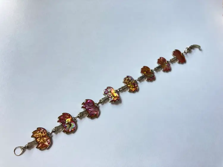 Cool vintage bracelet featuring palm tree links with red/orange/green/pink abalone on each palm.
