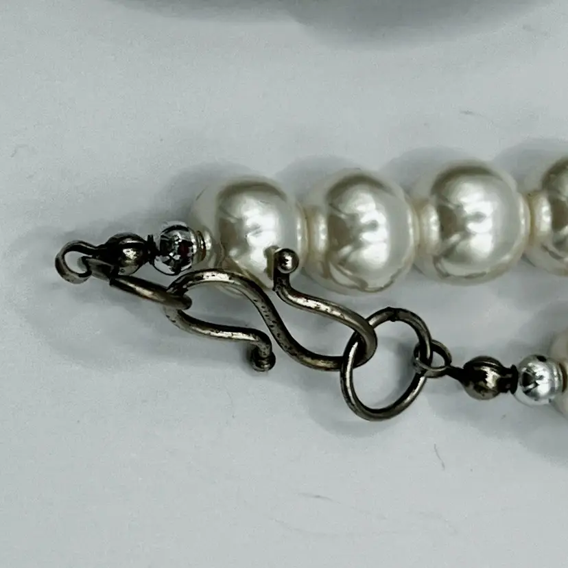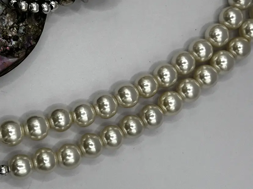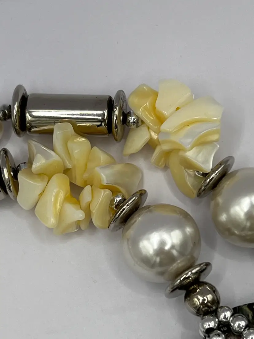 The necklace is made with faux white pearls, ivory tone shell chips, and silver tone barrel beads, disc beads, and seed beads.