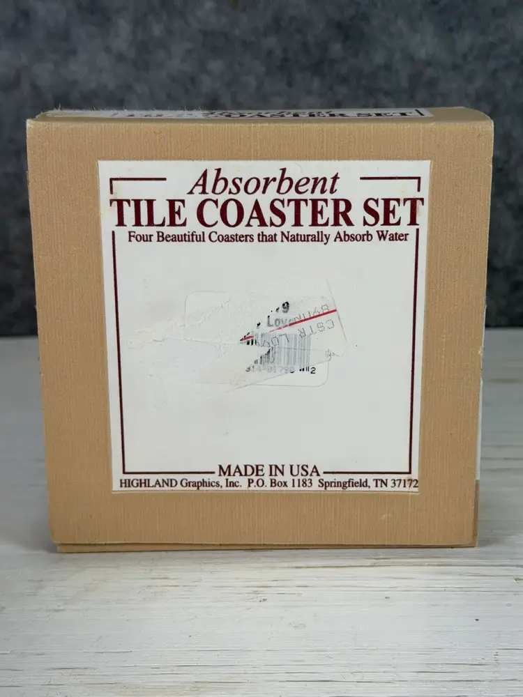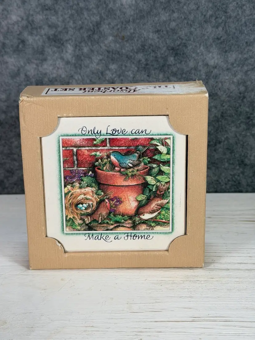✨ Details: • Set of 4 absorbent tile coasters • Made in USA by Highland Graphics, Inc. • Beautiful bird, nest, and garden scene design • Naturally absorbs moisture – functional and decorative • Original box included
