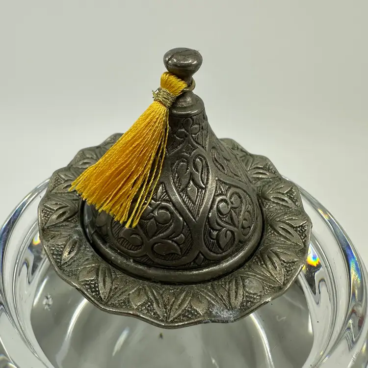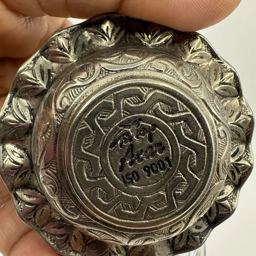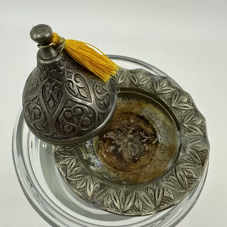 Approx 3” across x 2” tall , some patina and wear due to age and use. Some residue that can be cleaned. Overall good condition.