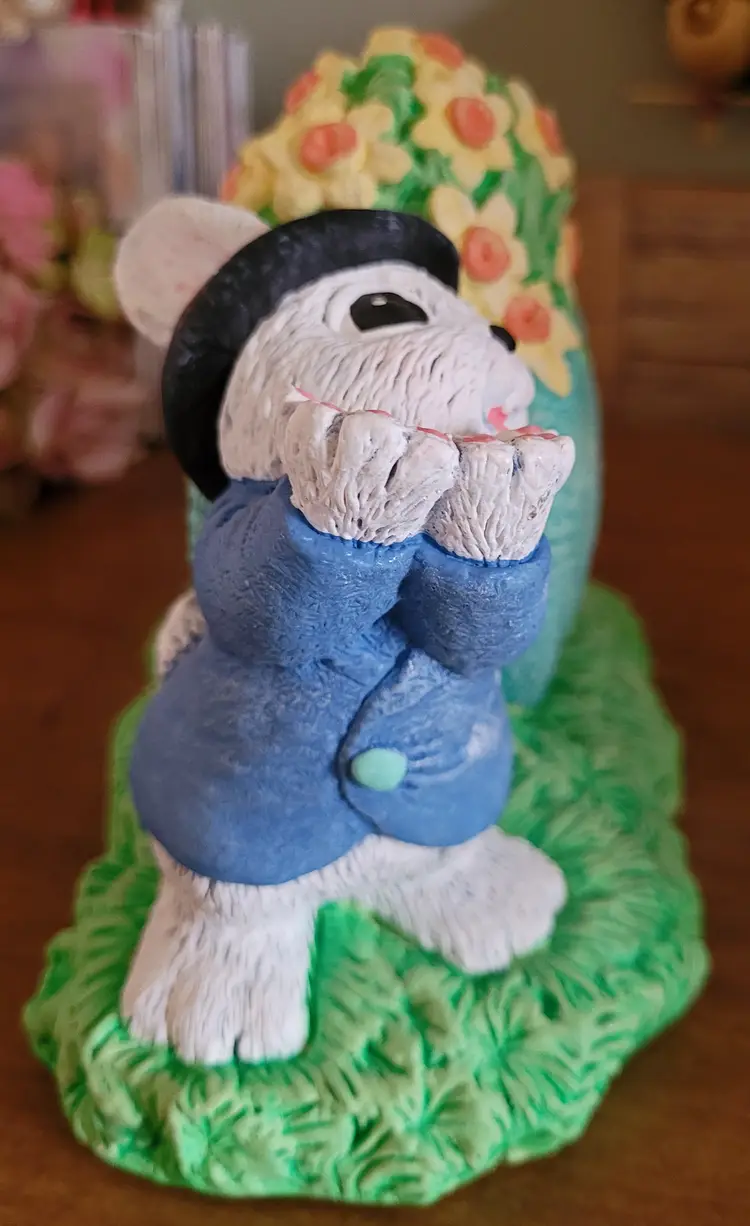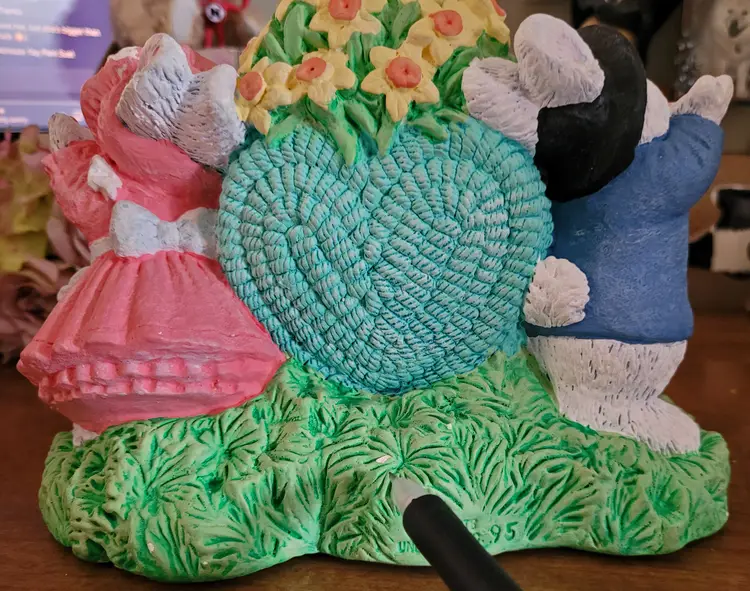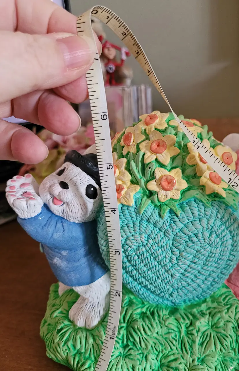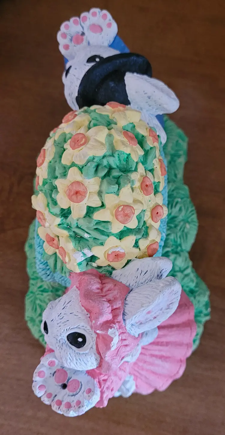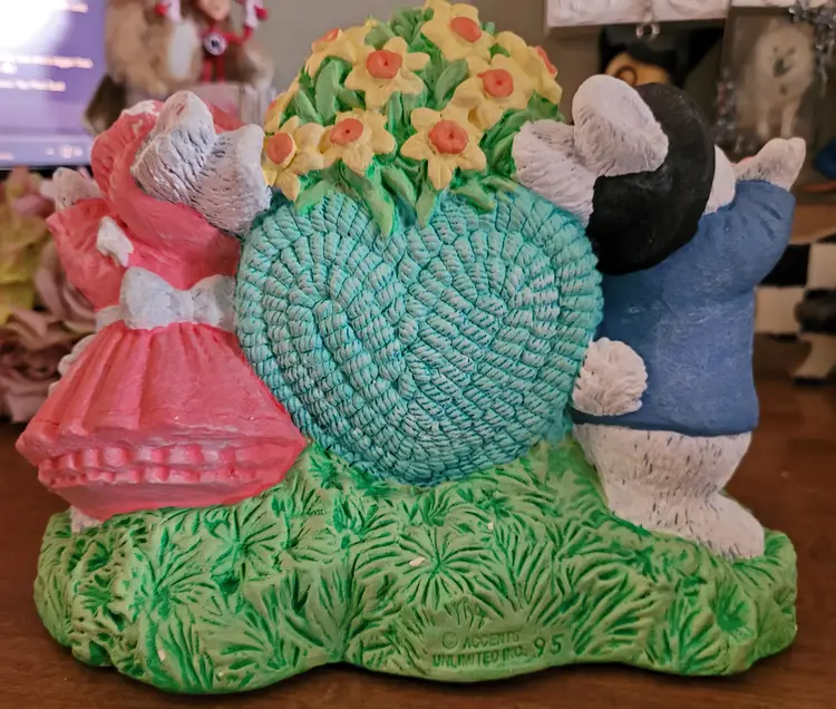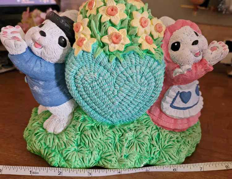 Was a floor sample, because I worked at Michaels in a past life. This is very hefty. As Is: there should be a wore that goes from one bunny's hand up and over the heart to the other bunny's hand. Wire would have had a few ceramic hearts (I think) hanging from it. Also, has some paint worn spots and some paint chippage. (If the wire ever shows up I will send it your way.) From a smoke free home, please refer to the pictures for its condition and size. Approx: 7.5x6x4.5
